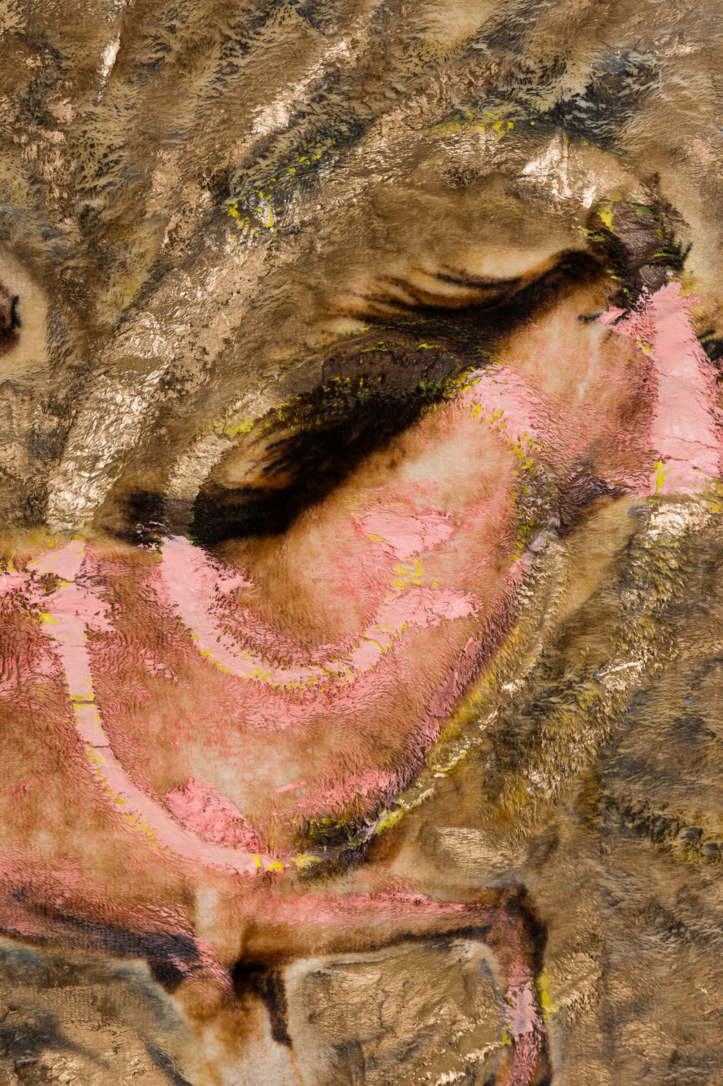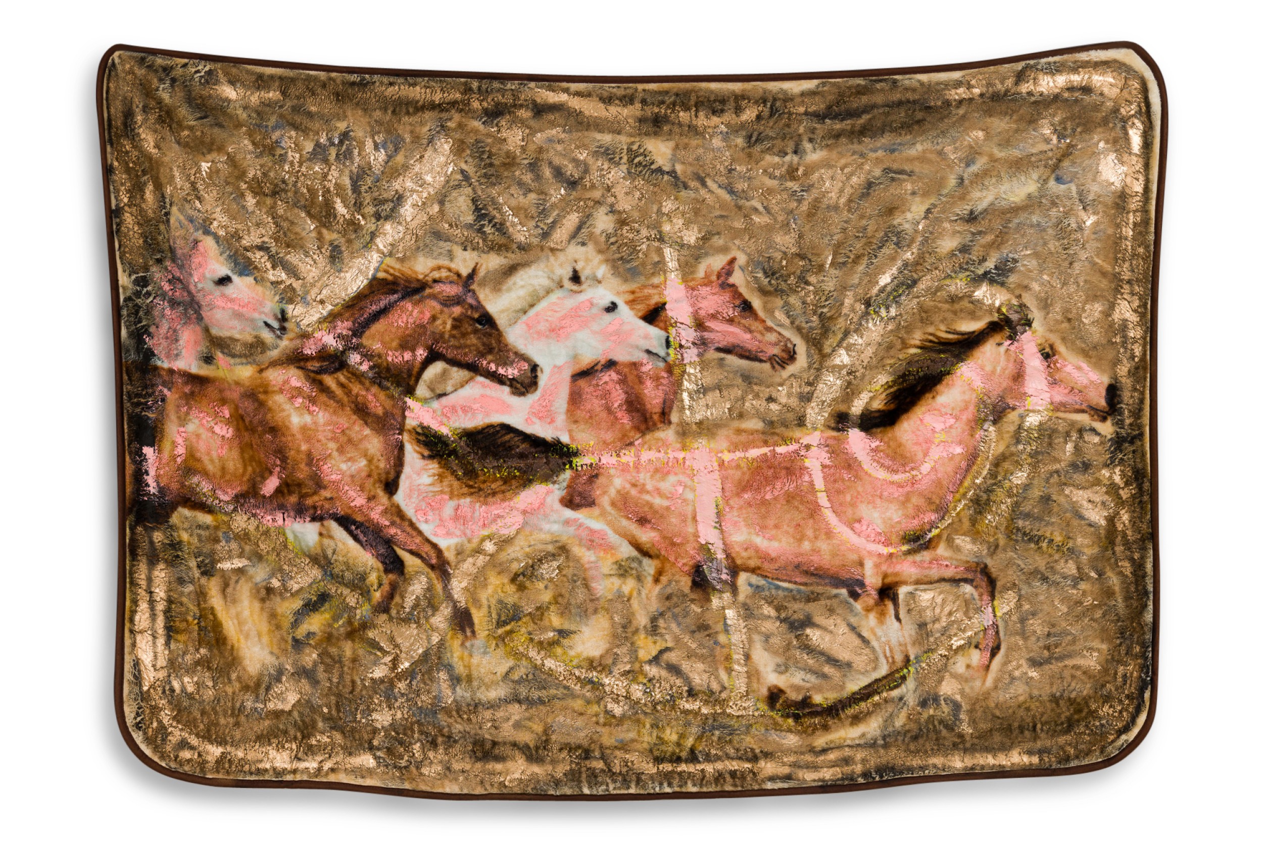 American Contemporary Readymade Artwork of a dye sublimated fleece horse blanket modified with gold and pink acrylic paint and enamel (Signed Verso: GORDON HOLDEN)