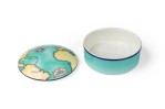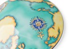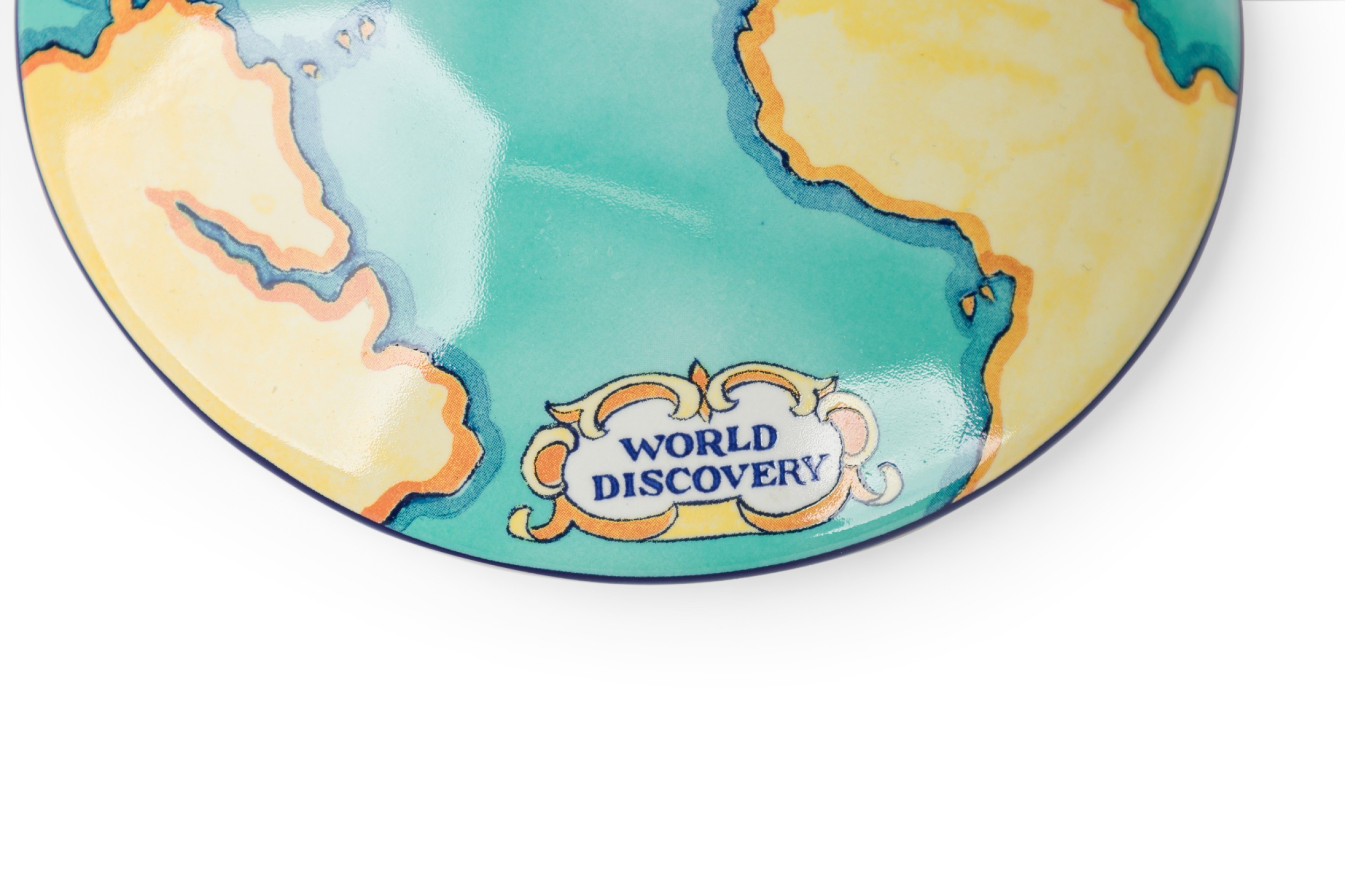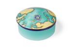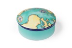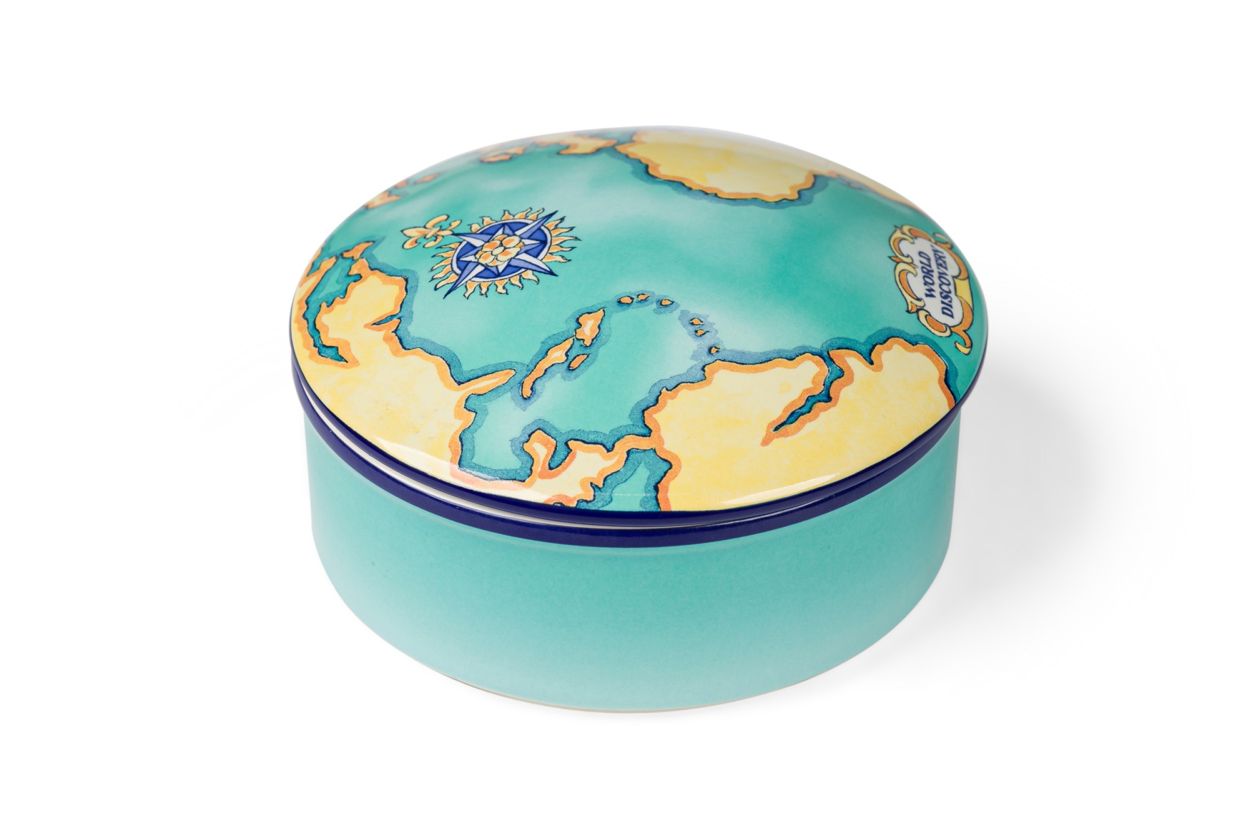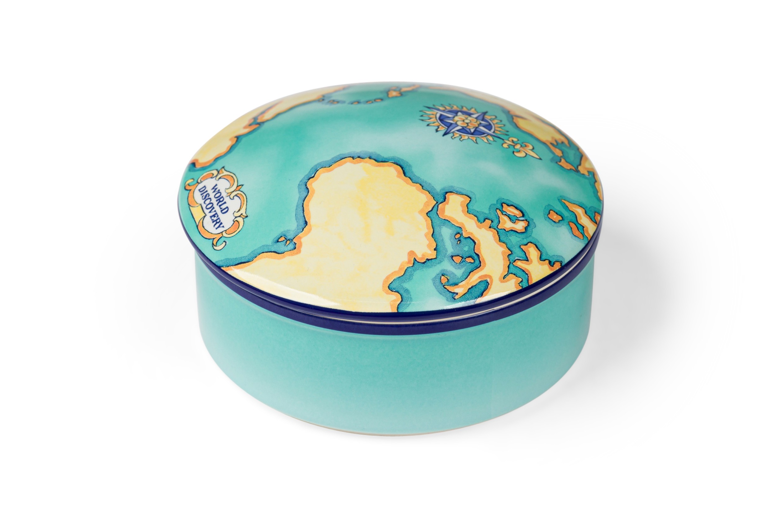 American Contemporary round blue ceramic world discovery trinket box featuring a map design over a domed lid (TIFFANY & CO FOR TAUCK).