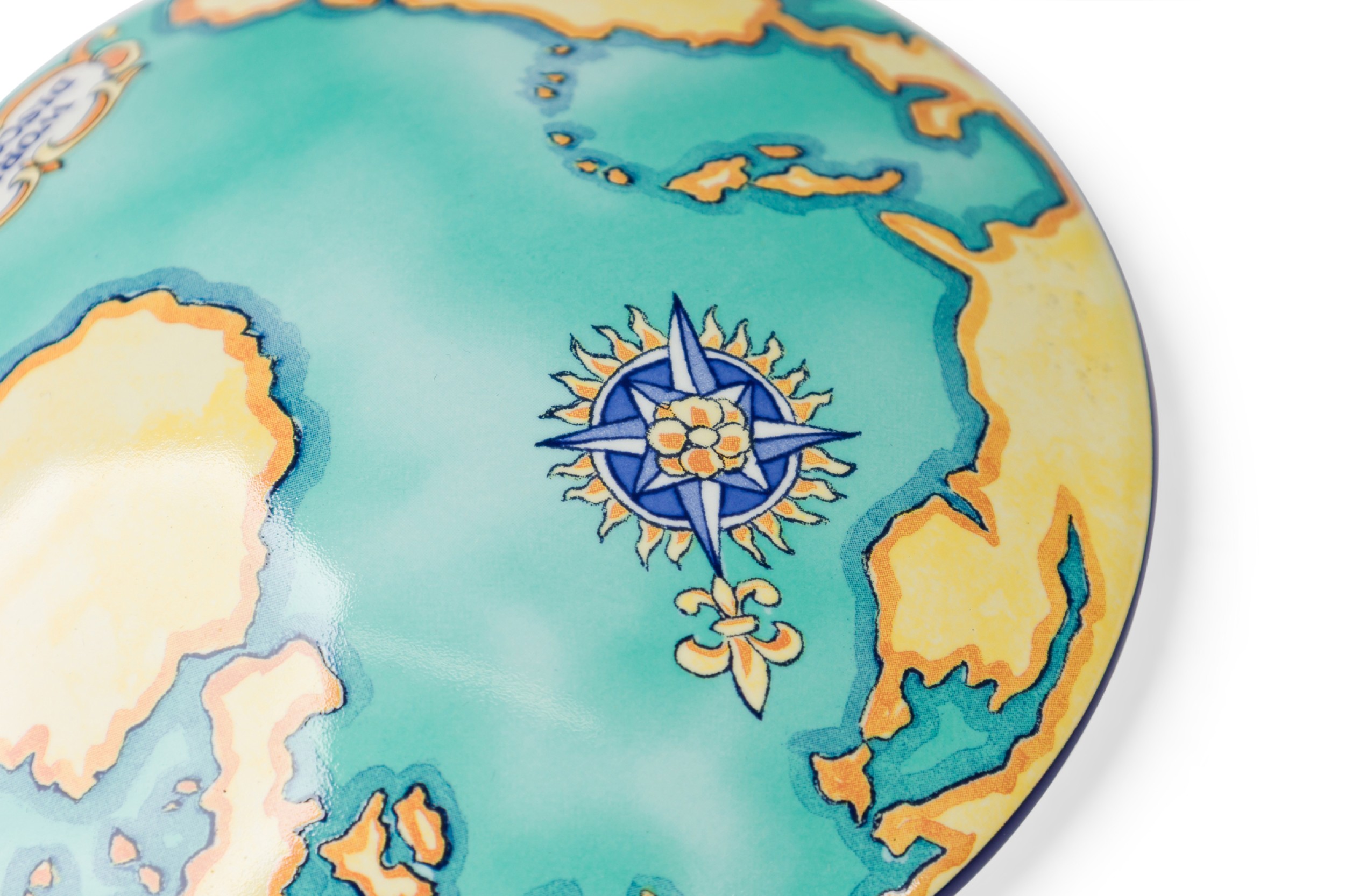 American Contemporary round blue ceramic world discovery trinket box featuring a map design over a domed lid (TIFFANY & CO FOR TAUCK)