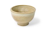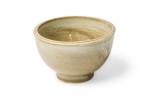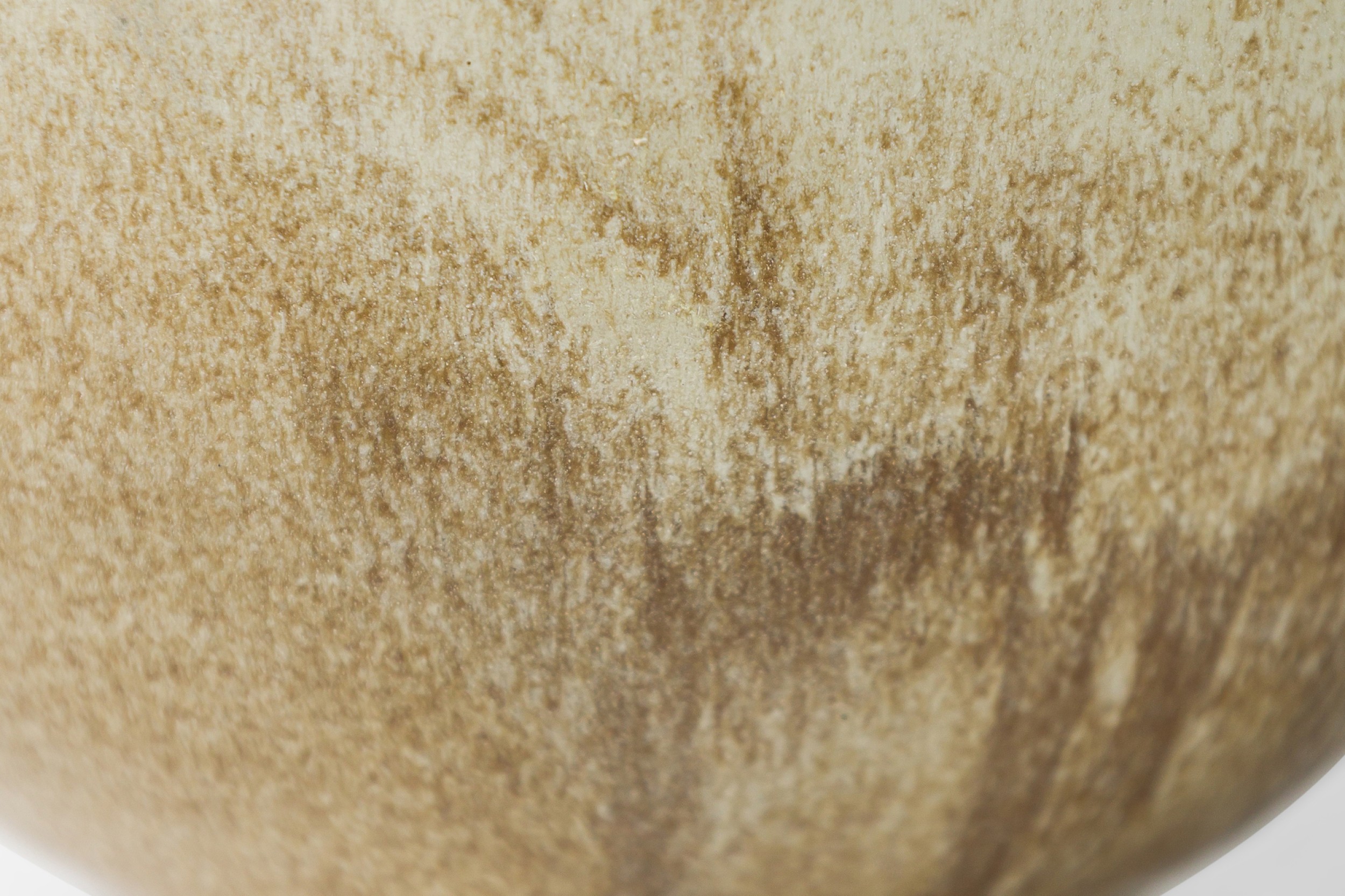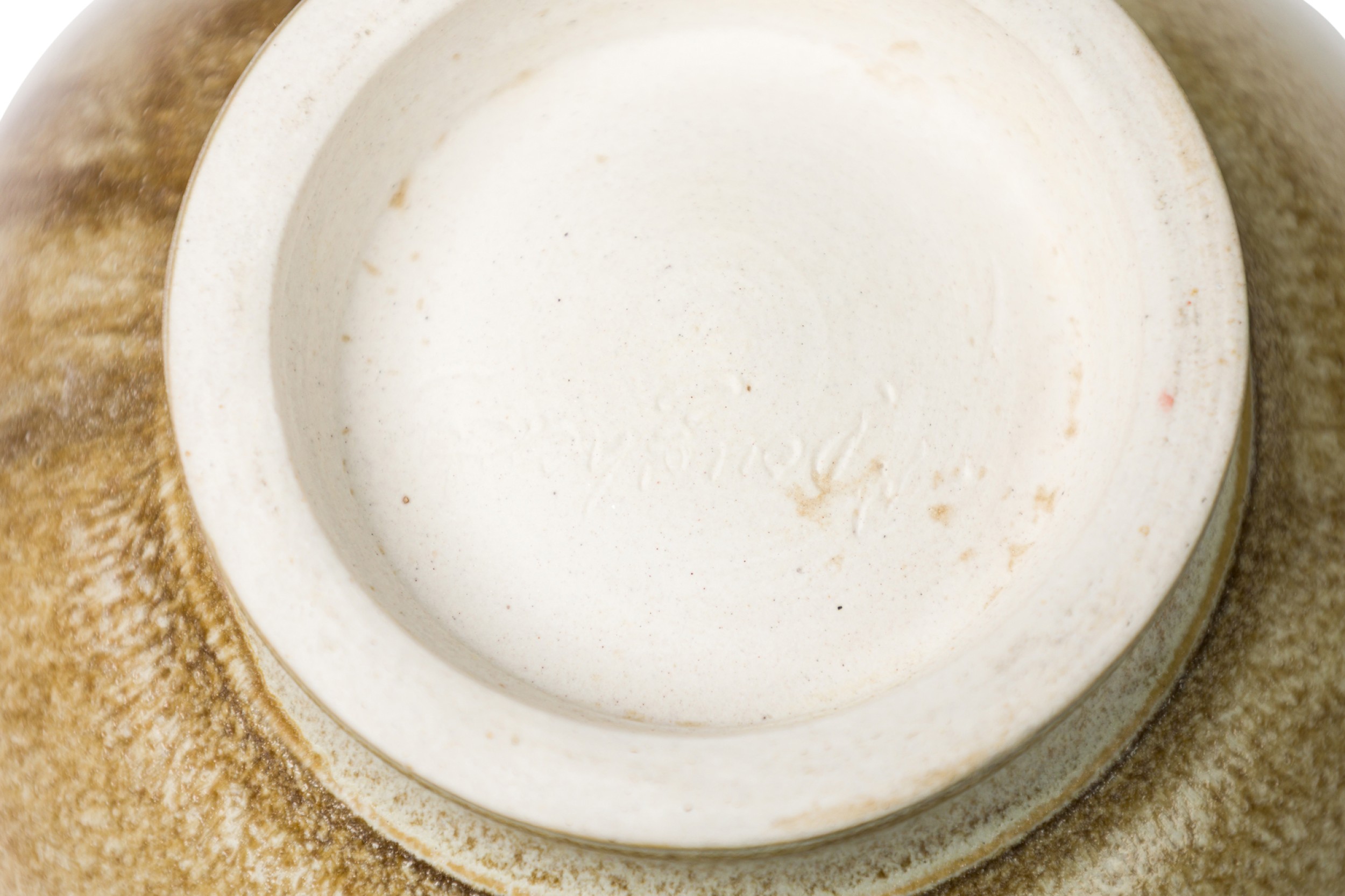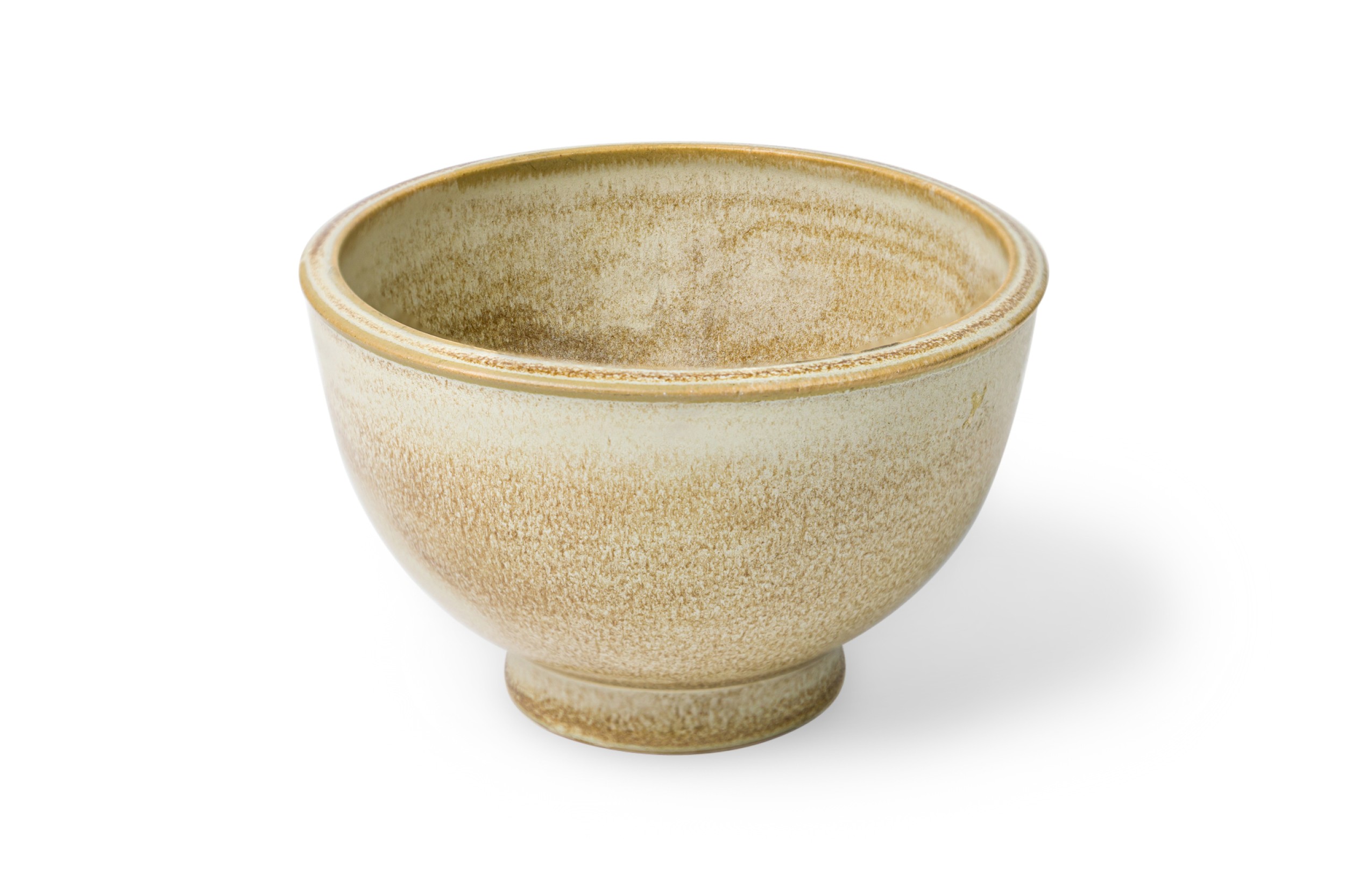 American Contemporary brown/beige earthen toned light to dark shaded stoneware bowl with a raised circular base (inscribed on base).