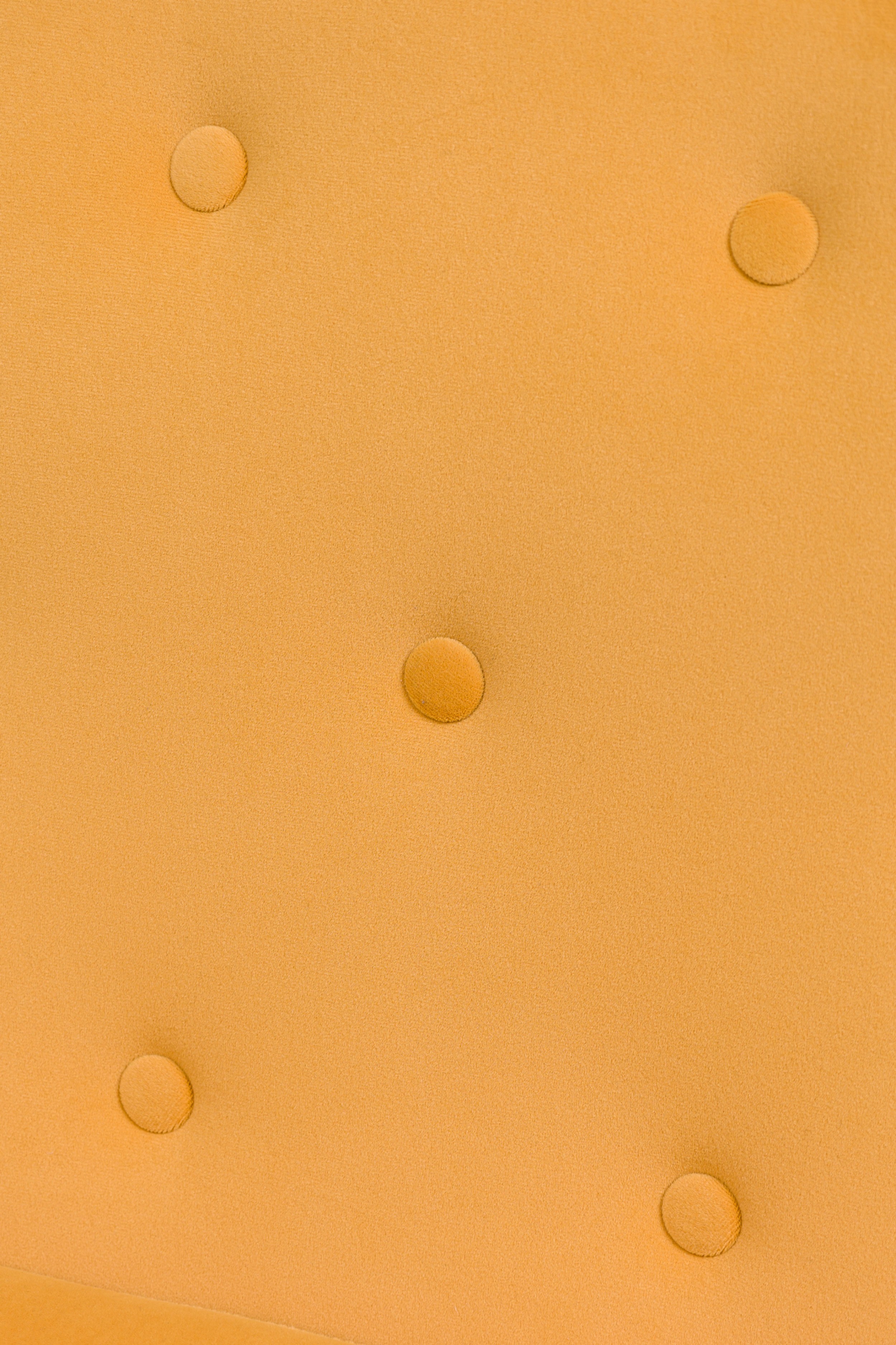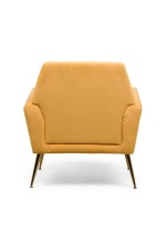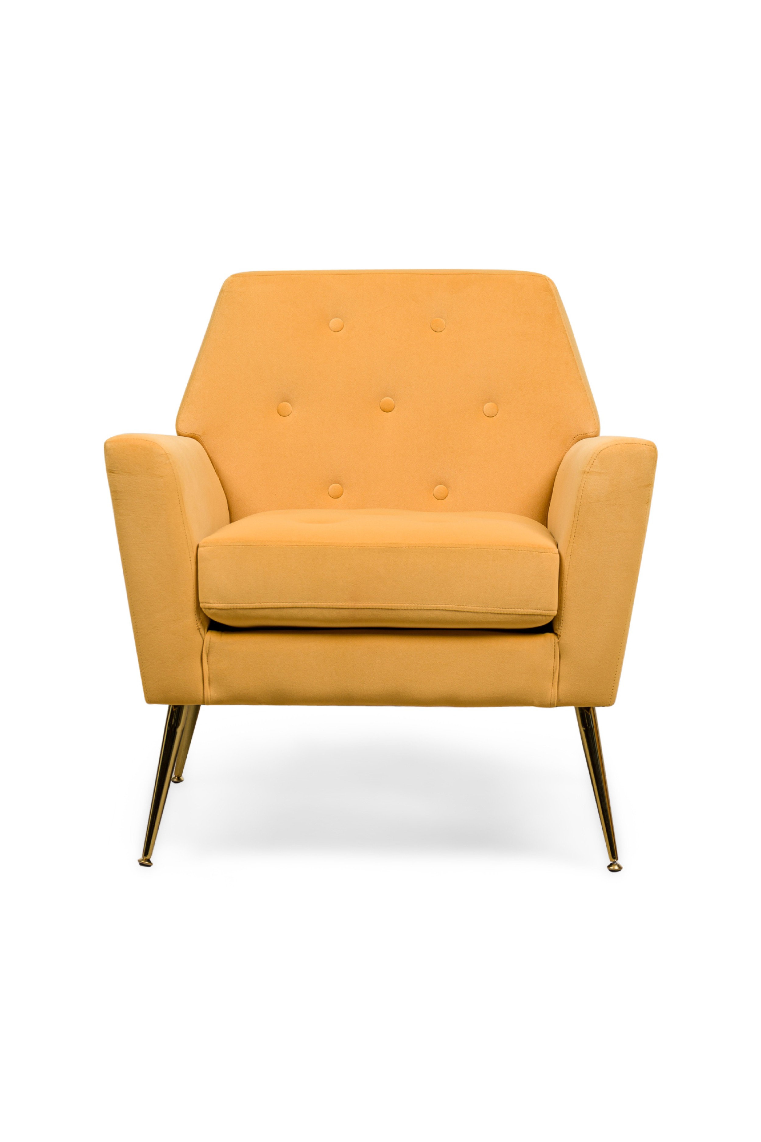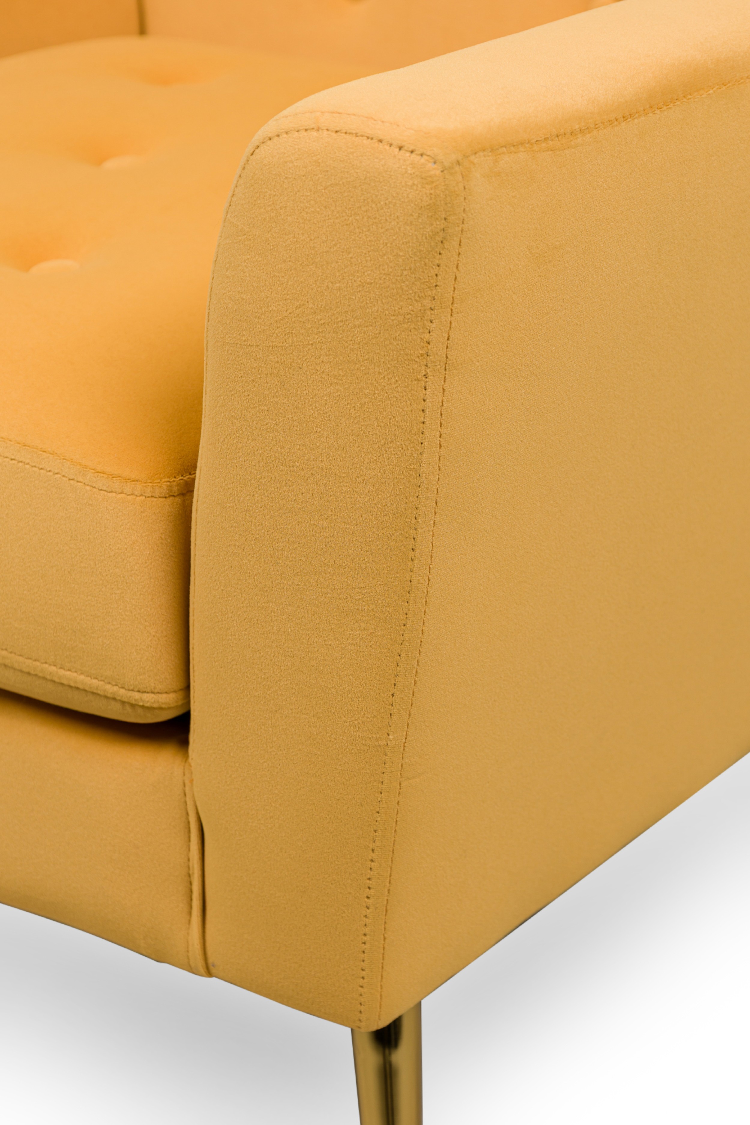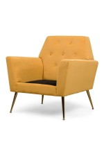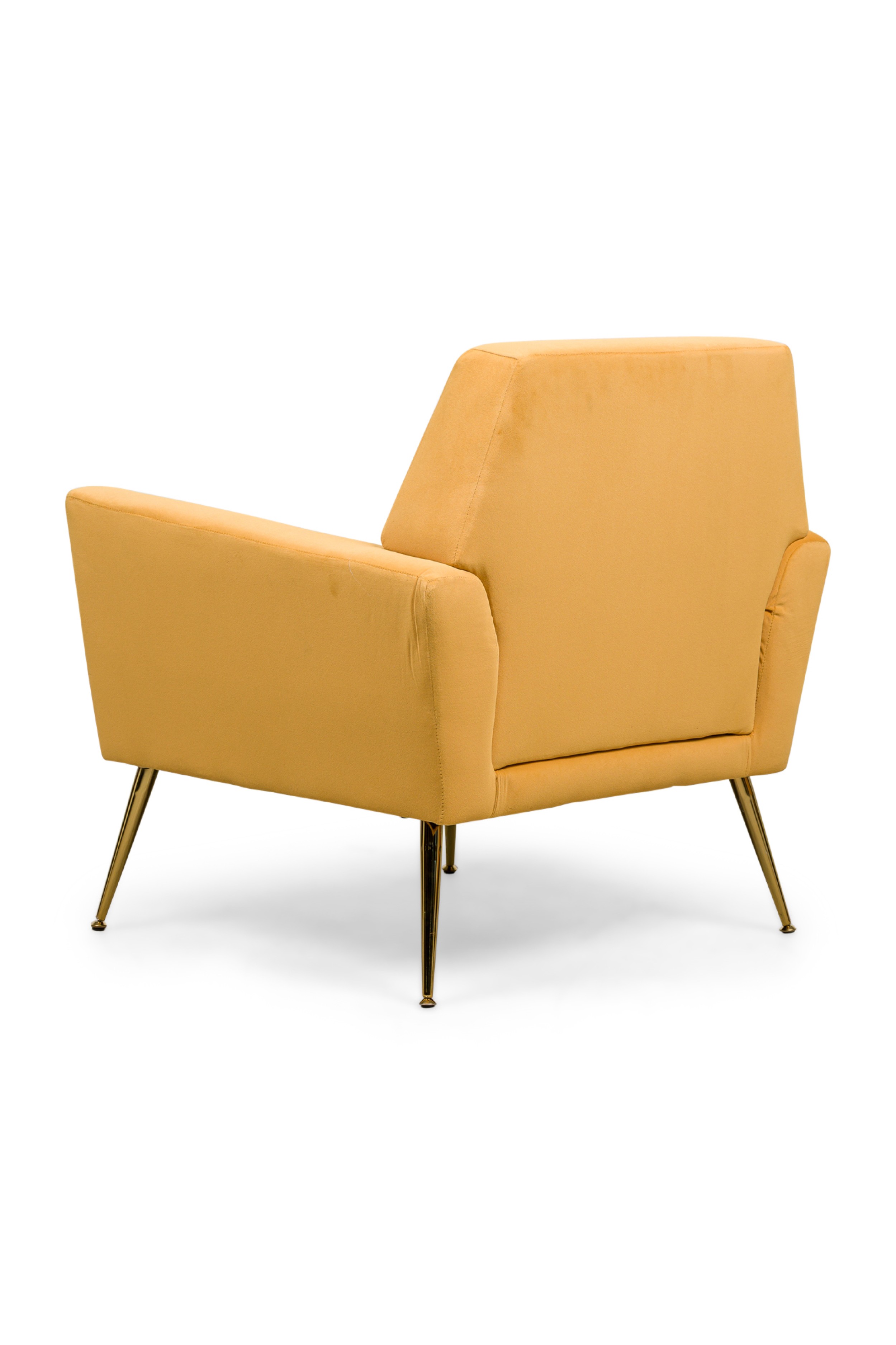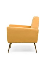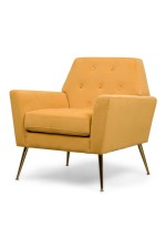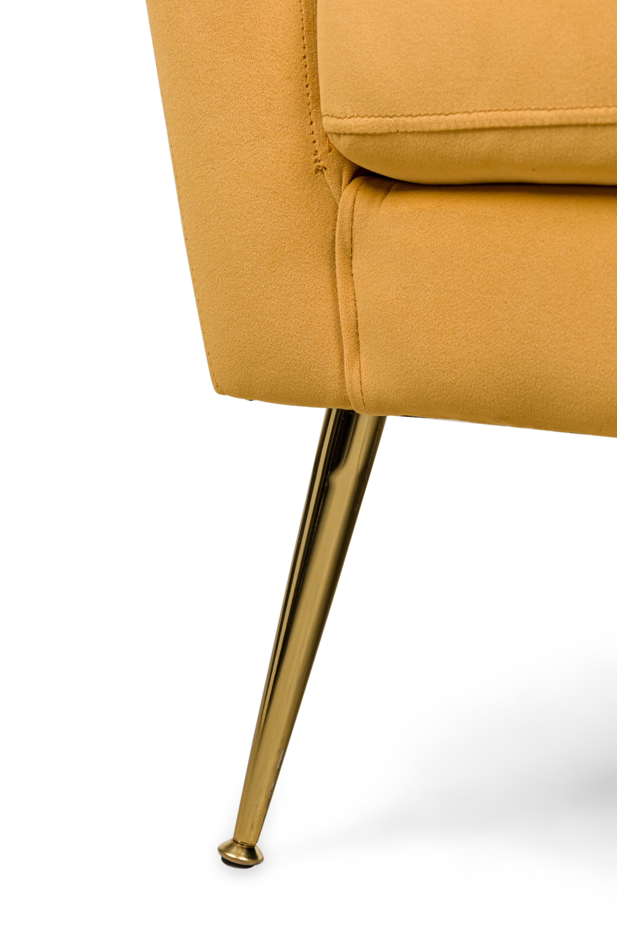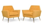 PAIR of American Contemporary chairs with mustard yellow velvet upholstery with a seat cushion, ending on outward and tapered metal legs with gold finish (PRICED AS PAIR)