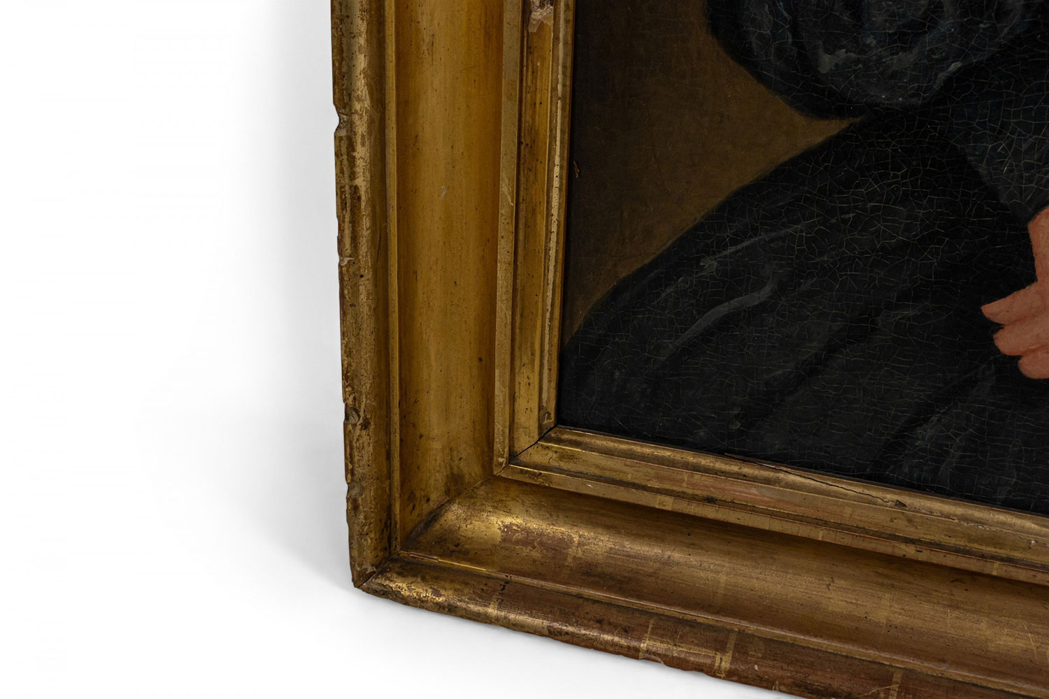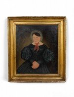 American Country Primitive (18/19th Cent) oil painting of a woman wearing a black dress & a bonnet with a red bow in a gilt frame (relined canvas).