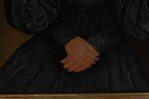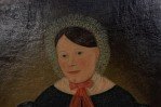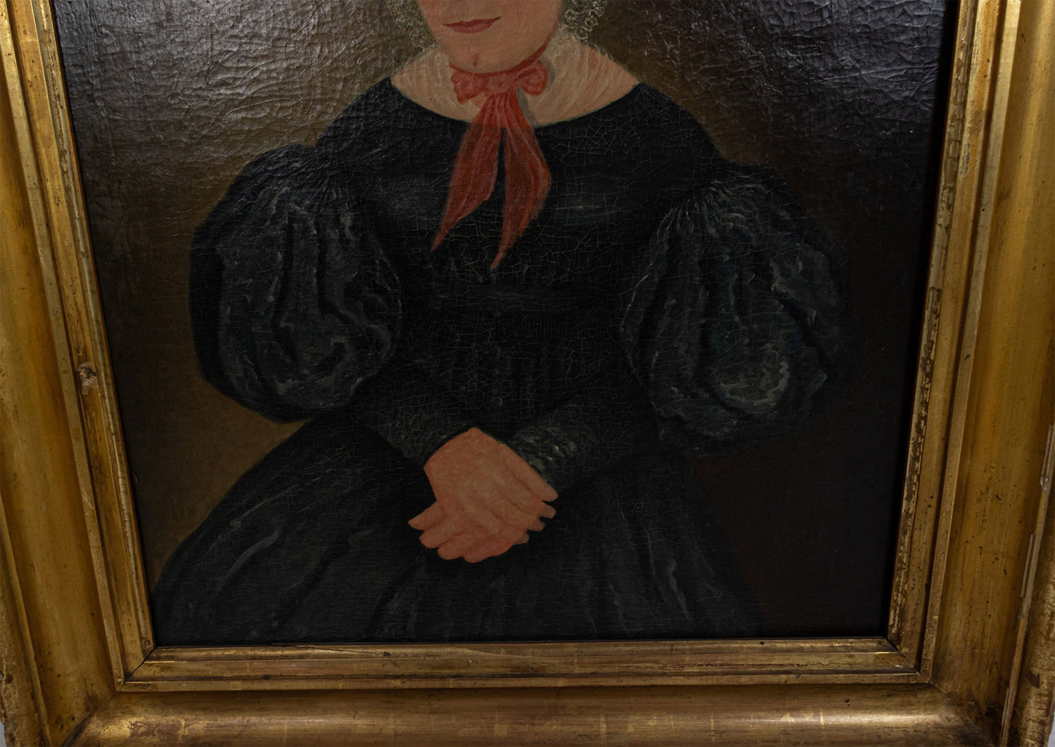 American Country Primitive (18/19th Cent) oil painting of a woman wearing a black dress & a bonnet with a red bow in a gilt frame (relined canvas)