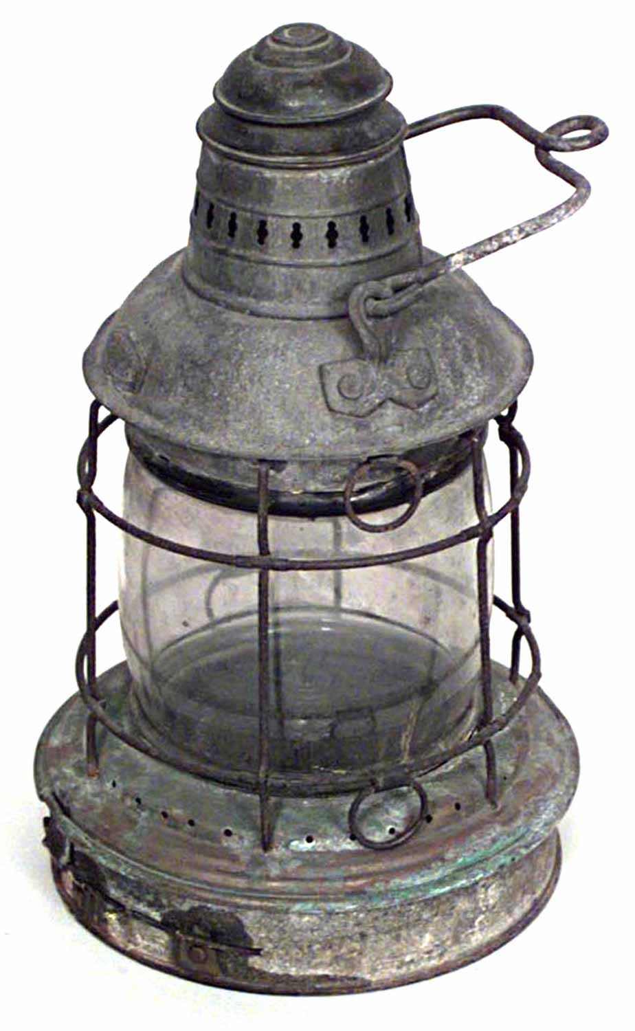 American Country (19th Century) large iron and glass ship embarkment lantern with scroll handle..