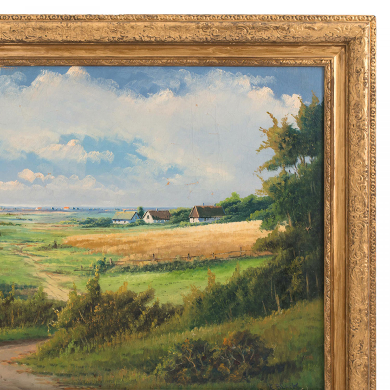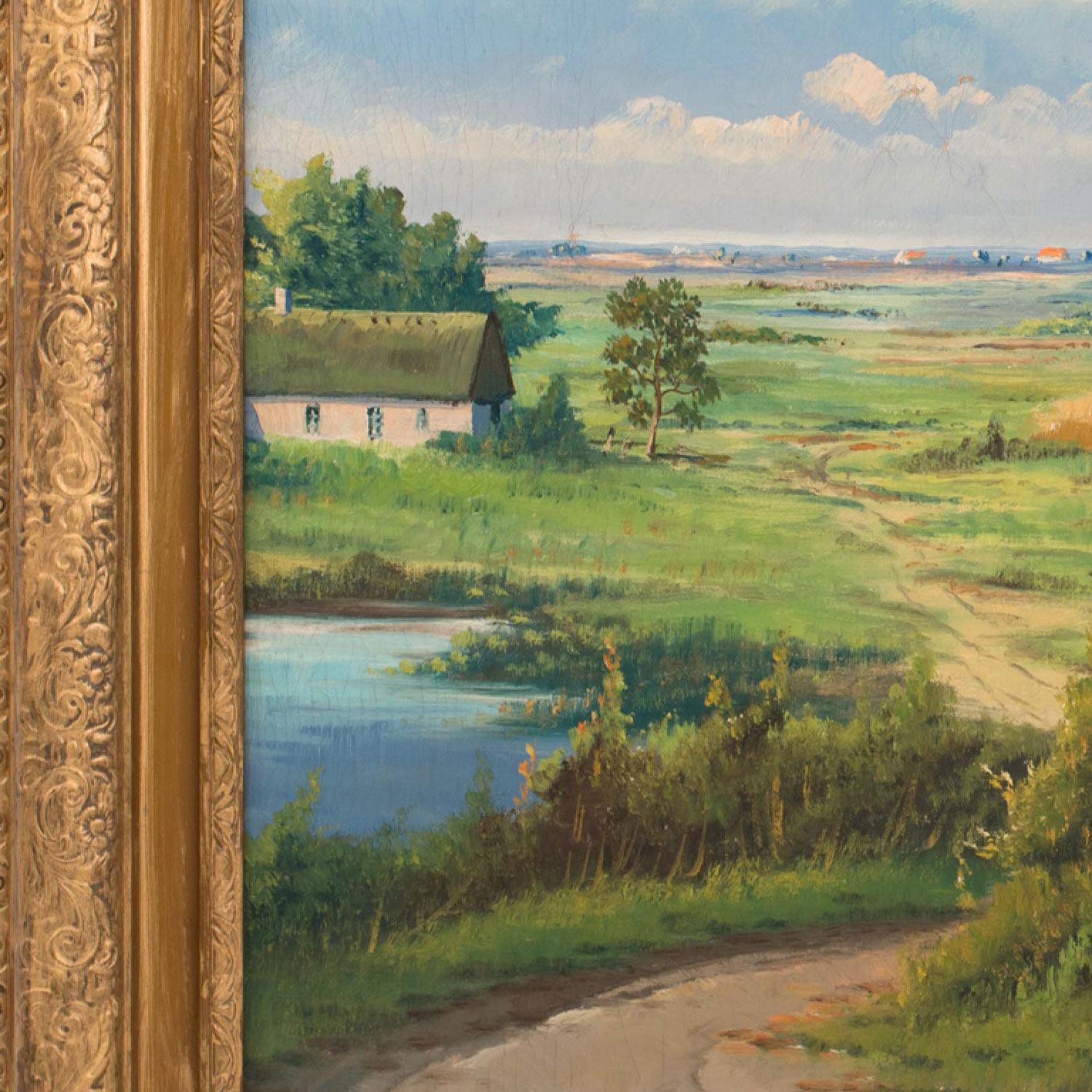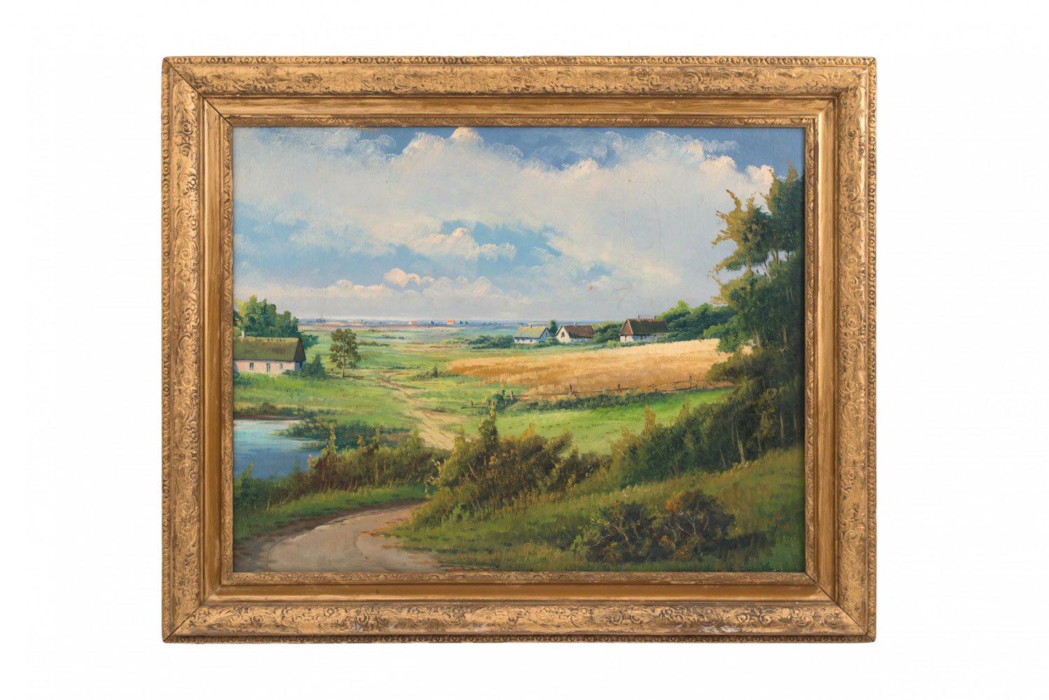 American Country oil painting of a summer landscape in a carved rectangular gilt wood frame (signed E. BLACK)