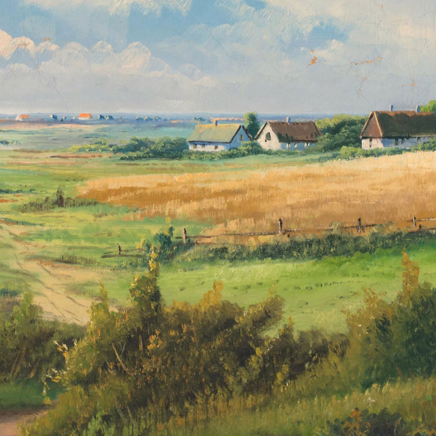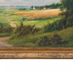 American Country oil painting of a summer landscape in a carved rectangular gilt wood frame (signed E. BLACK).