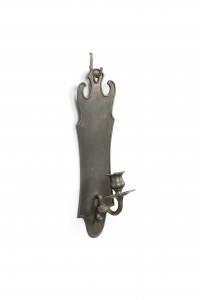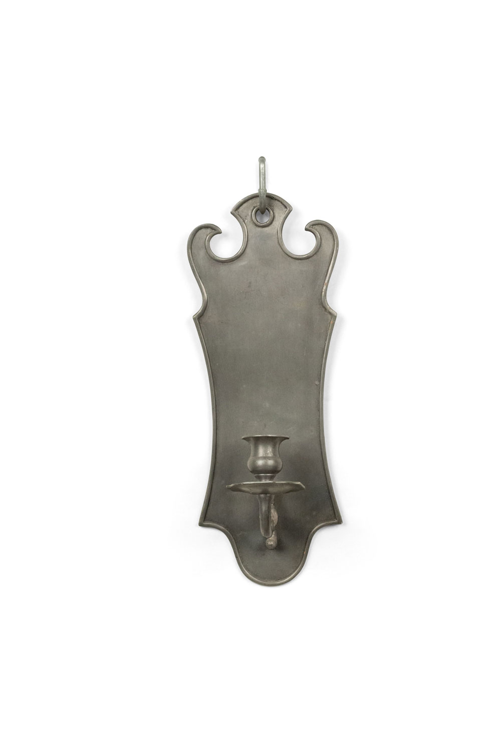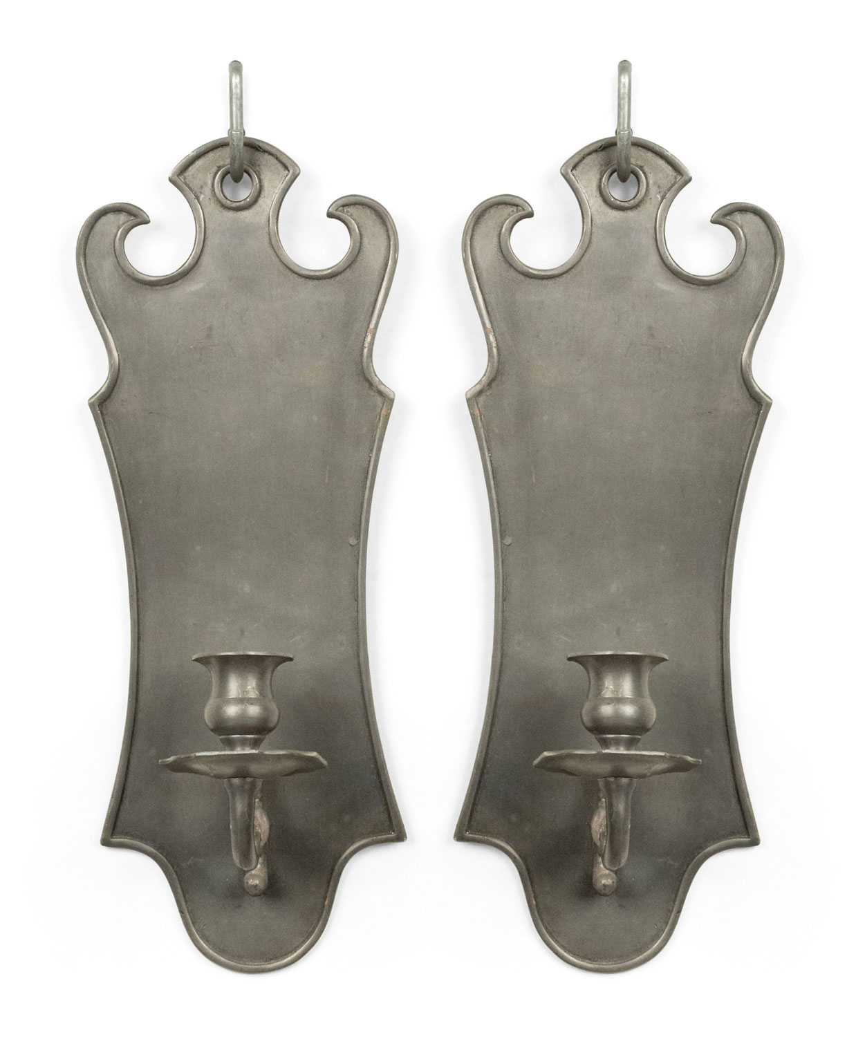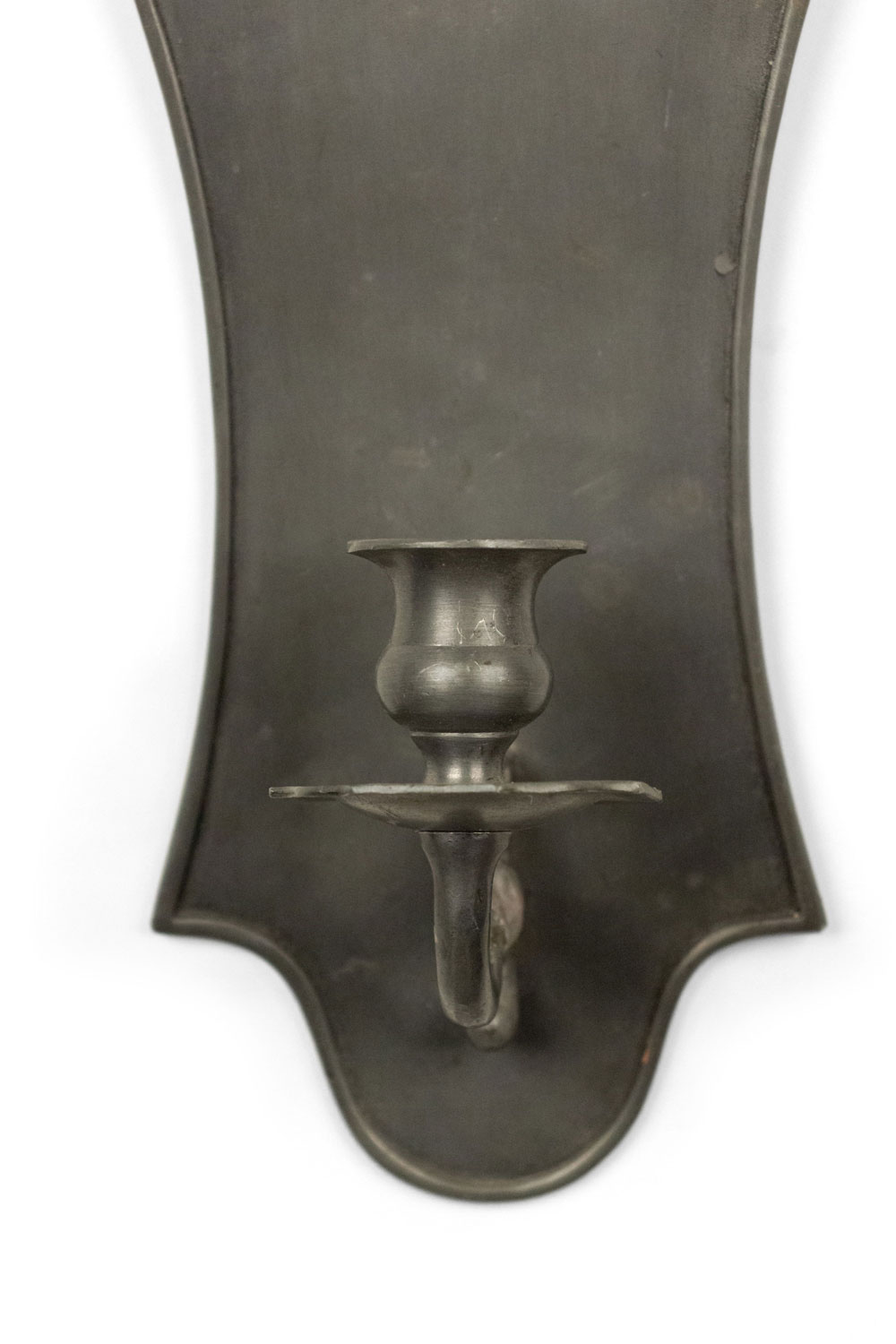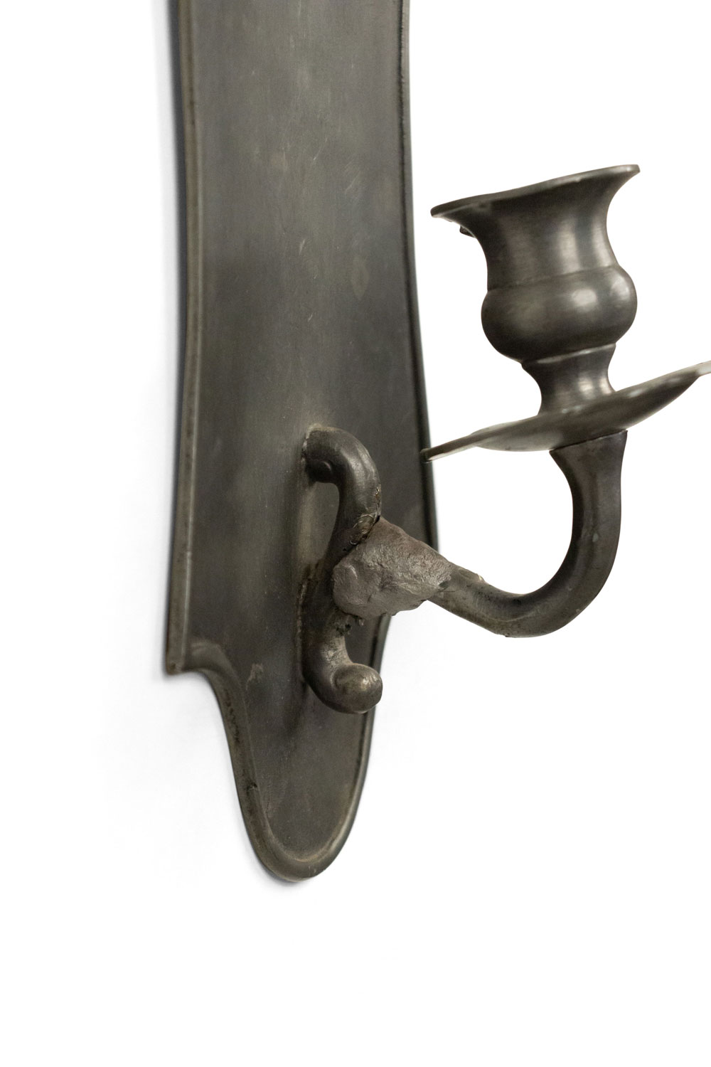 PAIR of American Country pewter wall sconces with single arms and pediment tops. (PRICED AS PAIR)