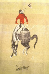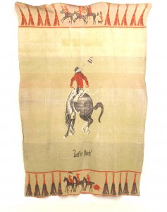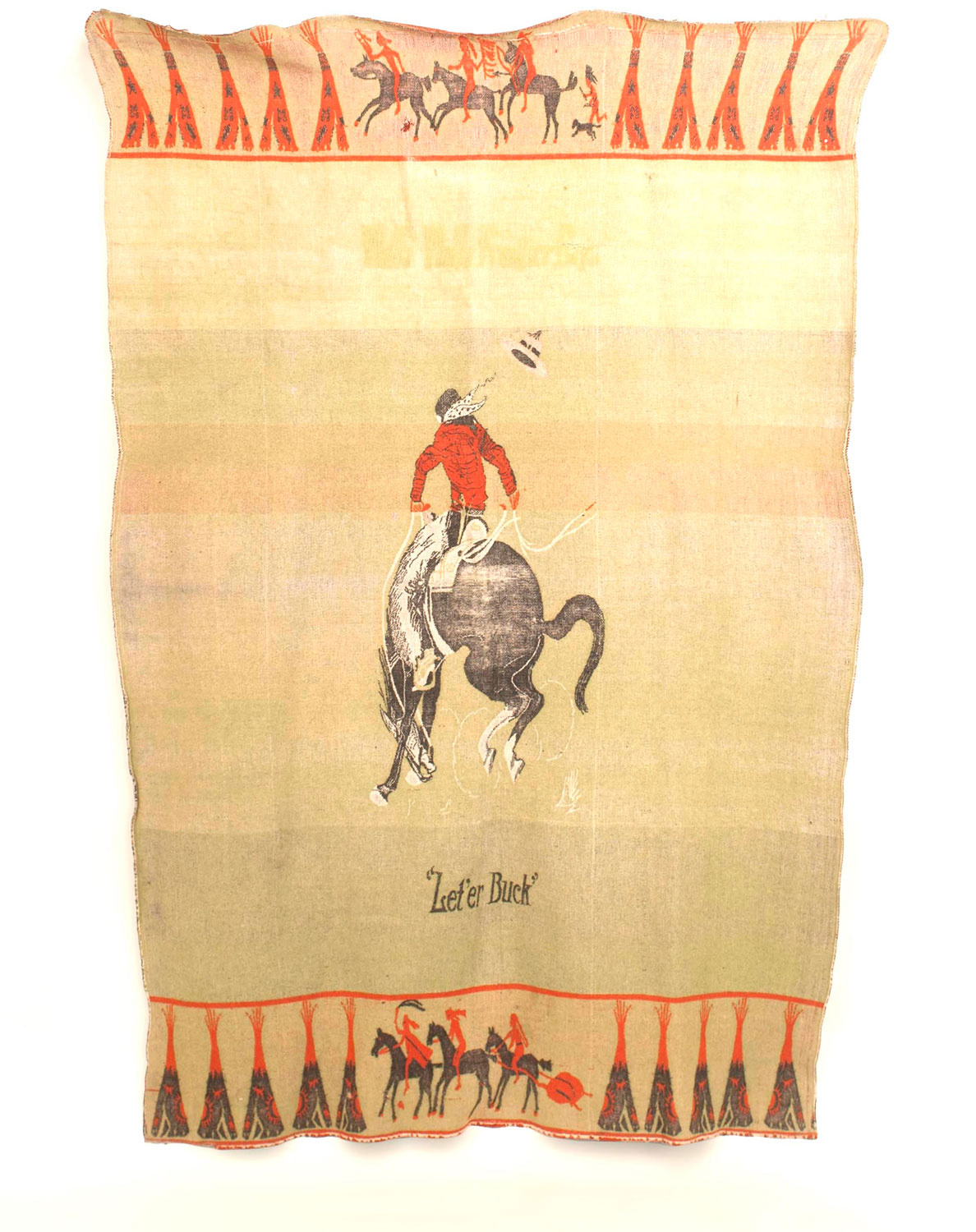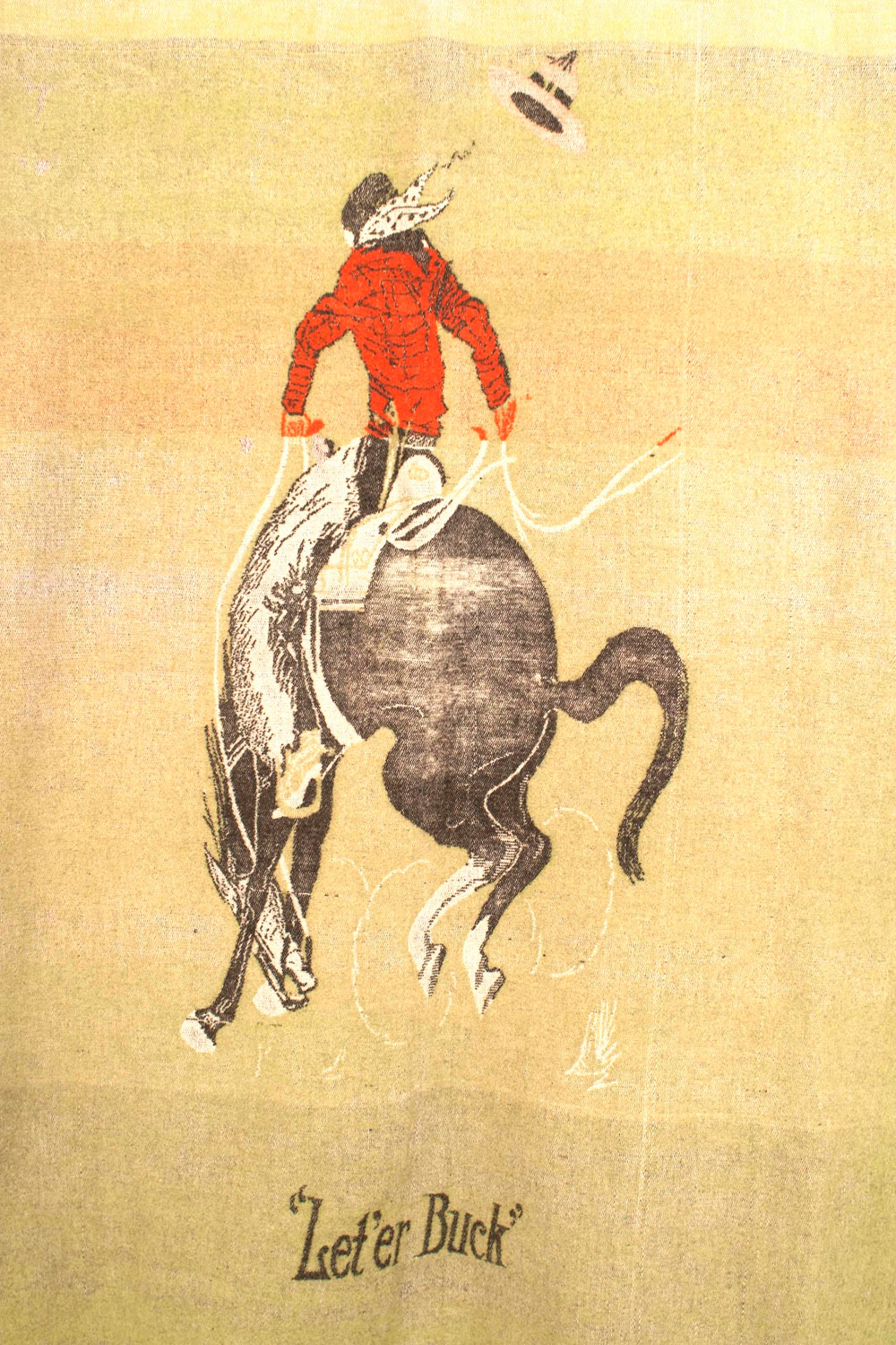 American Country Rustic Western style green wall hanging with a scene of a cowboy riding a horse with Indian and other Western motifs titled "Let r buck" (top of hanging is ripped)