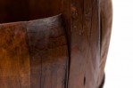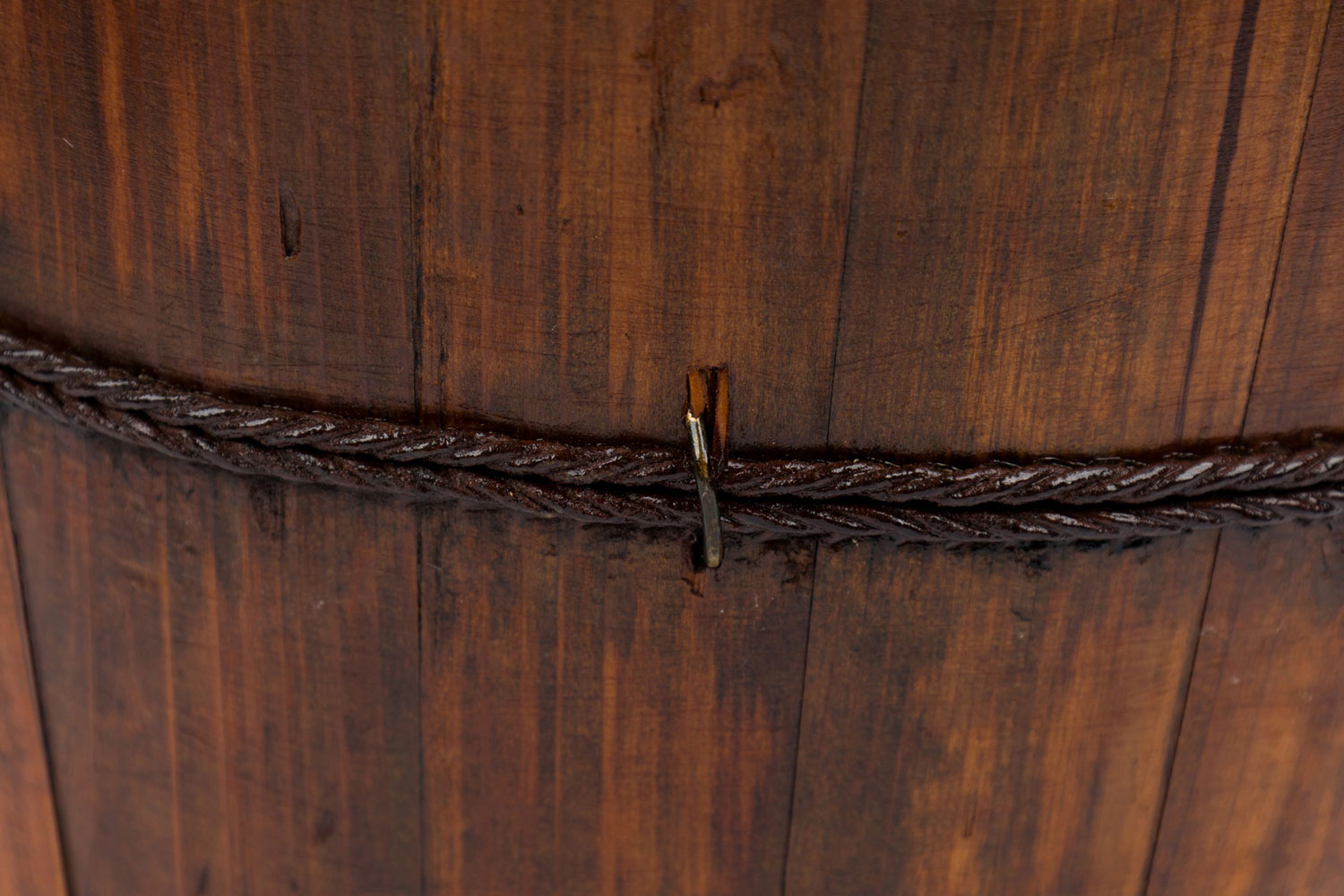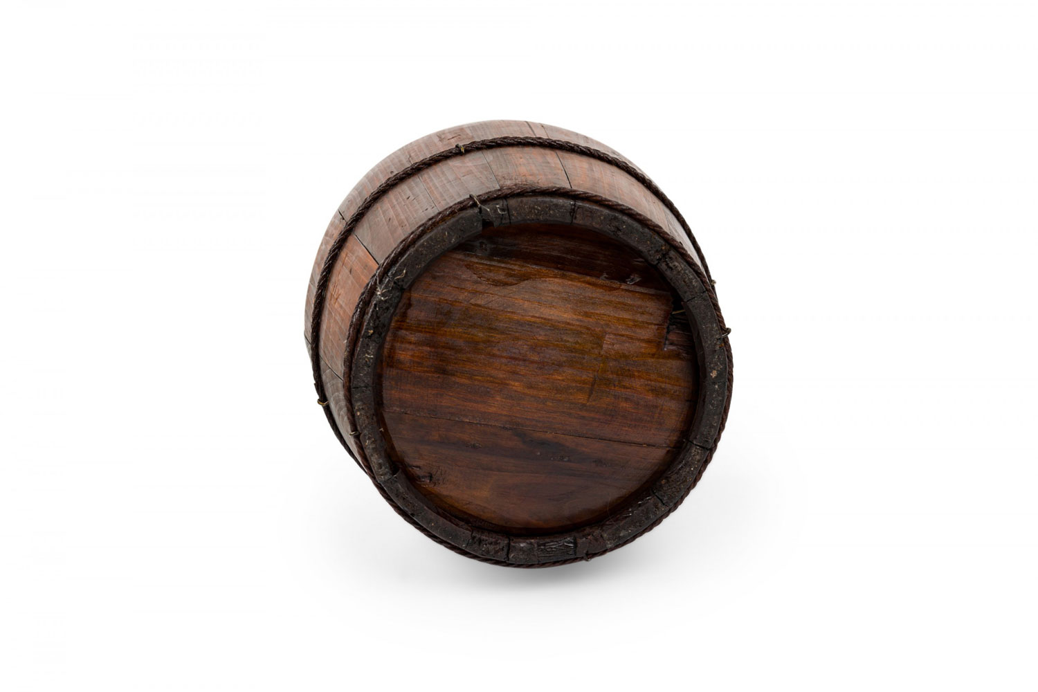 American Country-style umbrella stand made from a wooden barrel with a handle and iron banding..