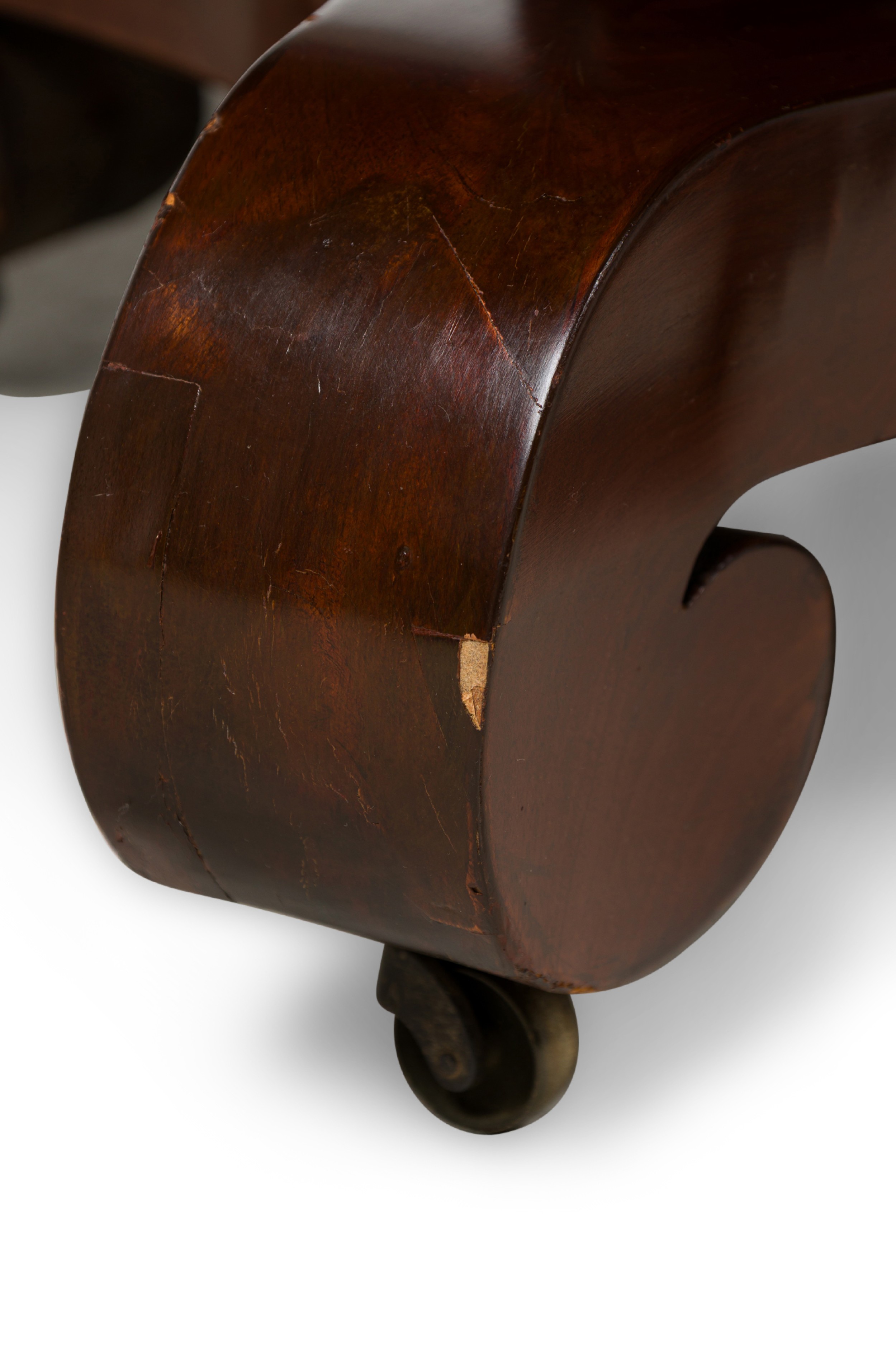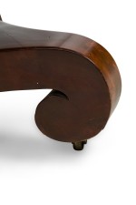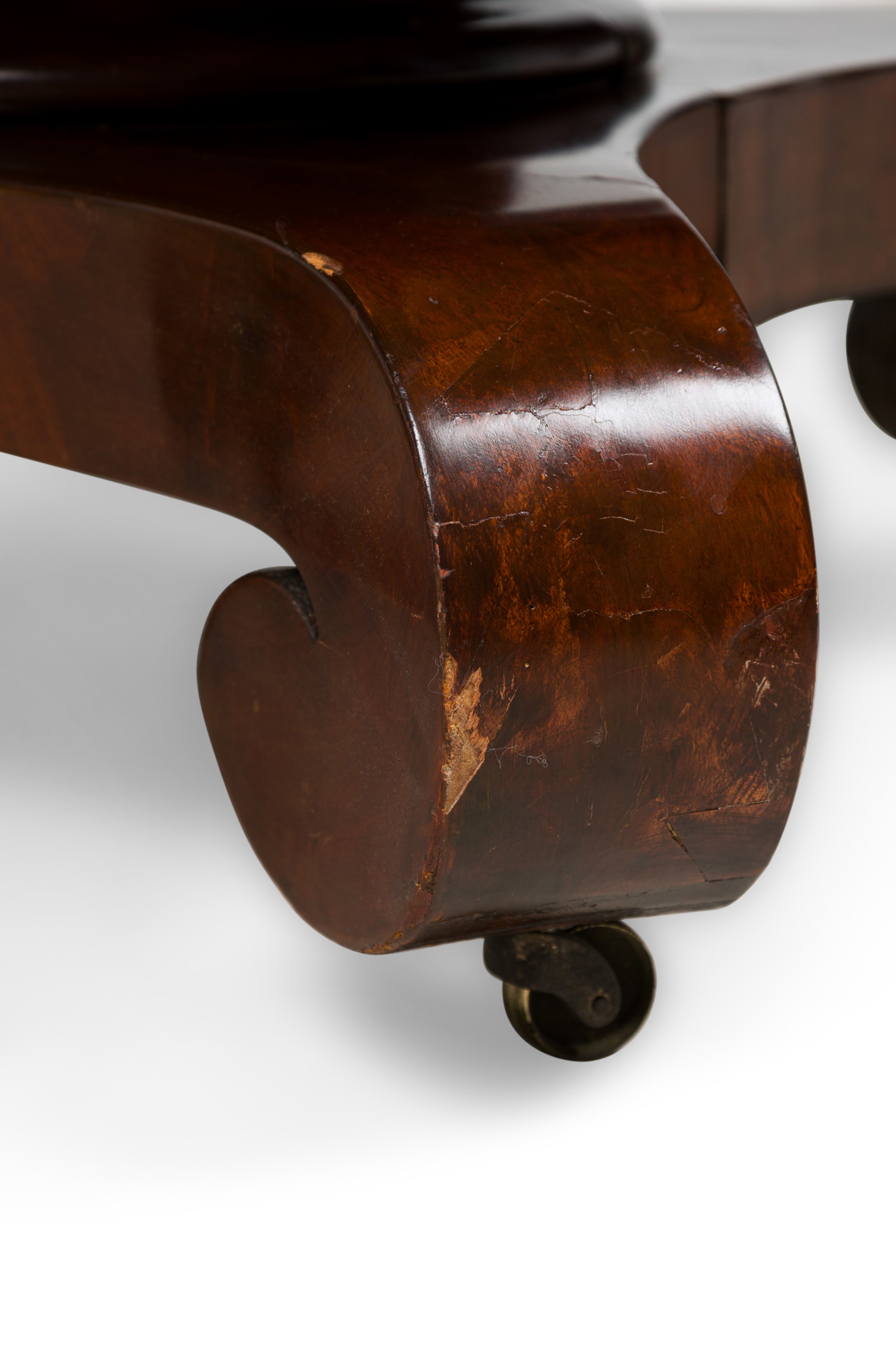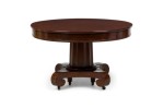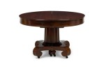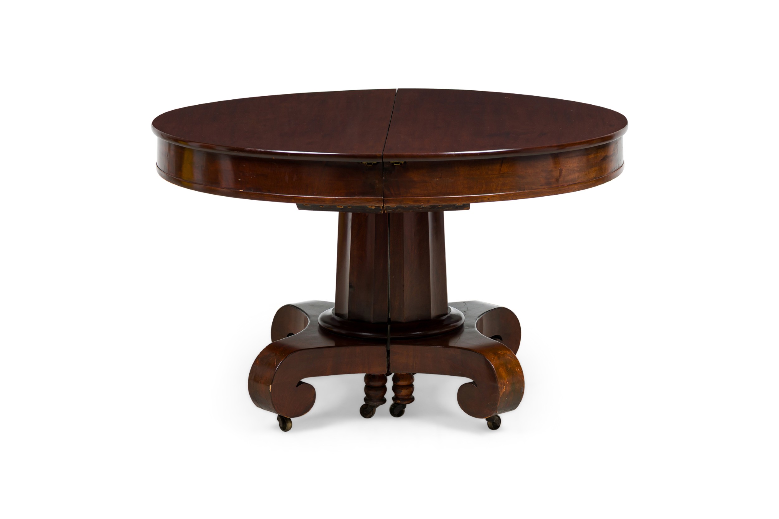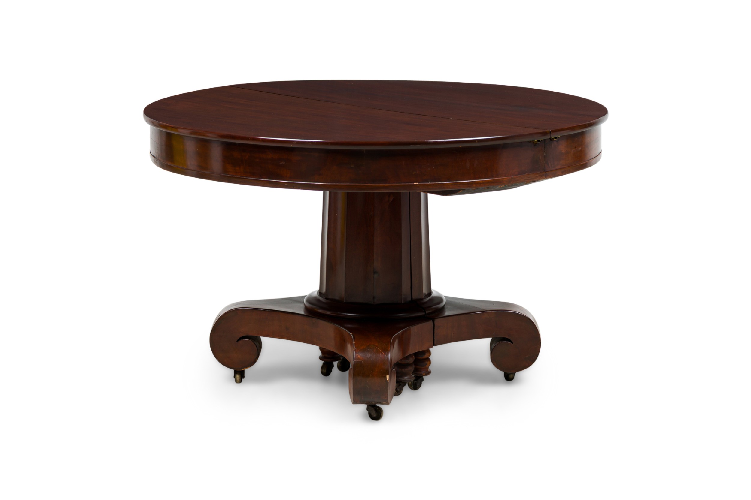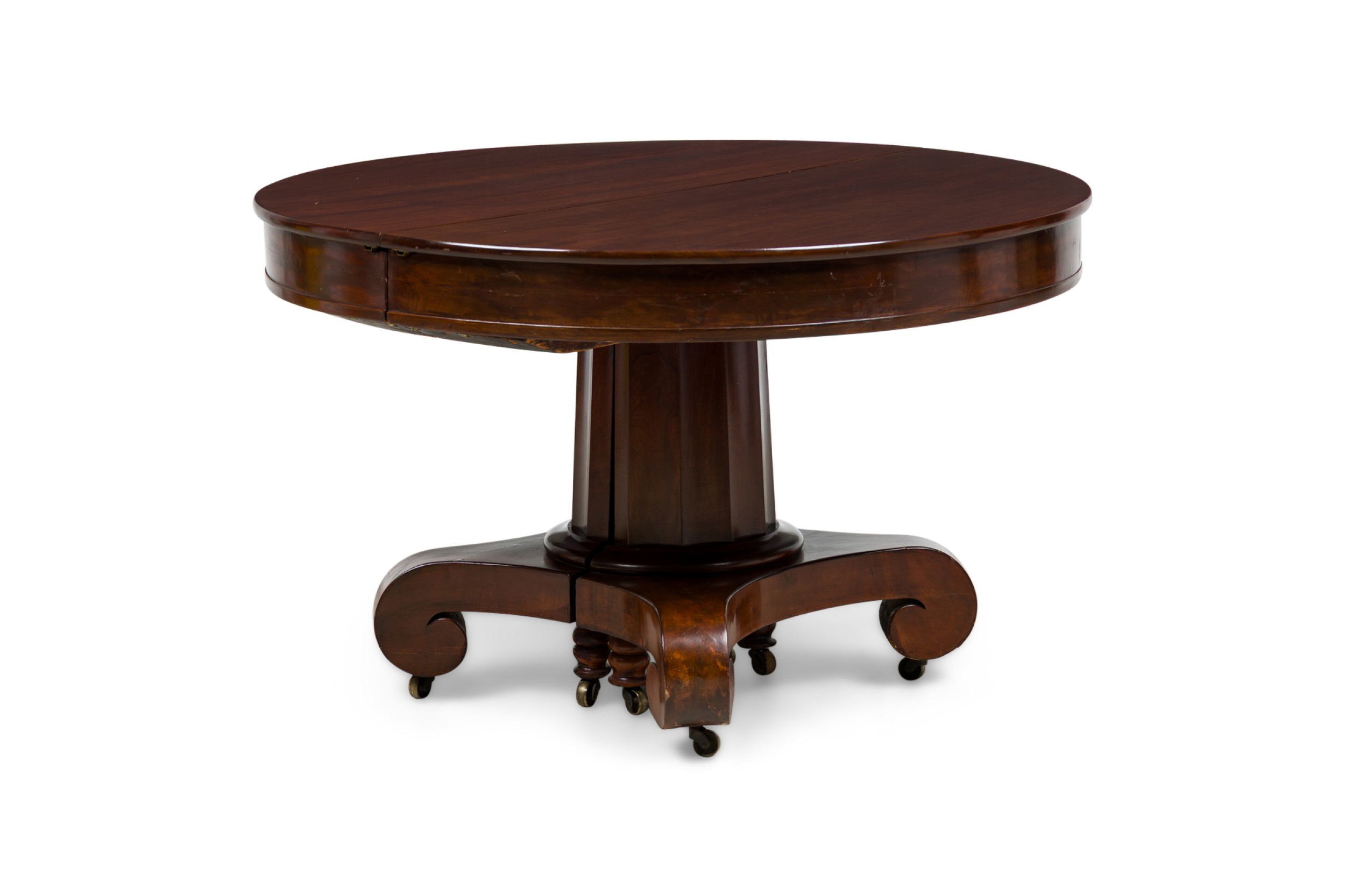 American Empire circular dining table with mahogany veneer, molded top edge and 3 extendable large leaves, resting on 2 pedestal bases.