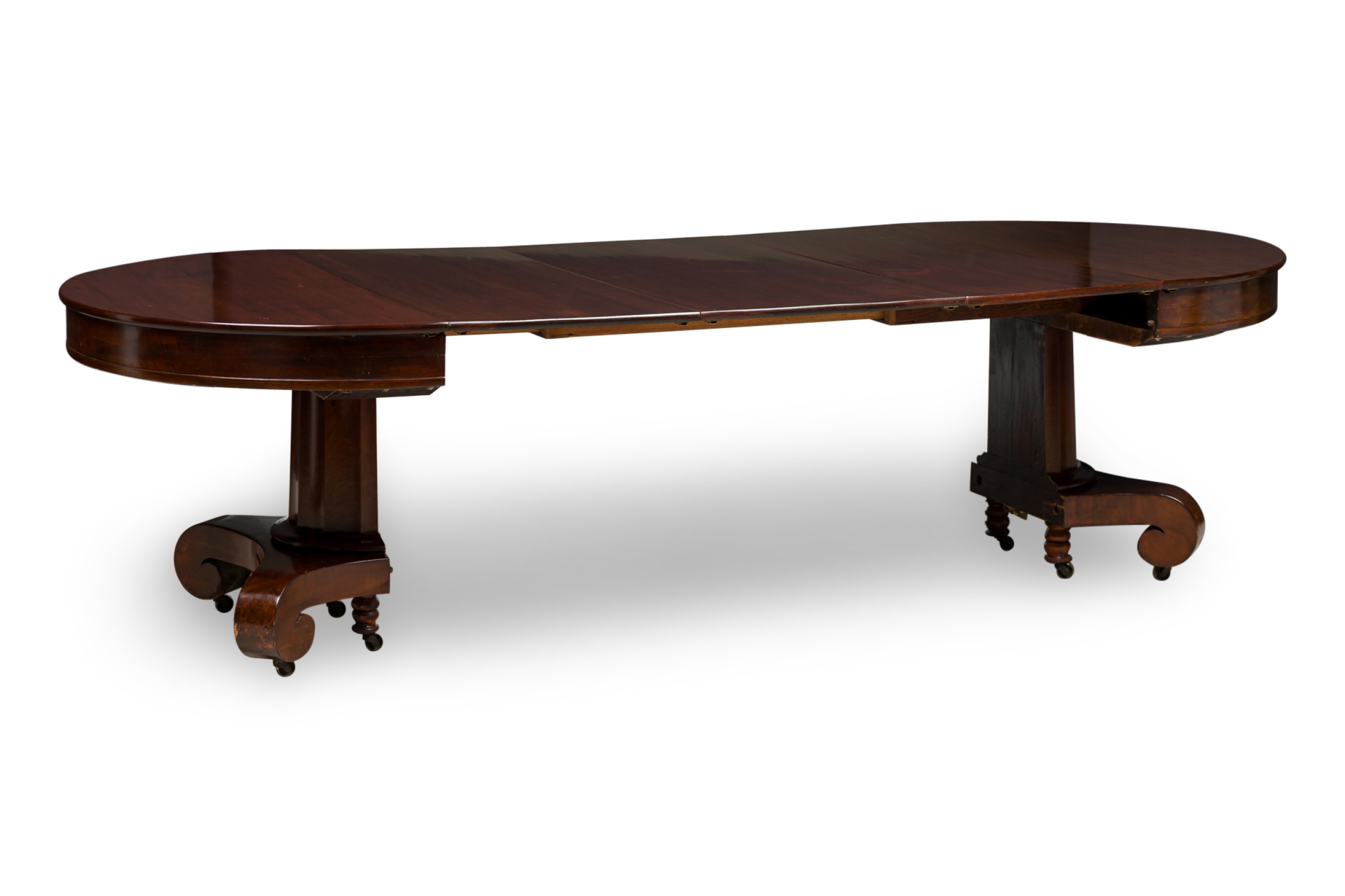 American Empire circular dining table with mahogany veneer, molded top edge and 3 extendable large leaves, resting on 2 pedestal bases..