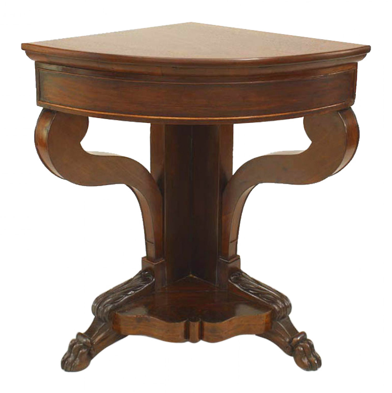 PAIR of American Empire mahogany corner console tables with scroll legs (PRICED AS PAIR)