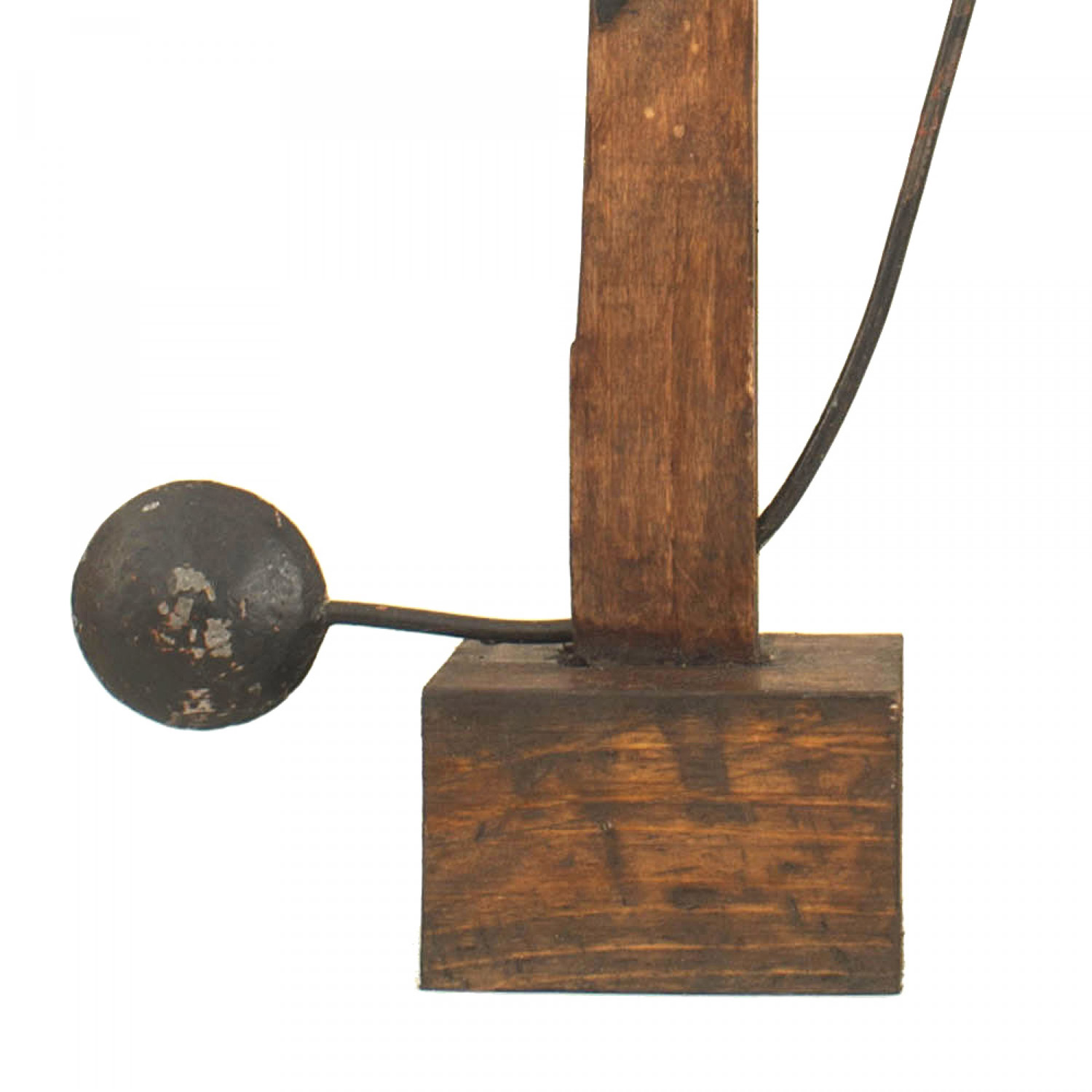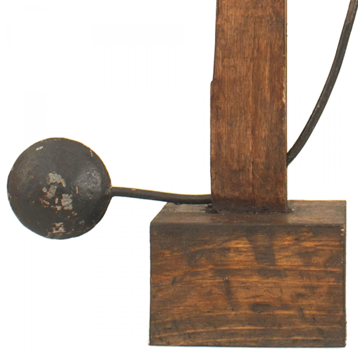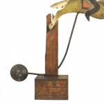 American Country (19/20th Cent) Folk Art toy of a painted and decorated metal cowboy on a horse with moving parts mounted on an balance beam.