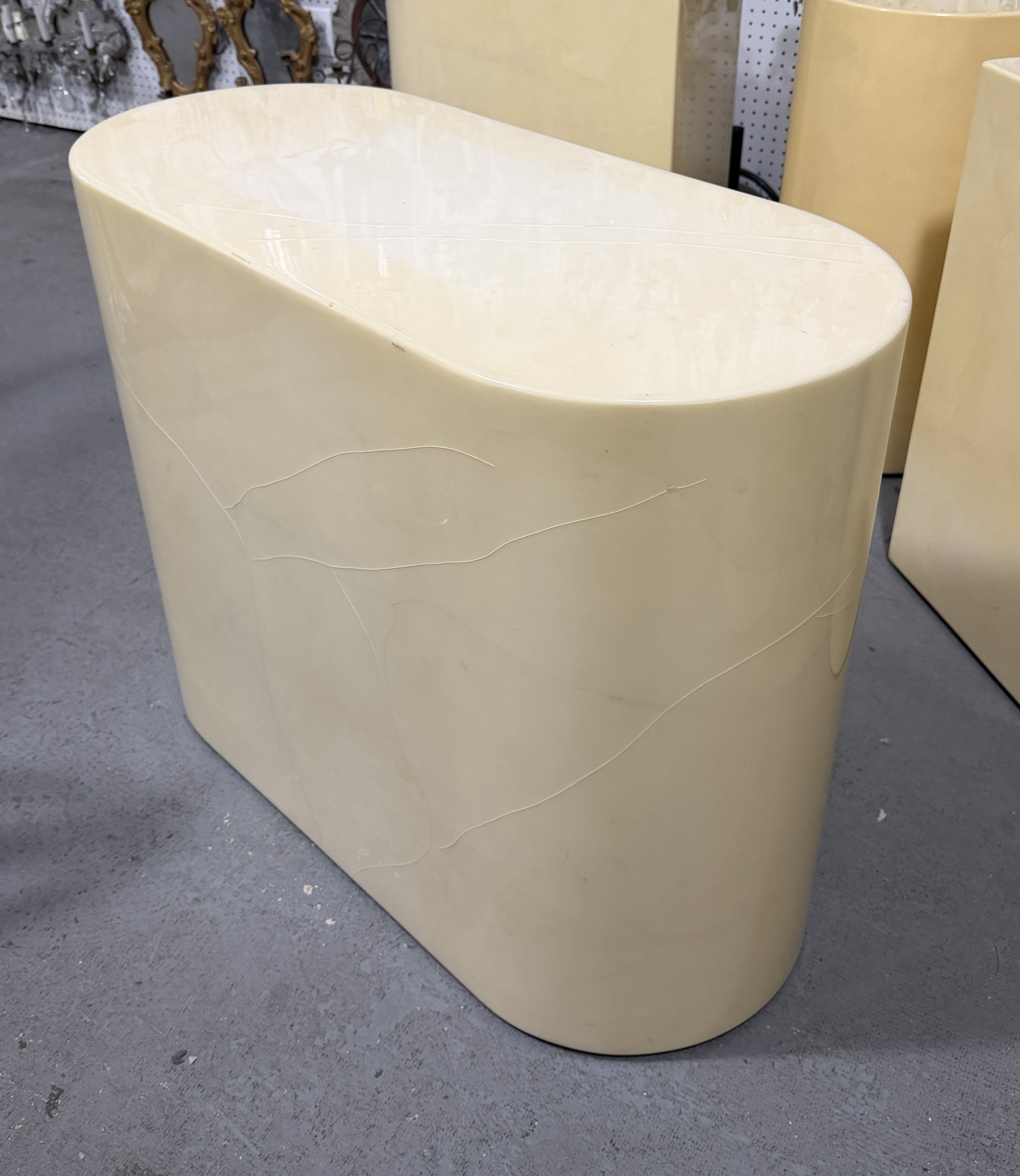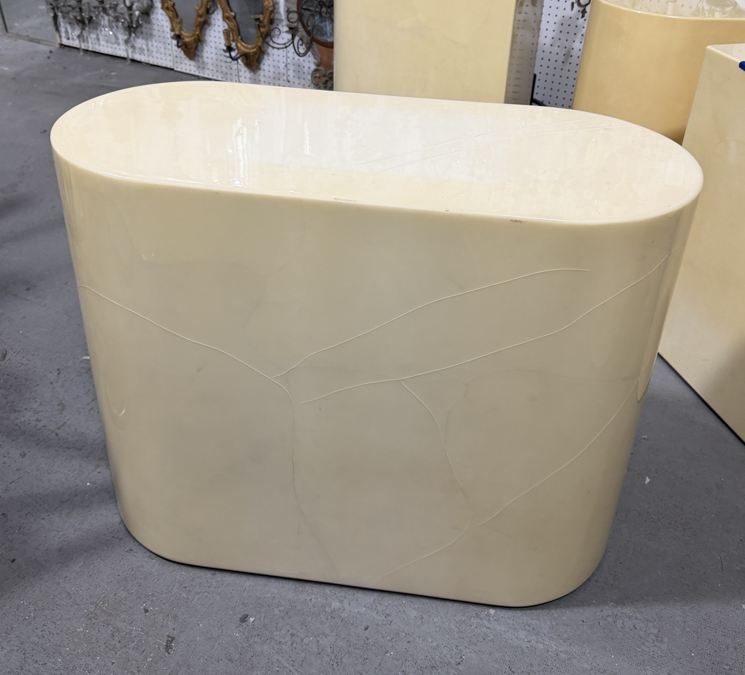 American Mid-Century end / side table or pedestal in an oval, pill-shaped form, finished in a lacquered beige parmchment / goatskin veneer. (KARL SPRINGER)