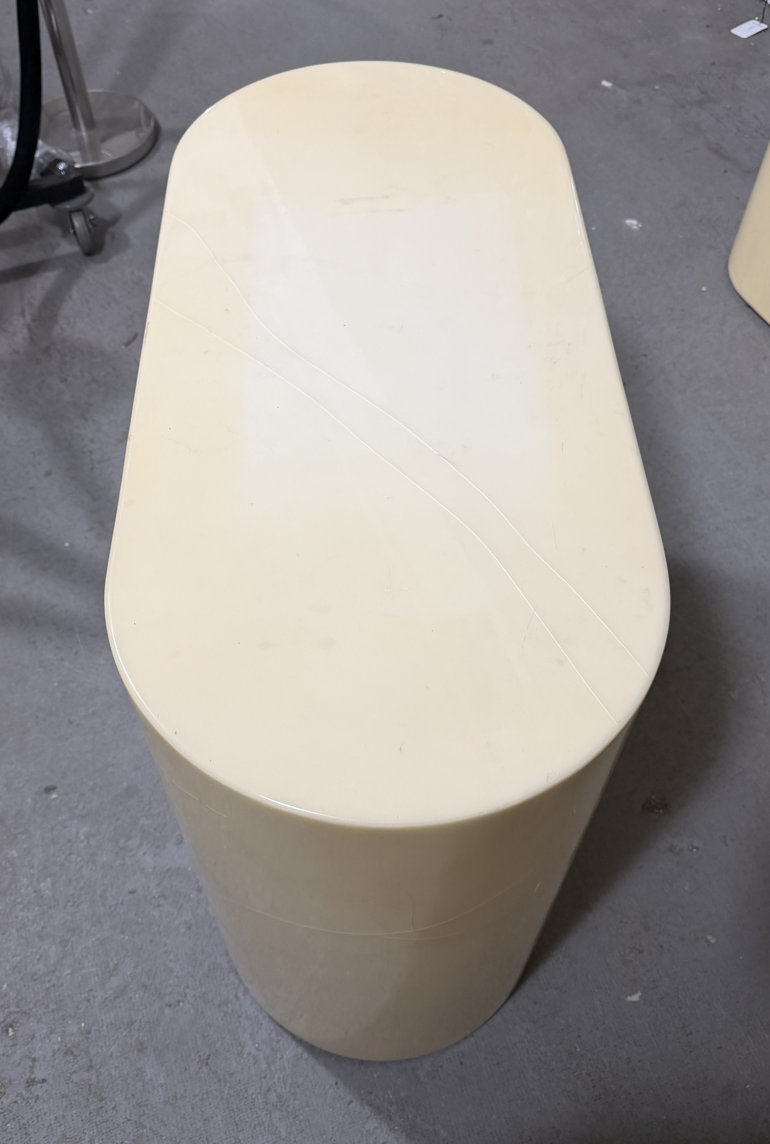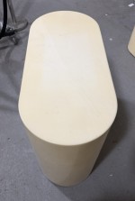 American Mid-Century end / side table or pedestal in an oval, pill-shaped form, finished in a lacquered beige parmchment / goatskin veneer. (KARL SPRINGER).