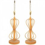 PAIR of Bamboo Mid-Century table lamps with an open design on a round oak base (PRICED AS PAIR).