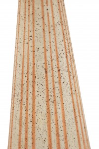 American Mid-Century (1960s) beige cone shaped ceramic table lamp with an orange fluted design resting on a round wood base with a similar tapered top..