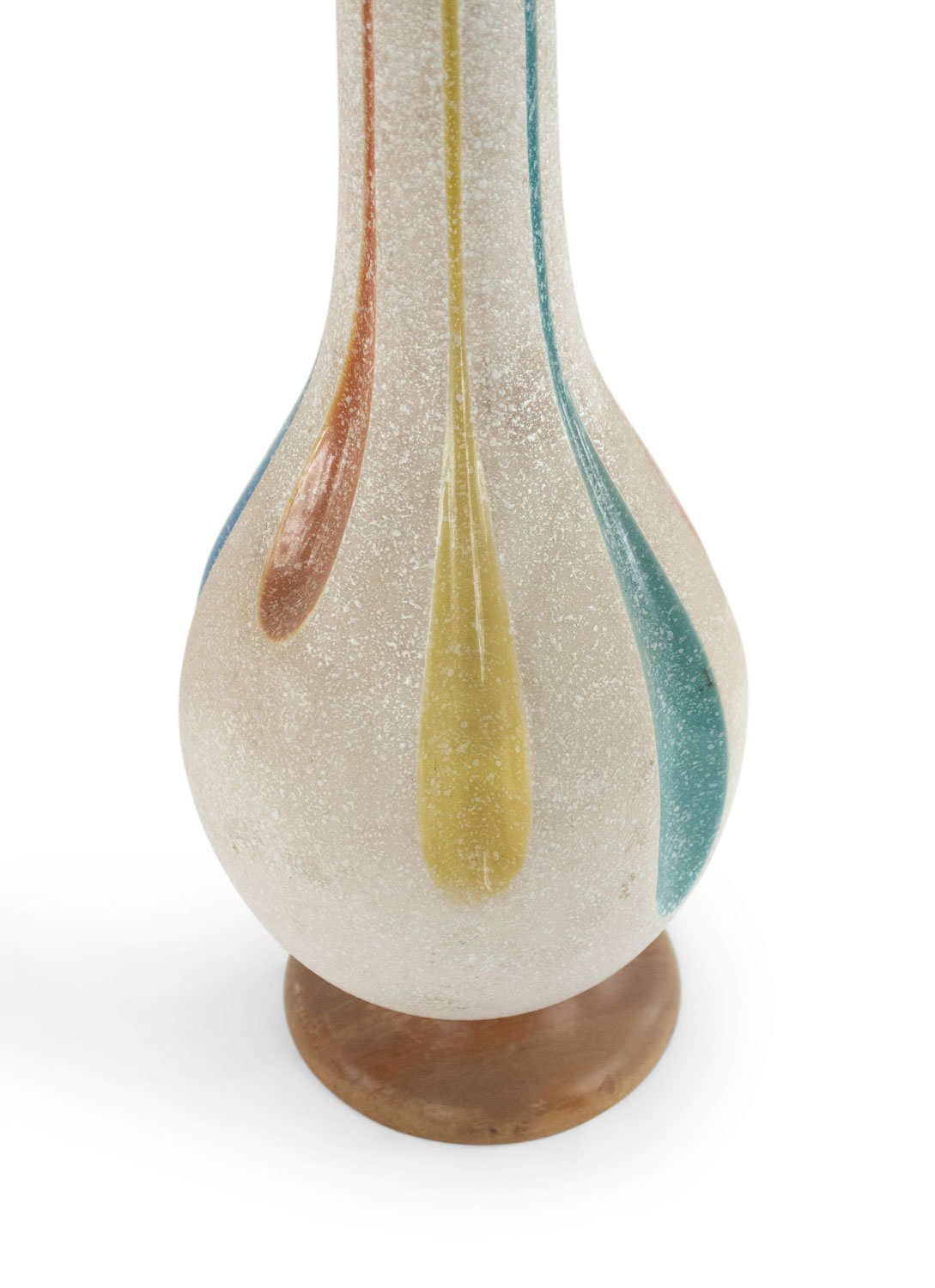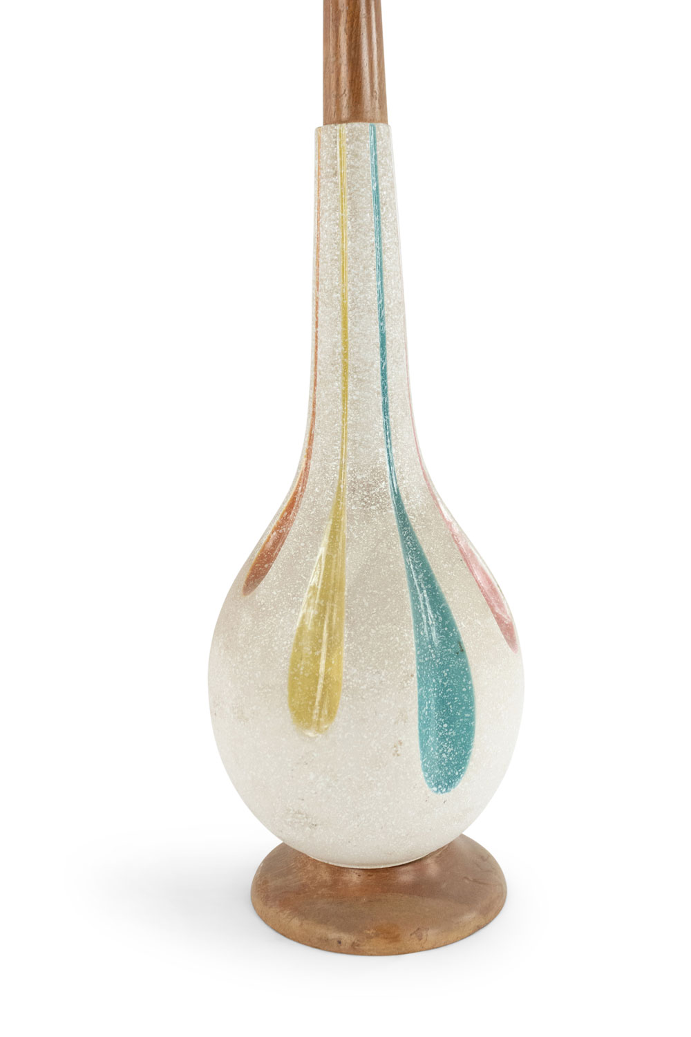 American Mid-Century beige porcelain table lamp with a tapered neck and stylized multi-colored fluted design on a round wood base.