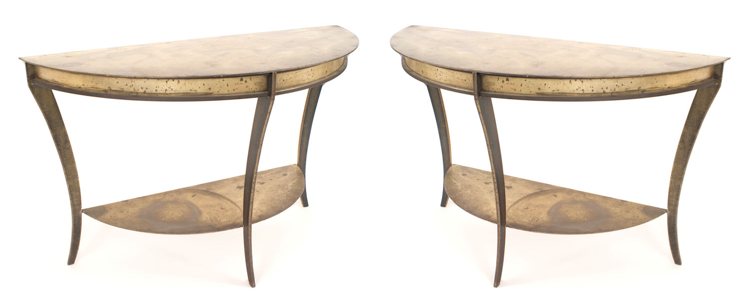 Pair of American Mid-Century Brass and Steel Demilune Console Tables