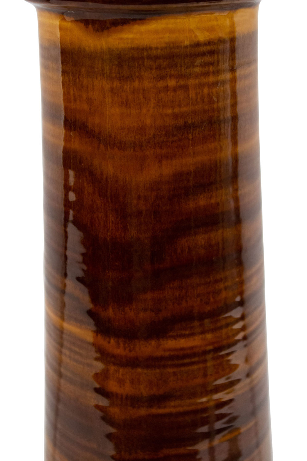 American Mid-Century brown and black striated cylindrical 2 tier table lamp with a brown metal round base.
