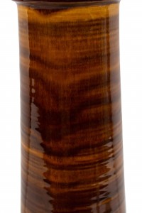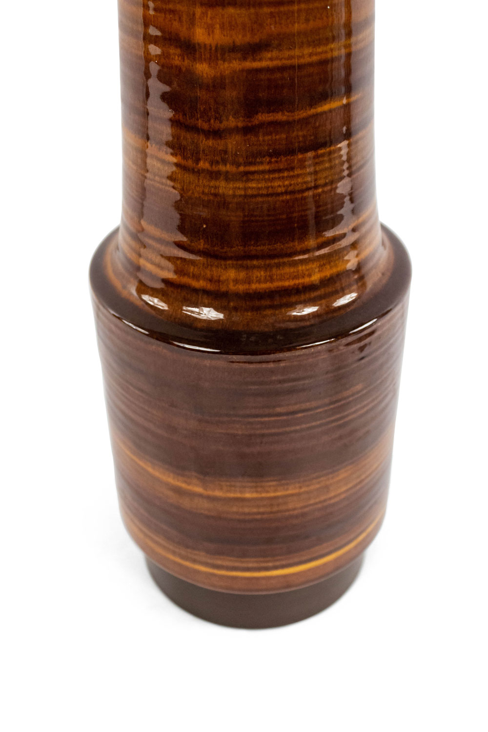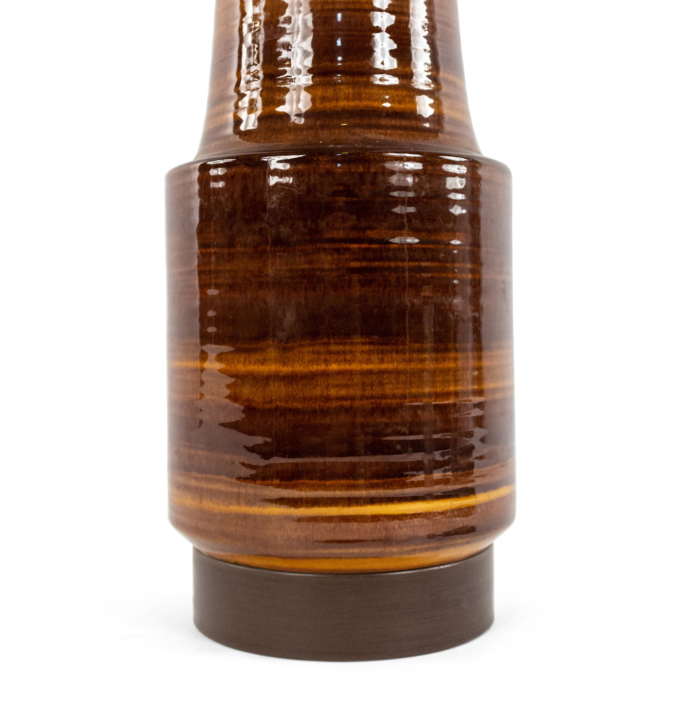 American Mid-Century brown and black striated cylindrical 2 tier table lamp with a brown metal round base..