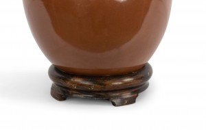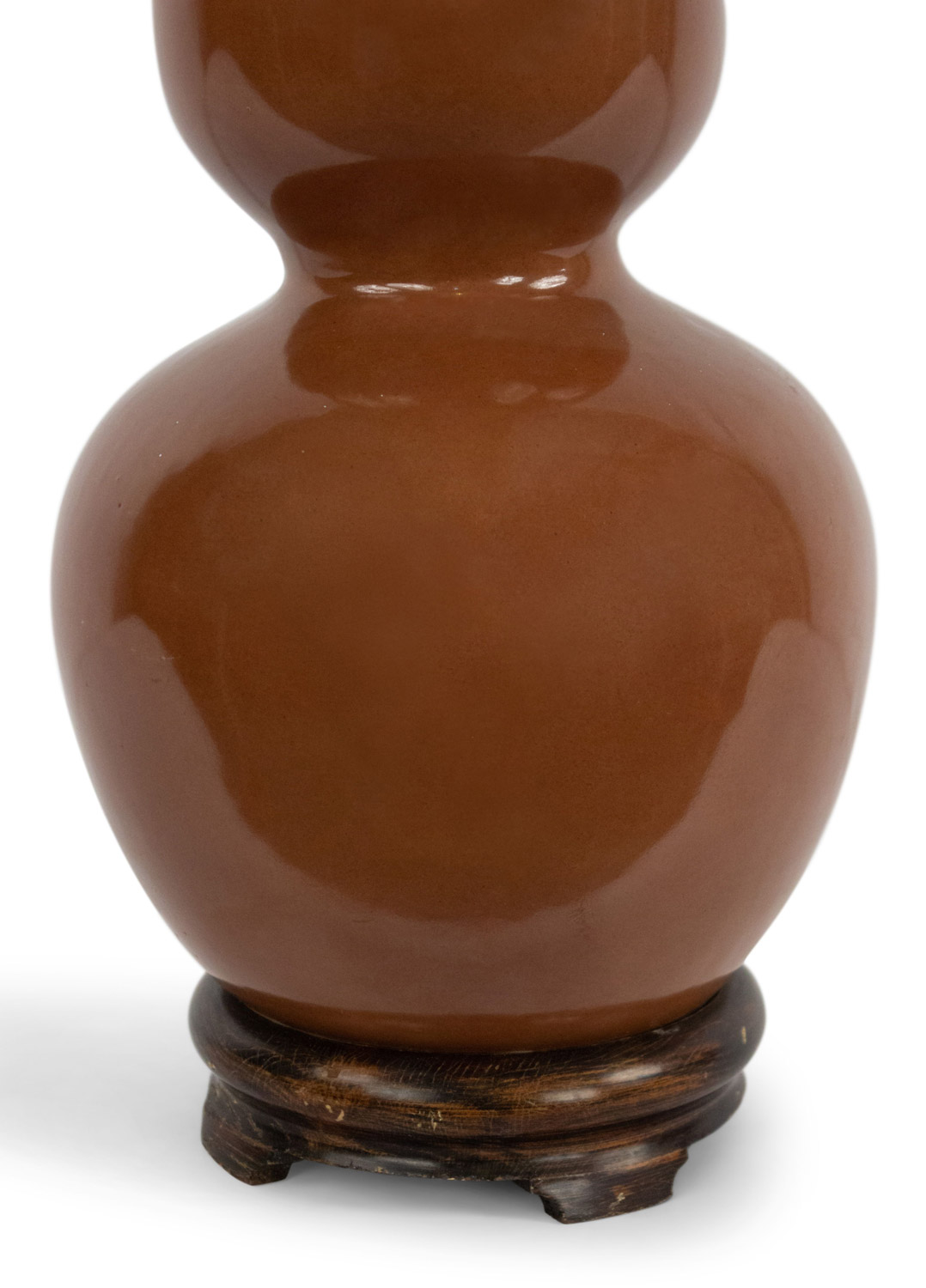 American Mid-Century brown porcelain 2 tier bulbous shaped round lamp with a round teak base..