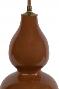 American Mid-Century brown porcelain 2 tier bulbous shaped round lamp with a round teak base.