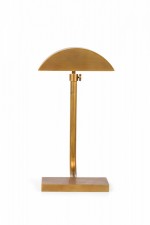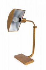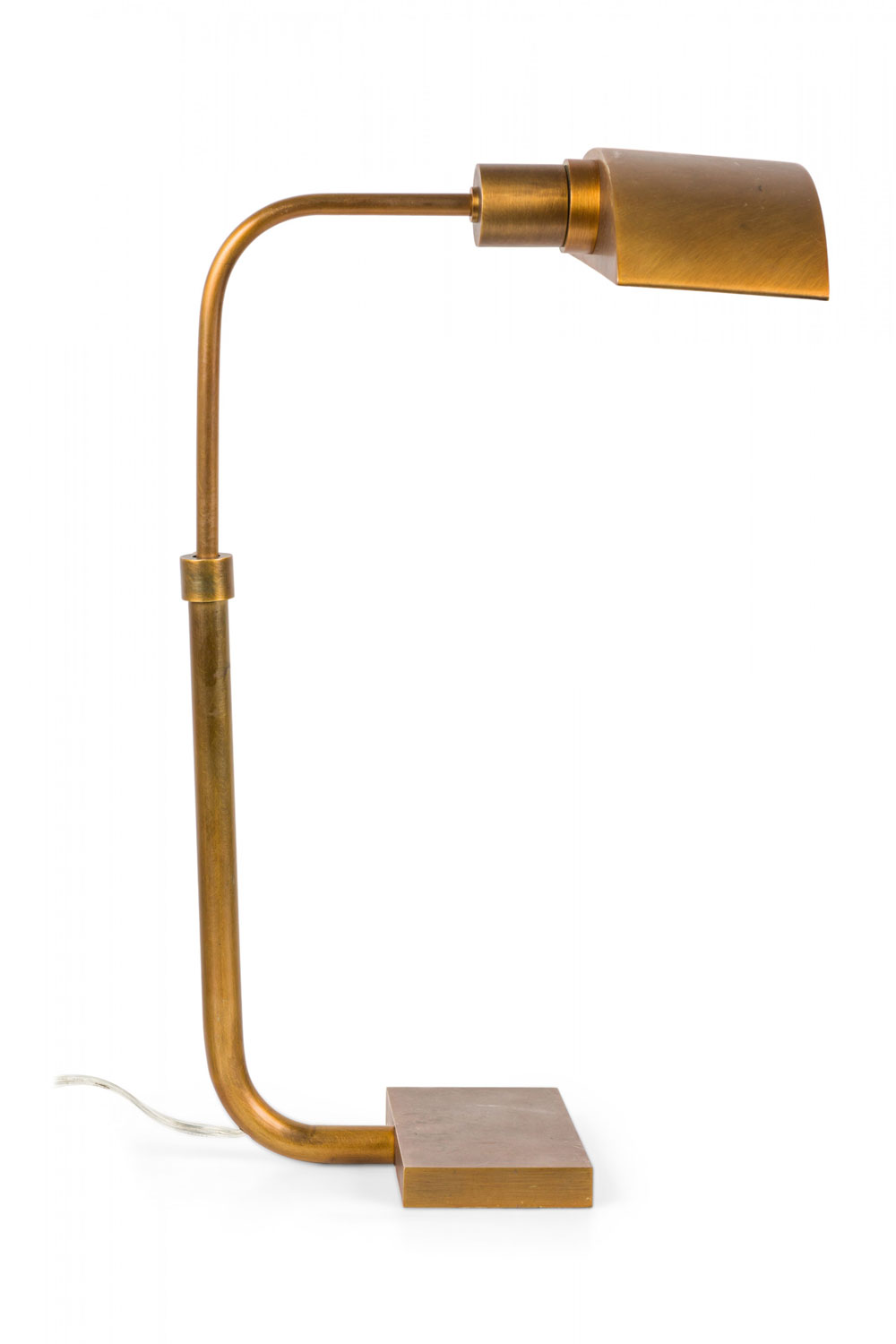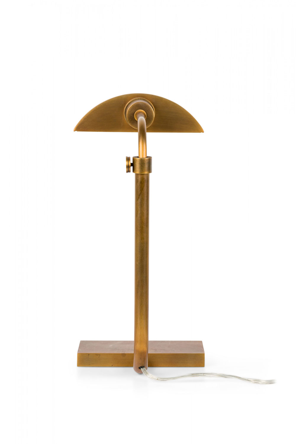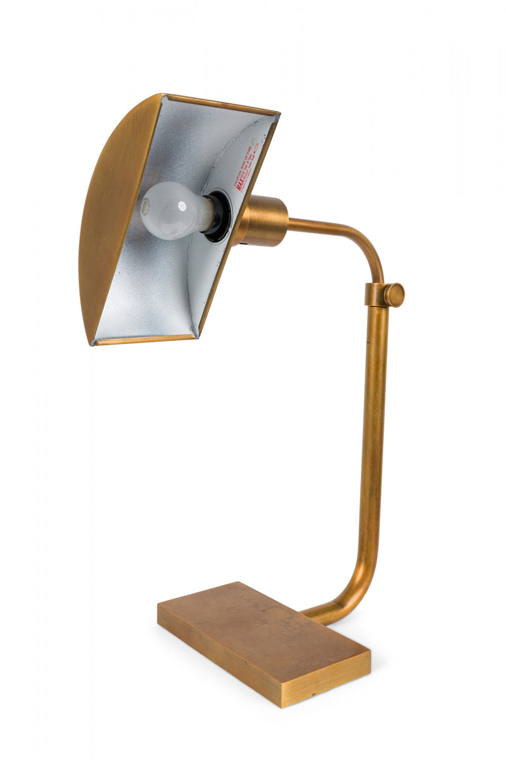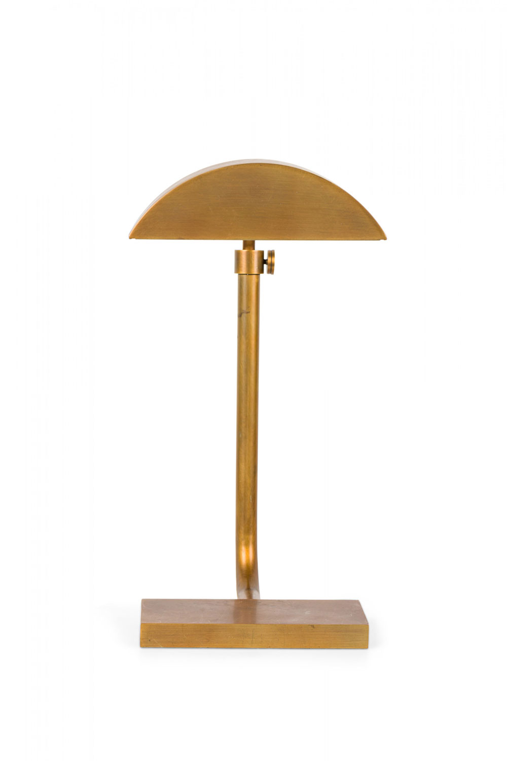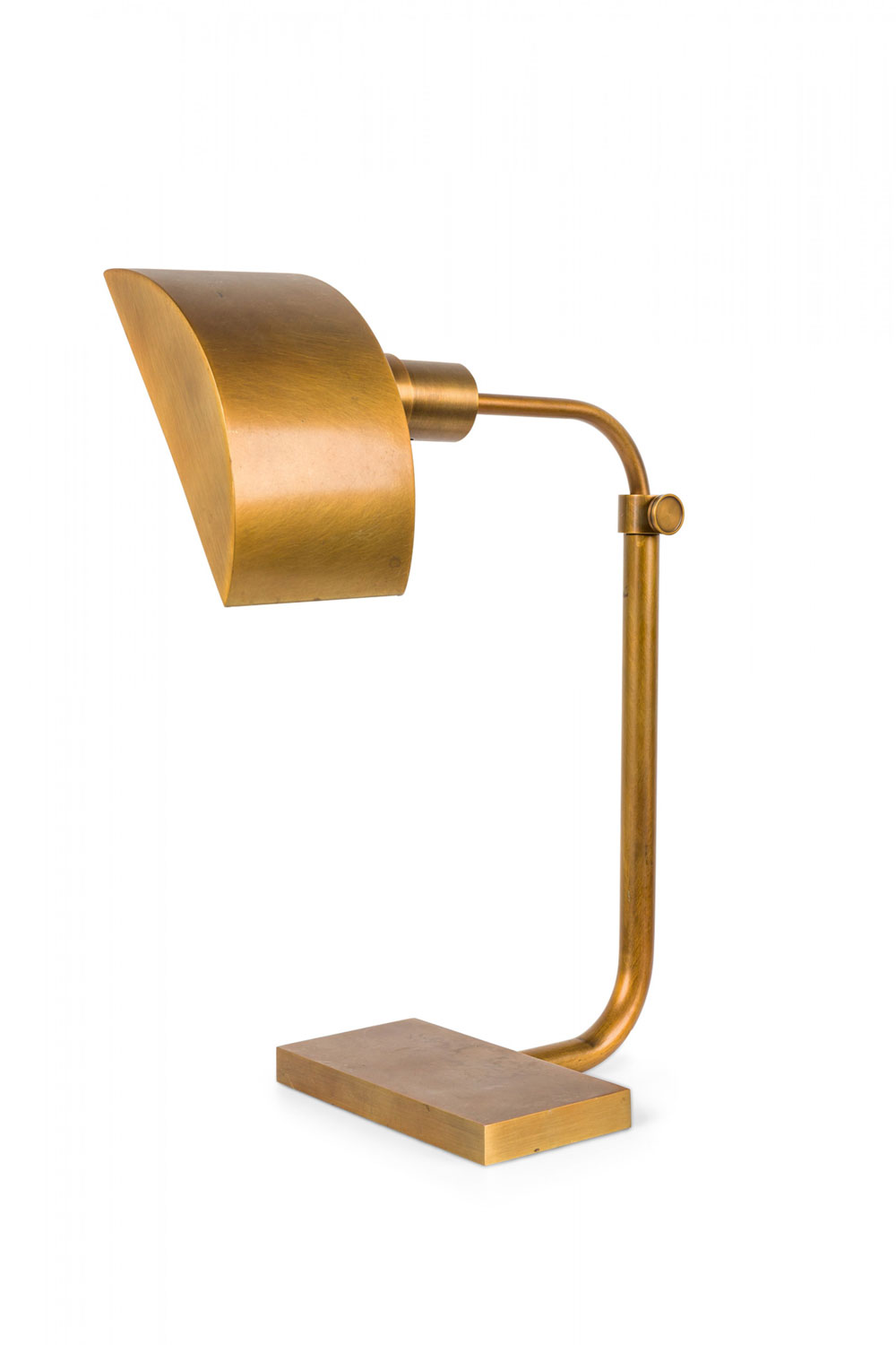 American Mid-Century brushed brass desk lamp with a rectangular brass base anchoring a cantilevered lamp with a semicircular brass shade and adjustable swivel / height control circular knob. Wired and functioning but no on / off switch.