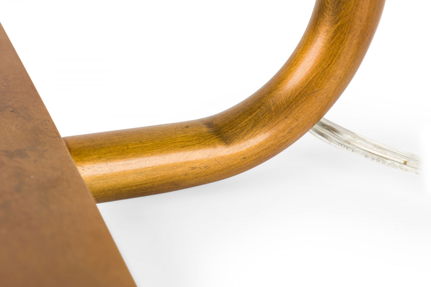 American Mid-Century brushed brass desk lamp with a rectangular brass base anchoring a cantilevered lamp with a semicircular brass shade and adjustable swivel / height control circular knob. Wired and functioning but no on / off switch..