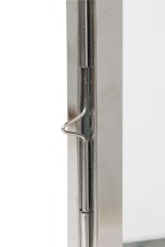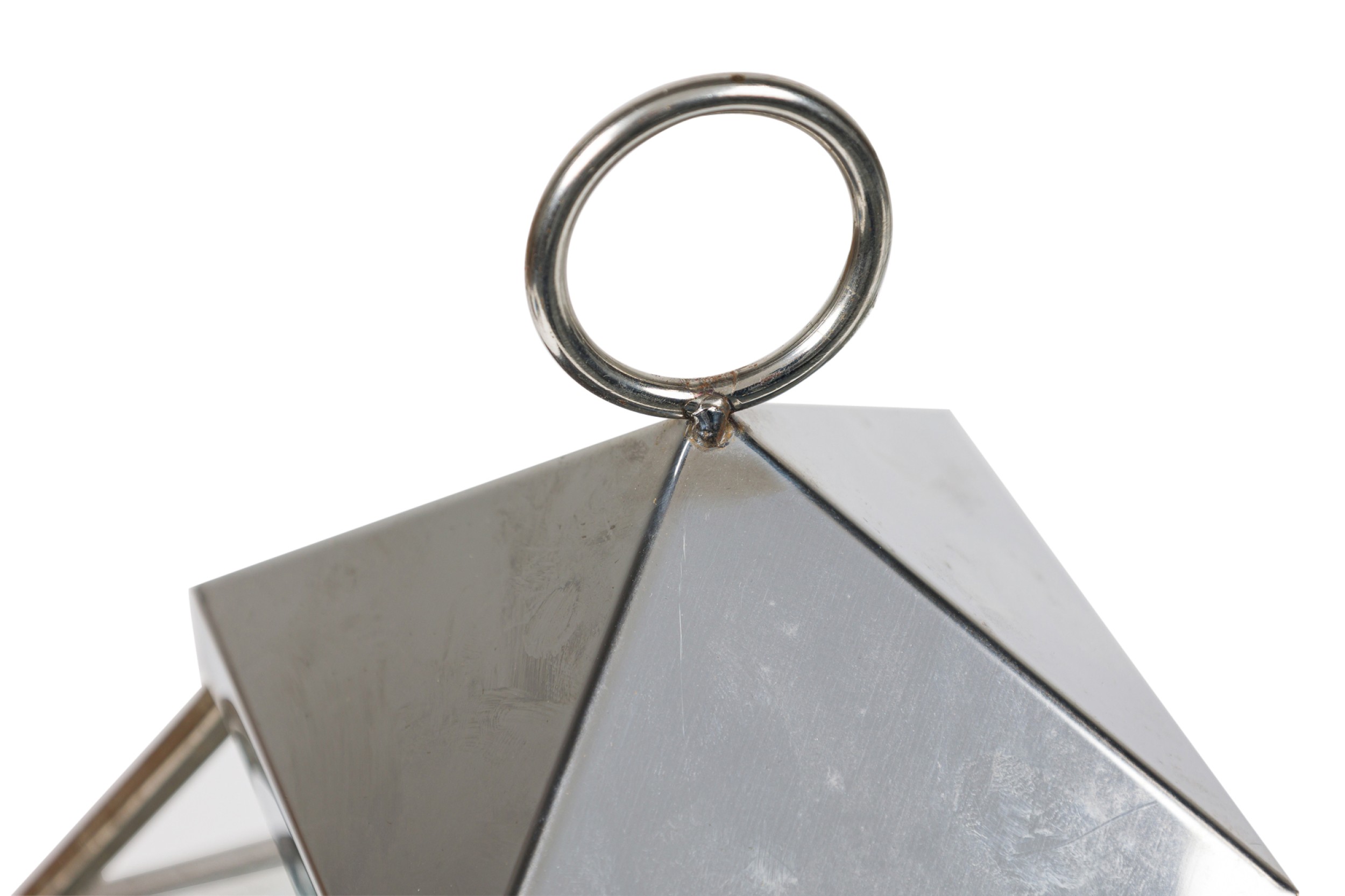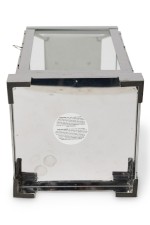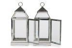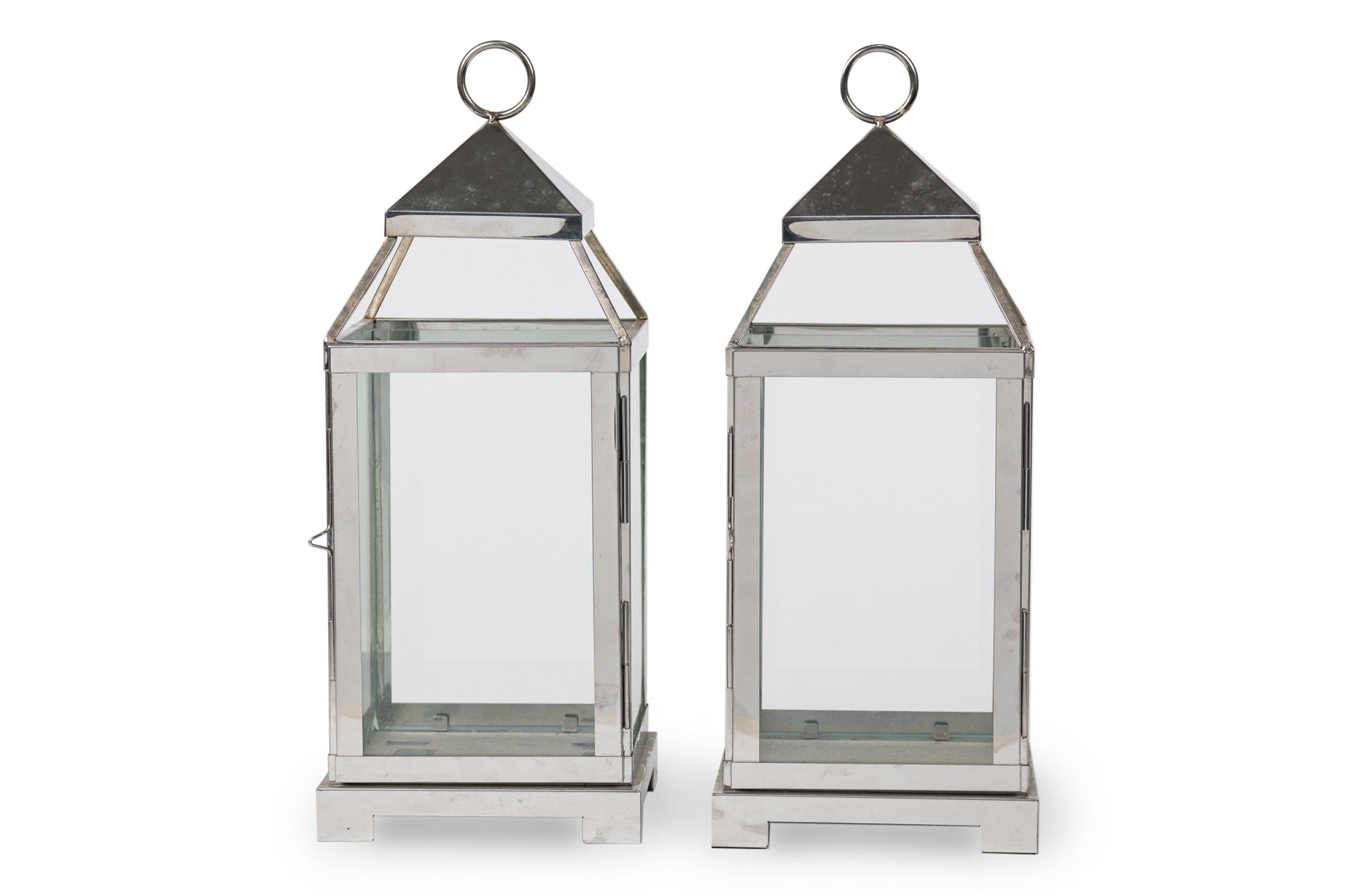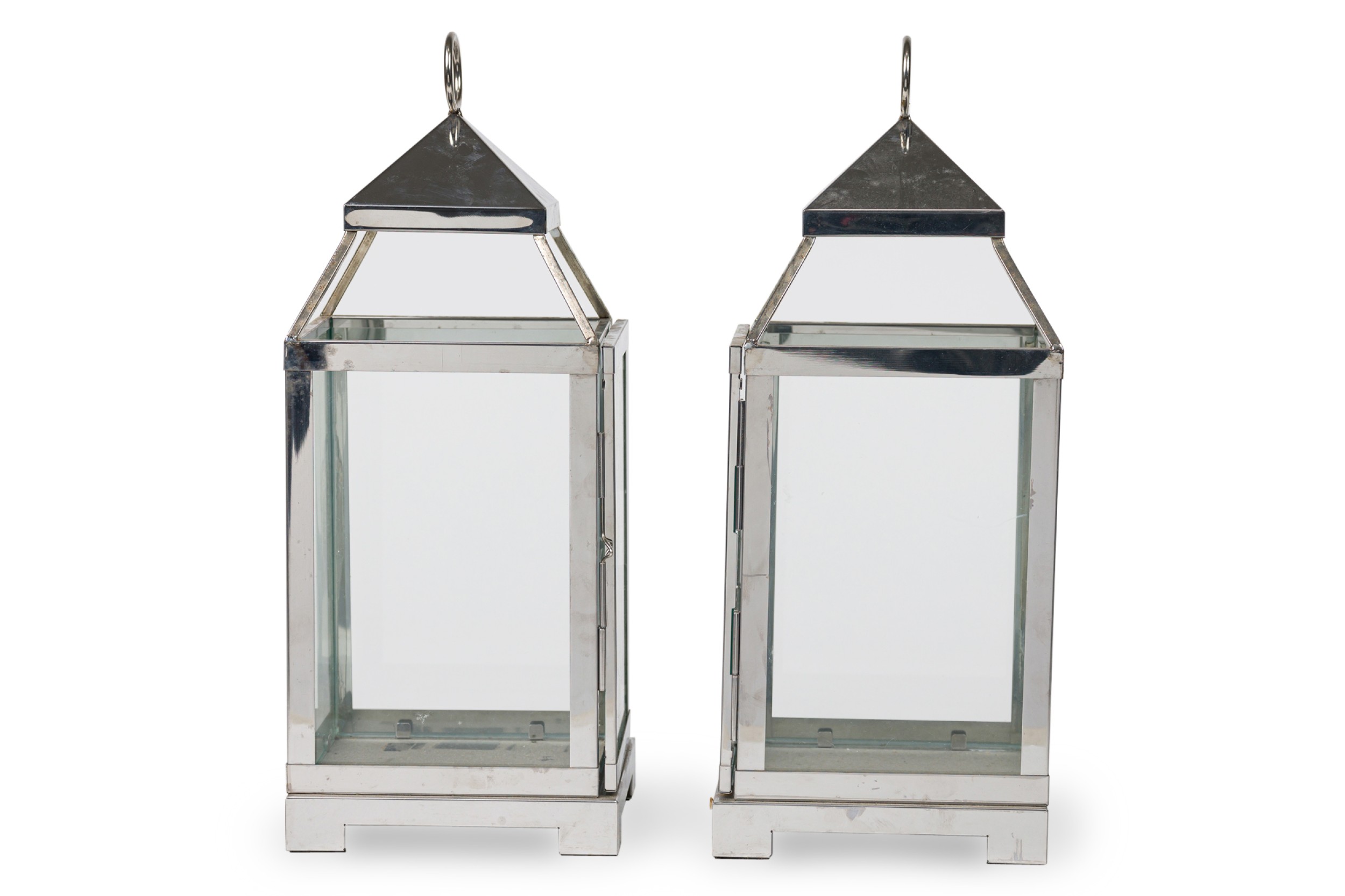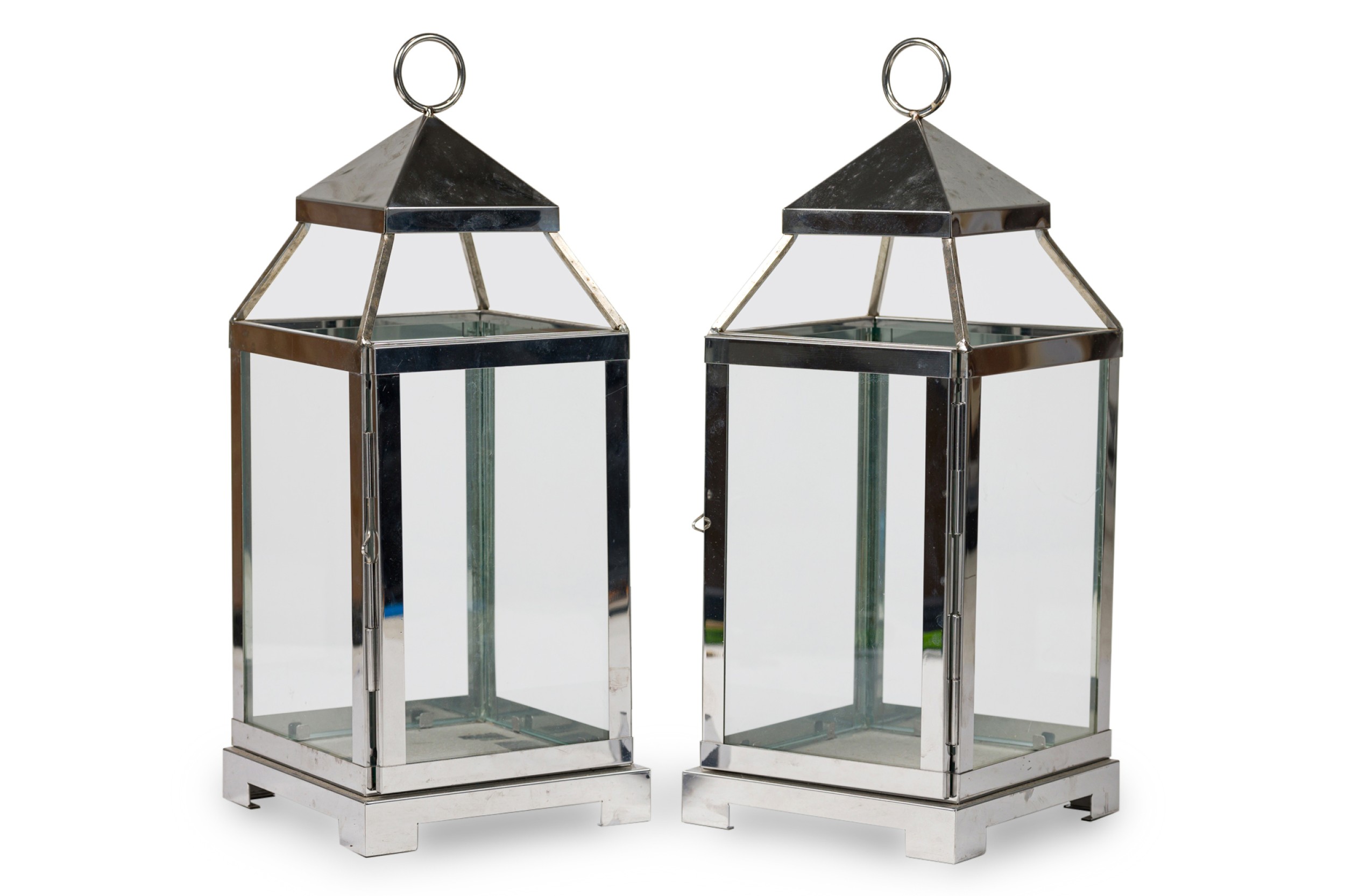 2 American Mid-Century chrome and glass large lantern featuring a sleek modern design on a square base with a circular handle for hanging and carrying (PRICED EACH)