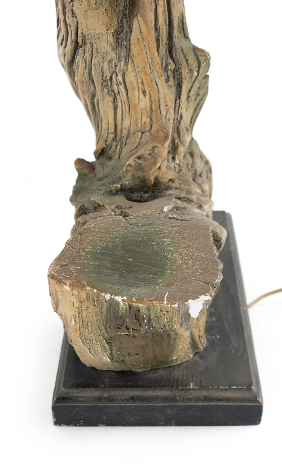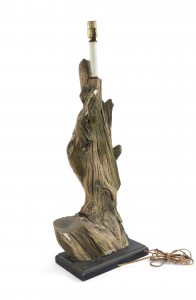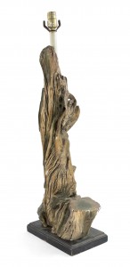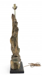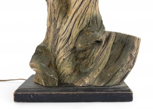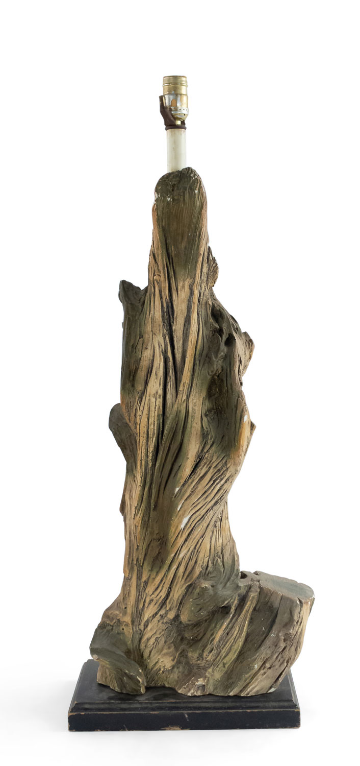 PAIR of American Mid-Century large faux driftwood composition table lamps resting on a black rectangular base (PRICED AS PAIR)..