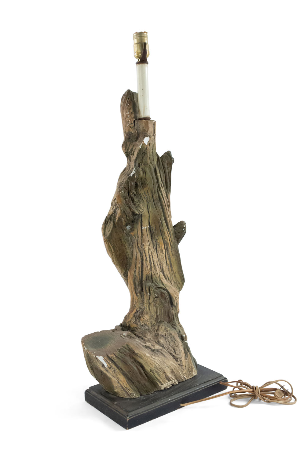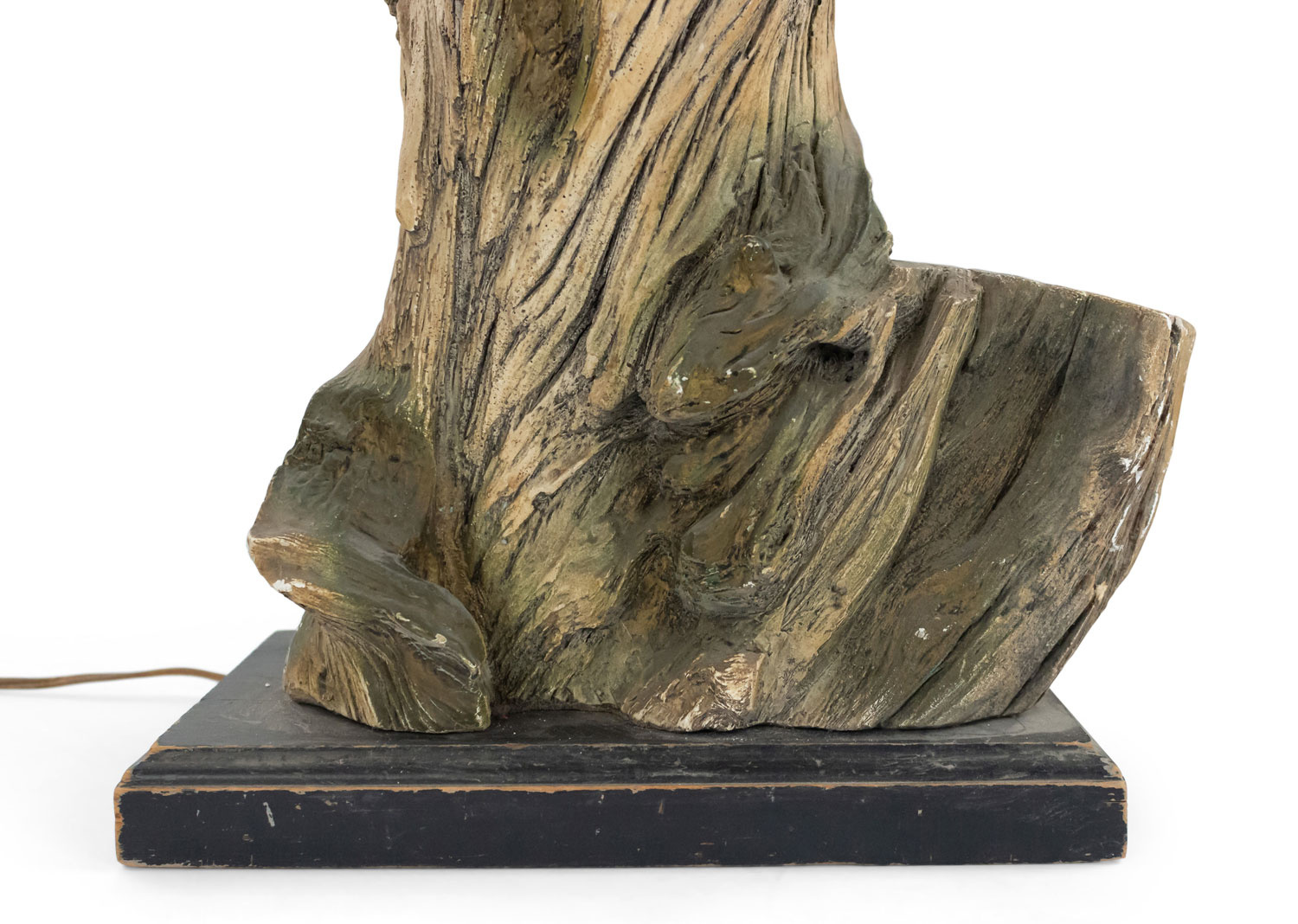 PAIR of American Mid-Century large faux driftwood composition table lamps resting on a black rectangular base (PRICED AS PAIR).