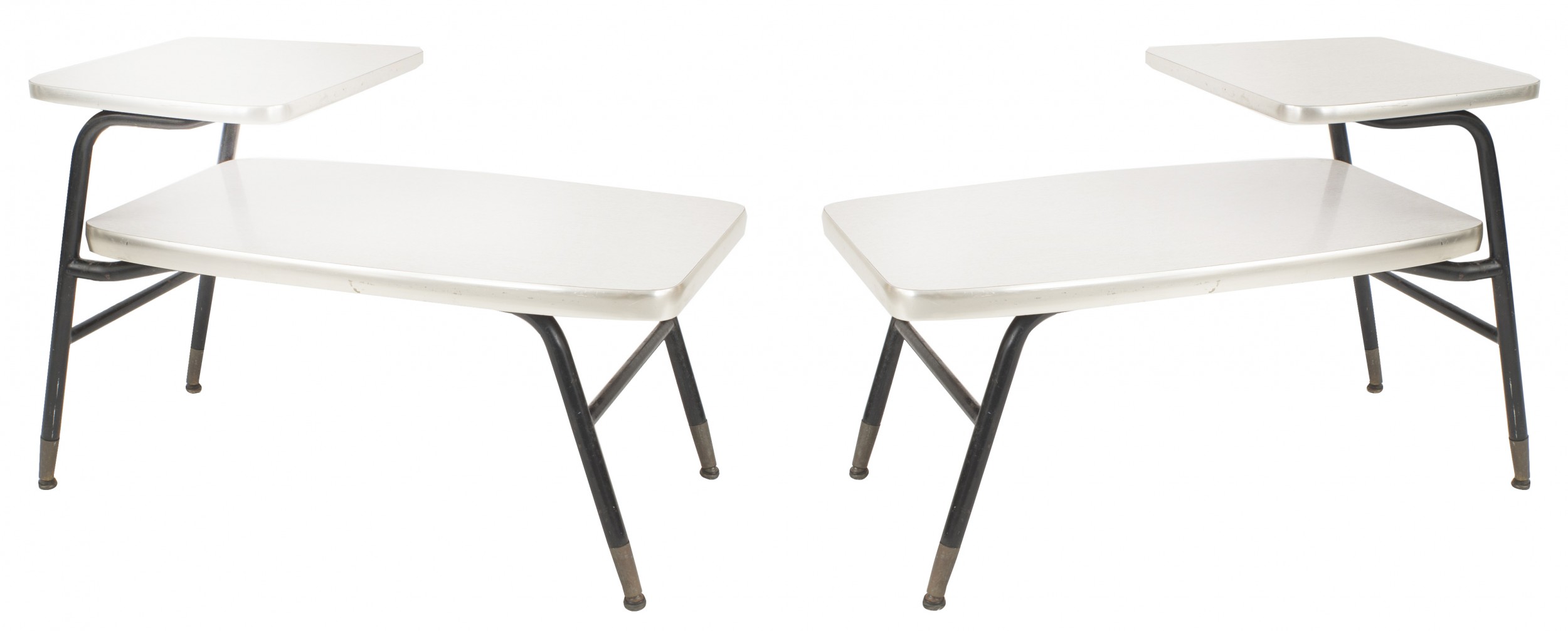 PAIR of American Mid-Century (1950-60s) end/side tables with black metal tubular frames & brass feet with a short shelf over a longer bottom shelf with an aluminum edge & grey faux wood formica tops (by LLOYD) (Related item: 060968) (PRICED AS PAIR)