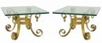 PAIR of American Mid-Century (1940s) gilt wrought iron side tables with 4 connected scroll legs holding rings and supporting a square ¾" glass top.