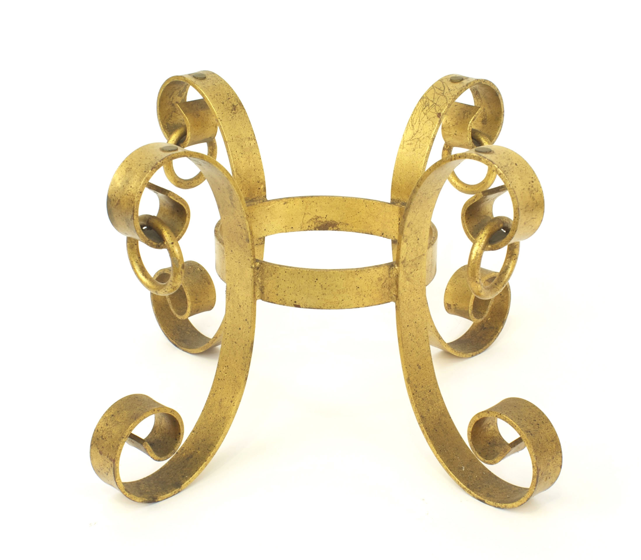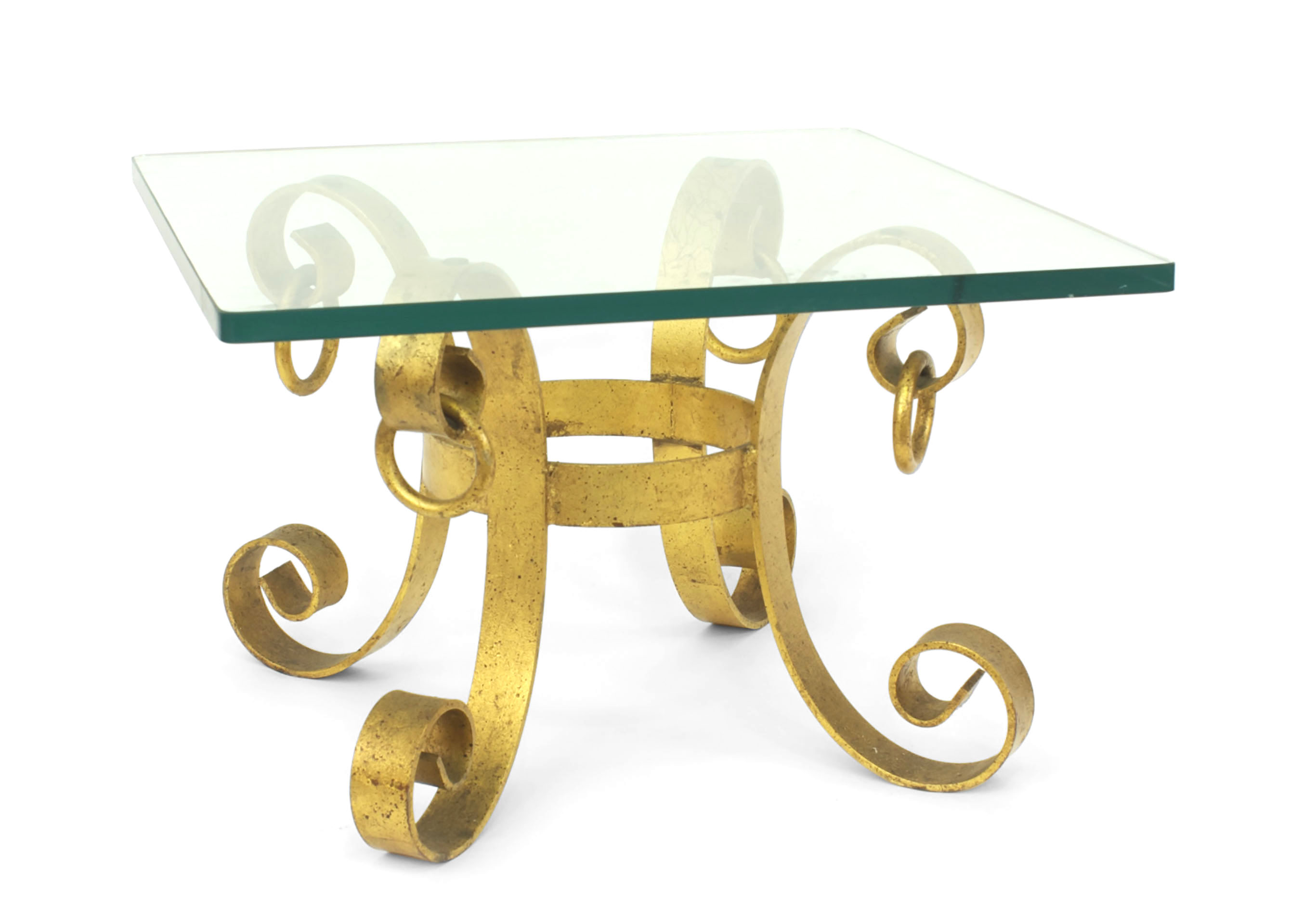 PAIR of American Mid-Century (1940s) gilt wrought iron side tables with 4 connected scroll legs holding rings and supporting a square ¾" glass top