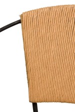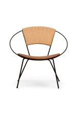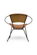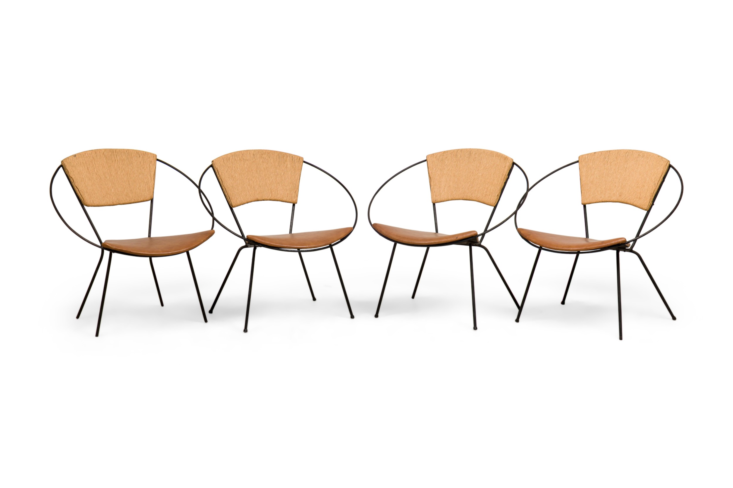 8 American Mid-Century round hoop back iron chairs with leather seats and woven rush centered panel backs supported by thin metal legs. (attributed to JOSEPH CHICCHELLI)(PRICED EACH).