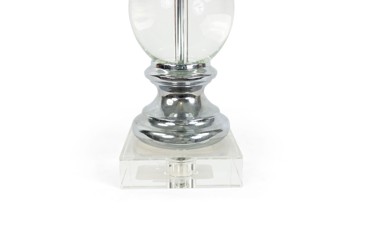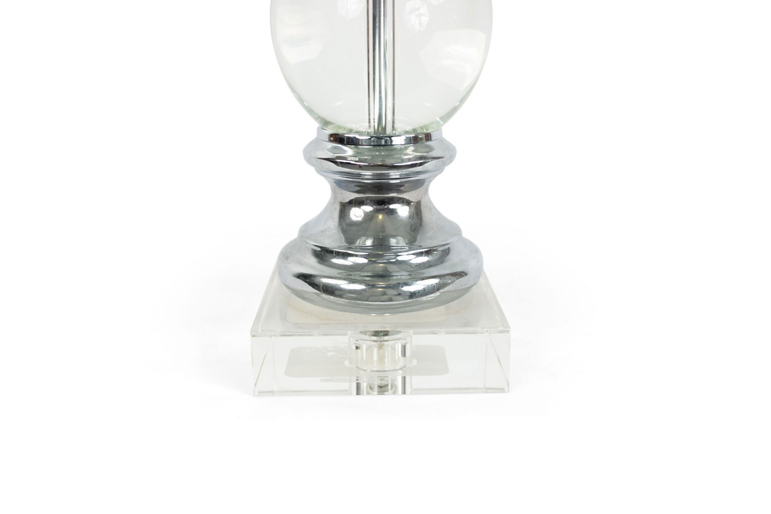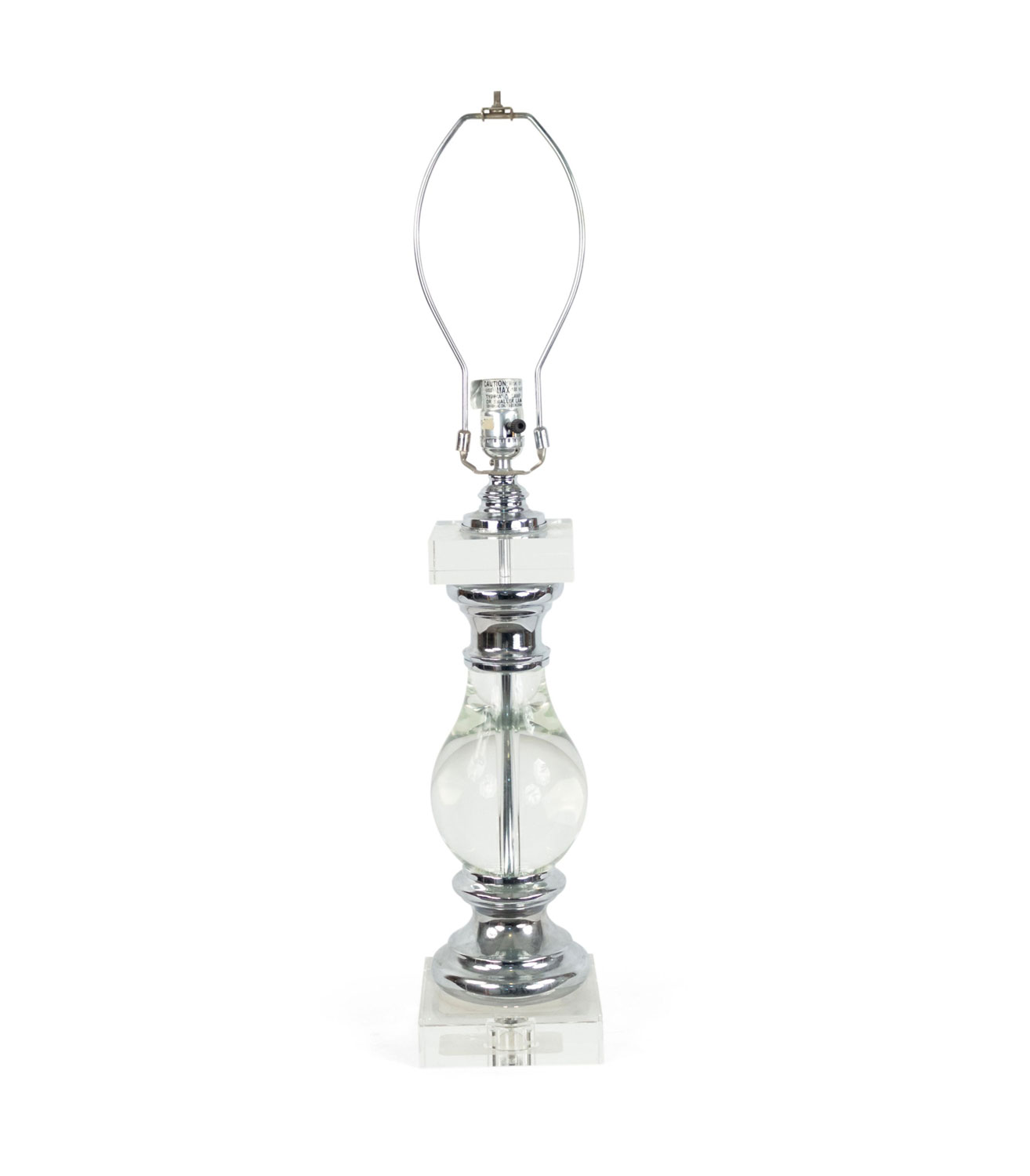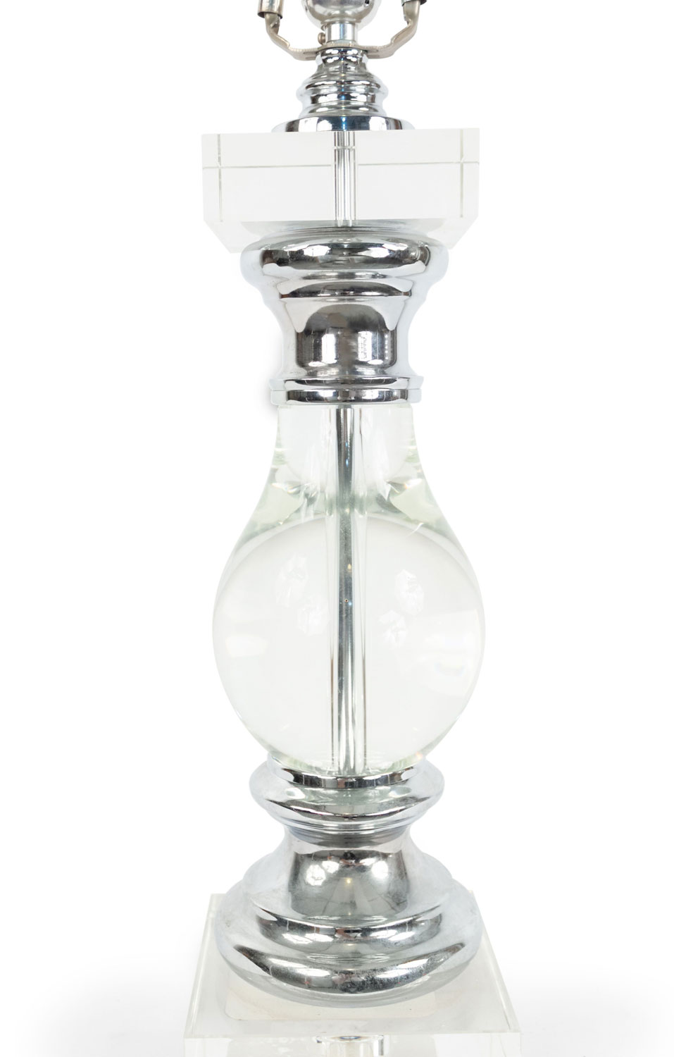 American Mid-Century Lucite and chrome trimmed table lamp with a shaped glass center and a square top and base..