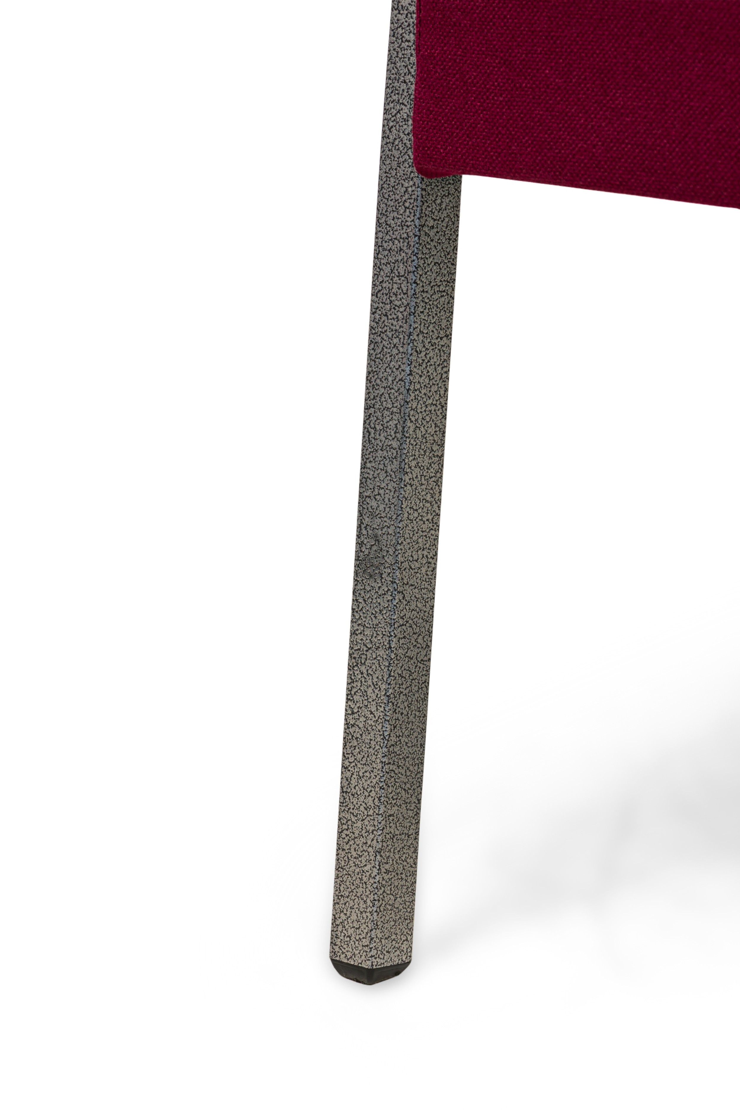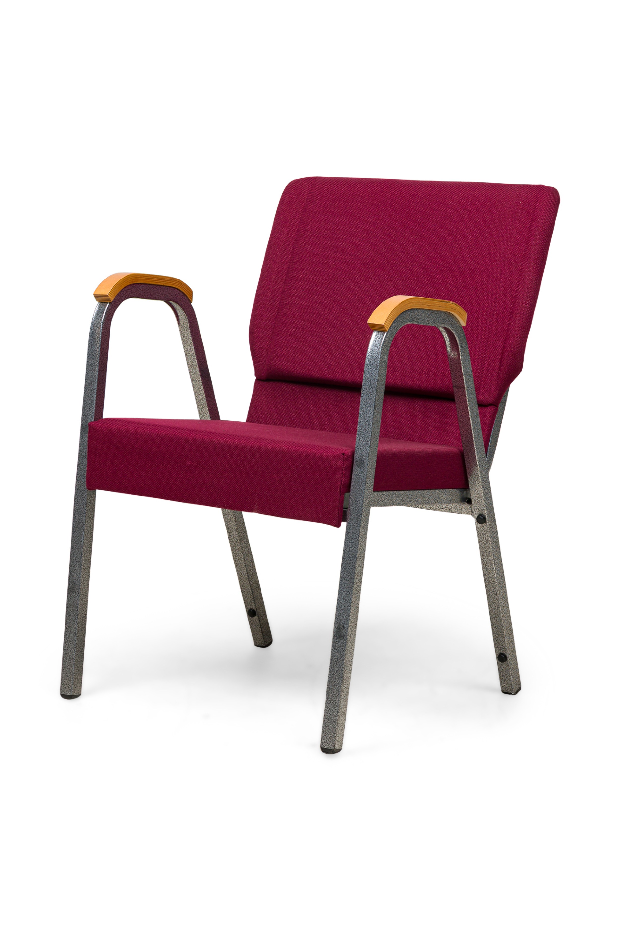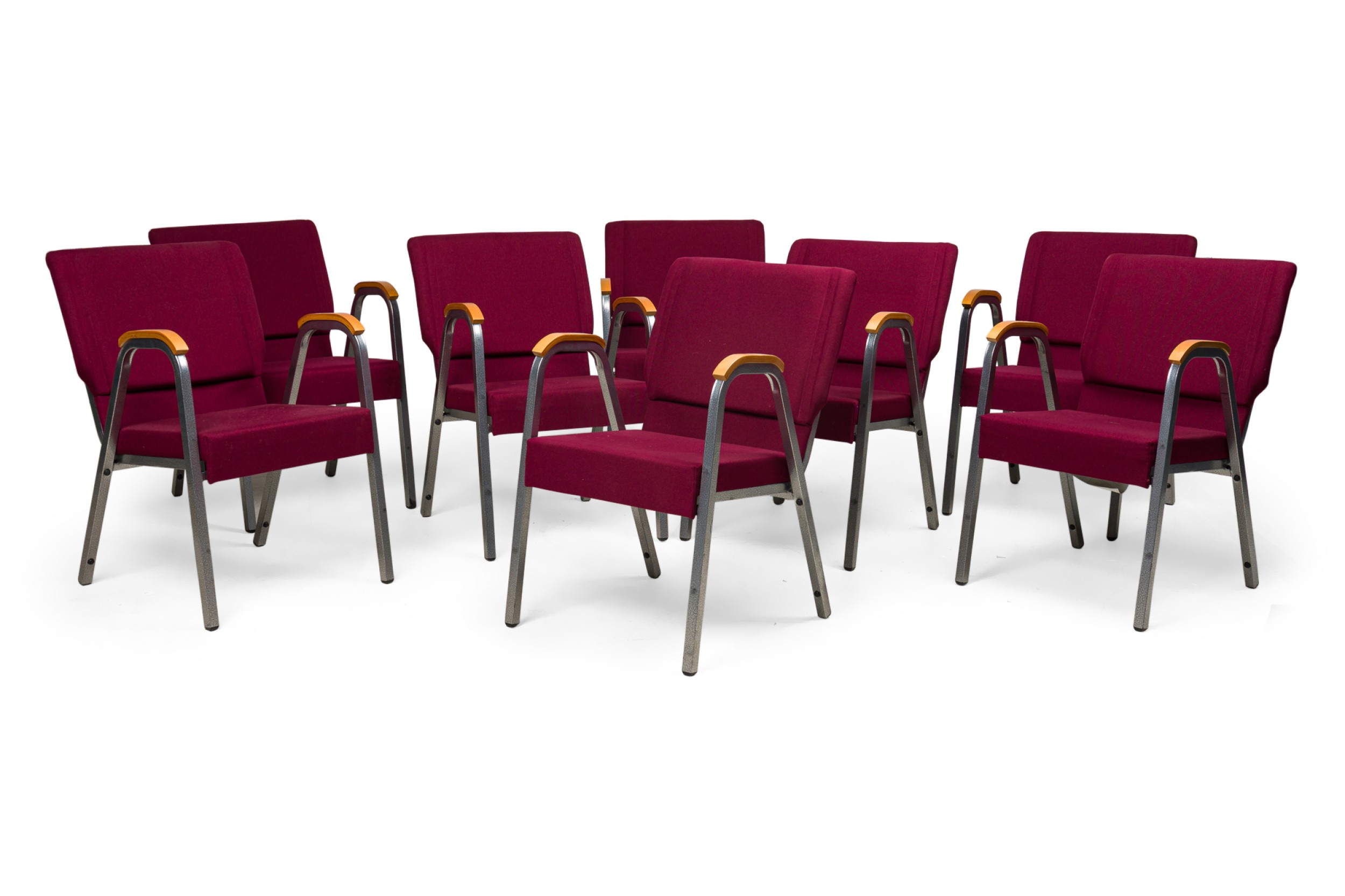 80 American Mid-Century burgundy fabric upholstered seat and back auditorium chairs with wooden armrests ending on U shaped steel stackable legs. (BELNICK LLC) (PRICED EACH).