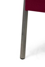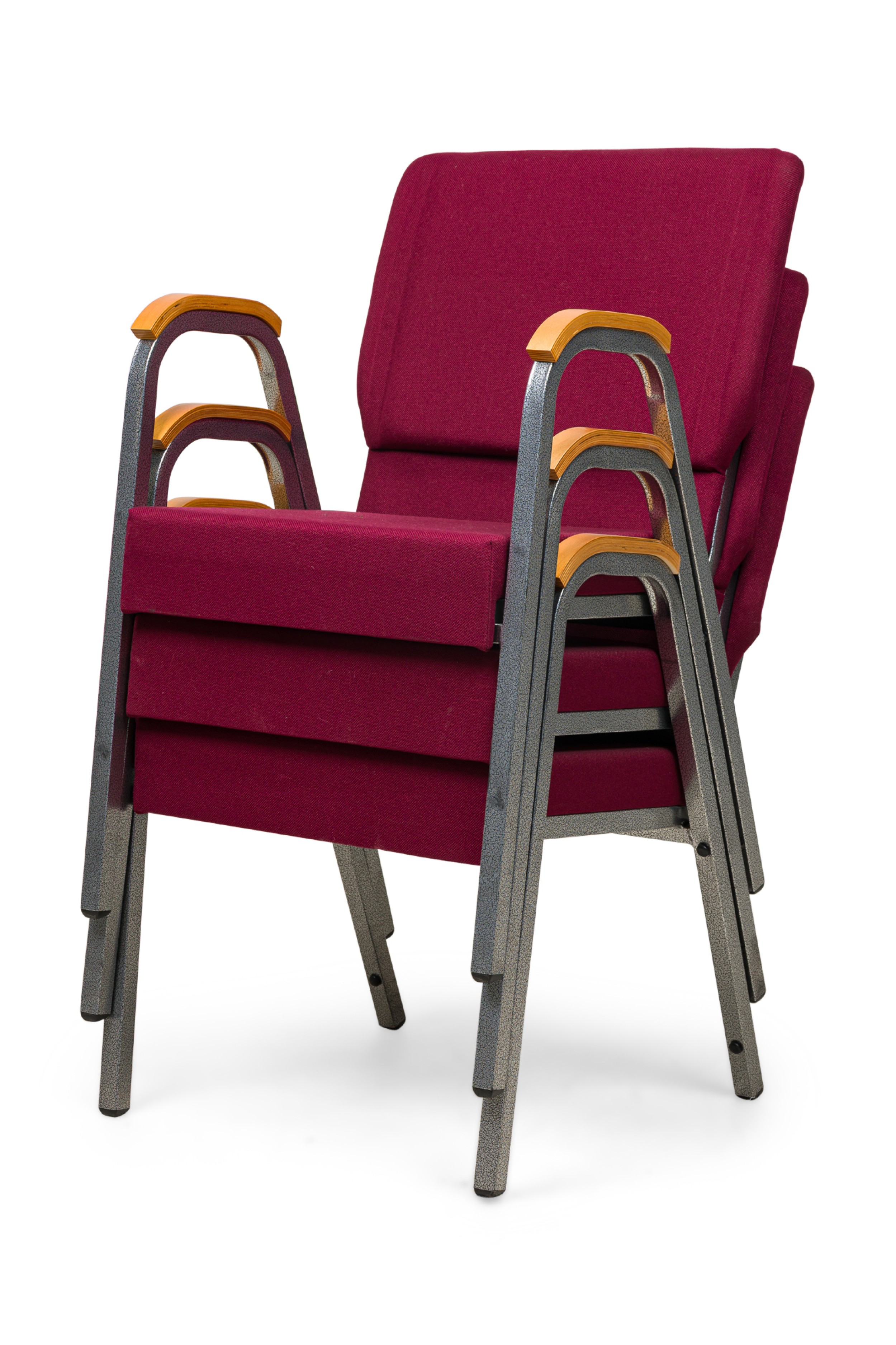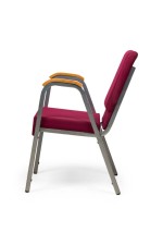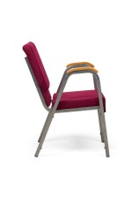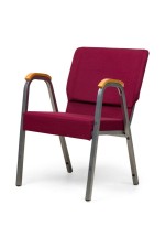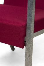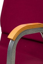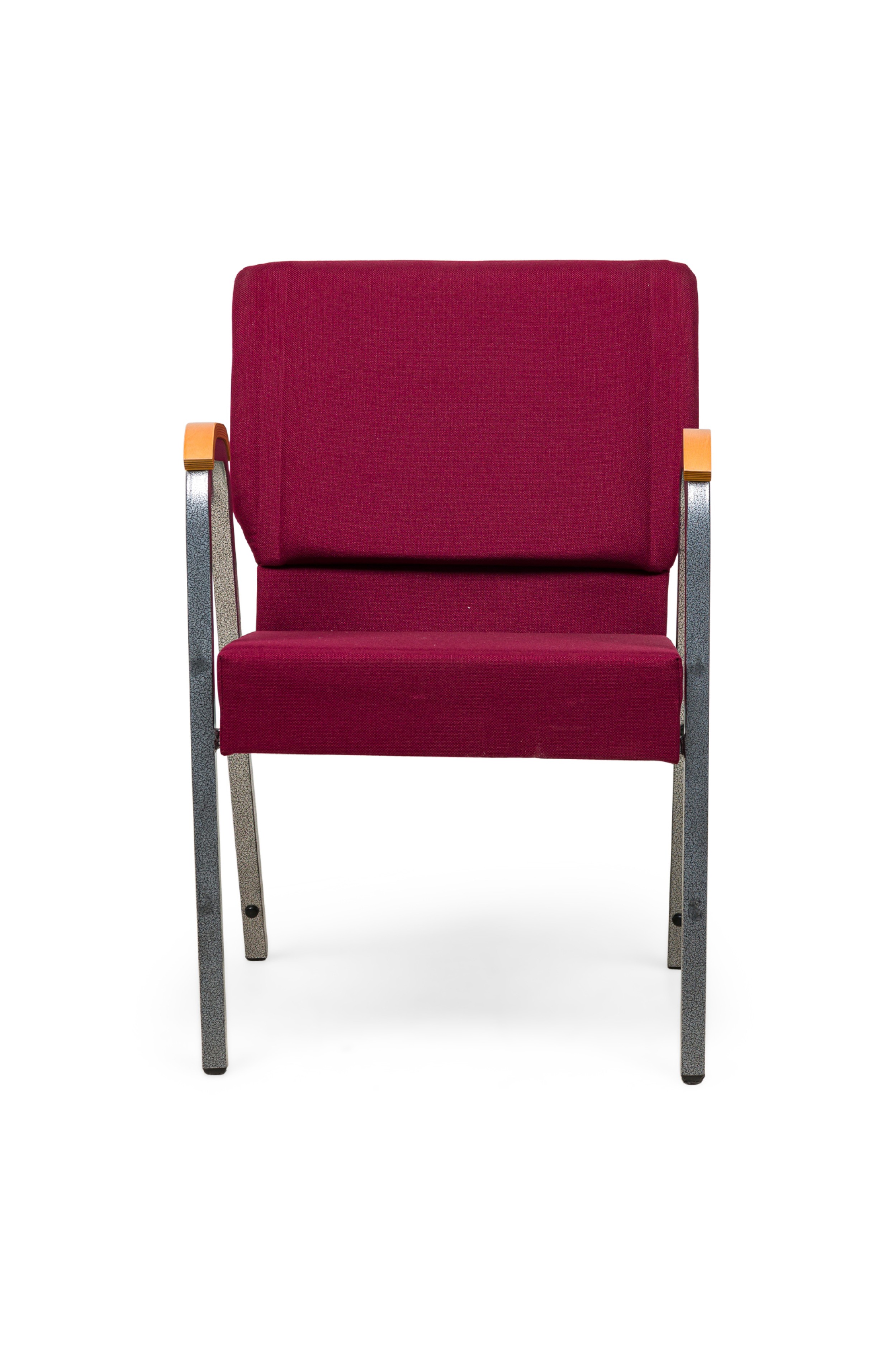 80 American Mid-Century burgundy fabric upholstered seat and back auditorium chairs with wooden armrests ending on U shaped steel stackable legs. (BELNICK LLC) (PRICED EACH)