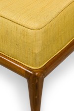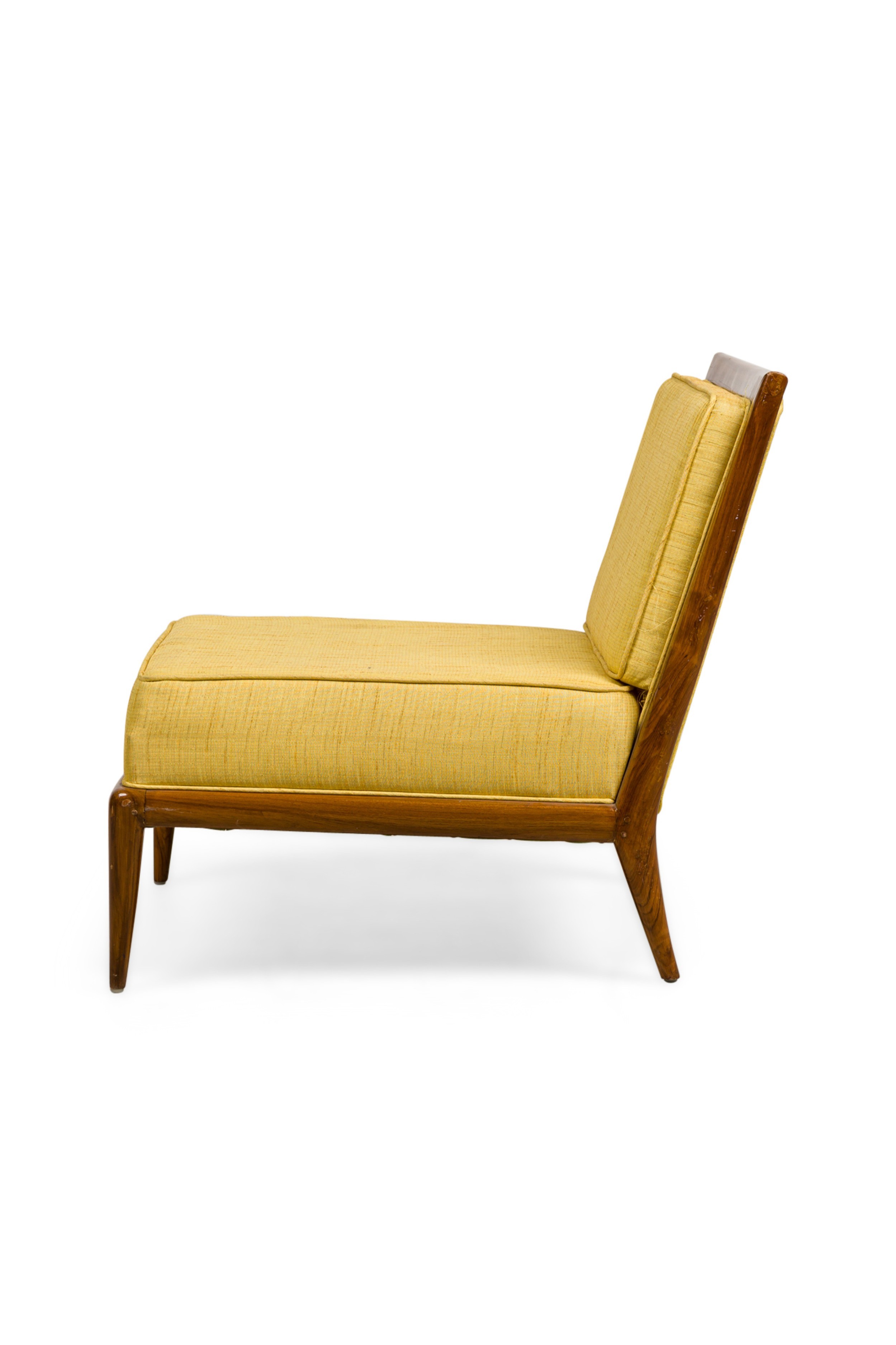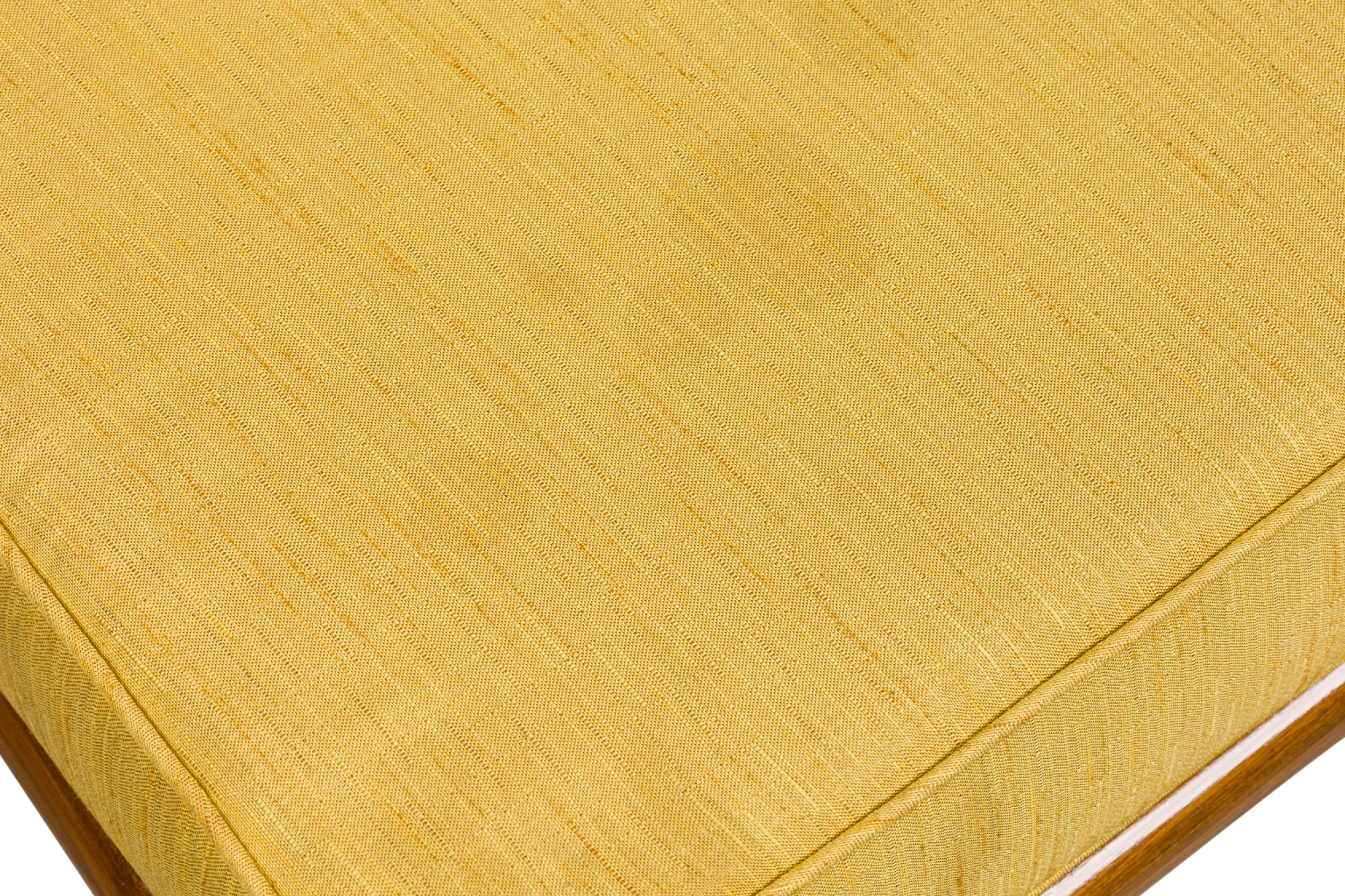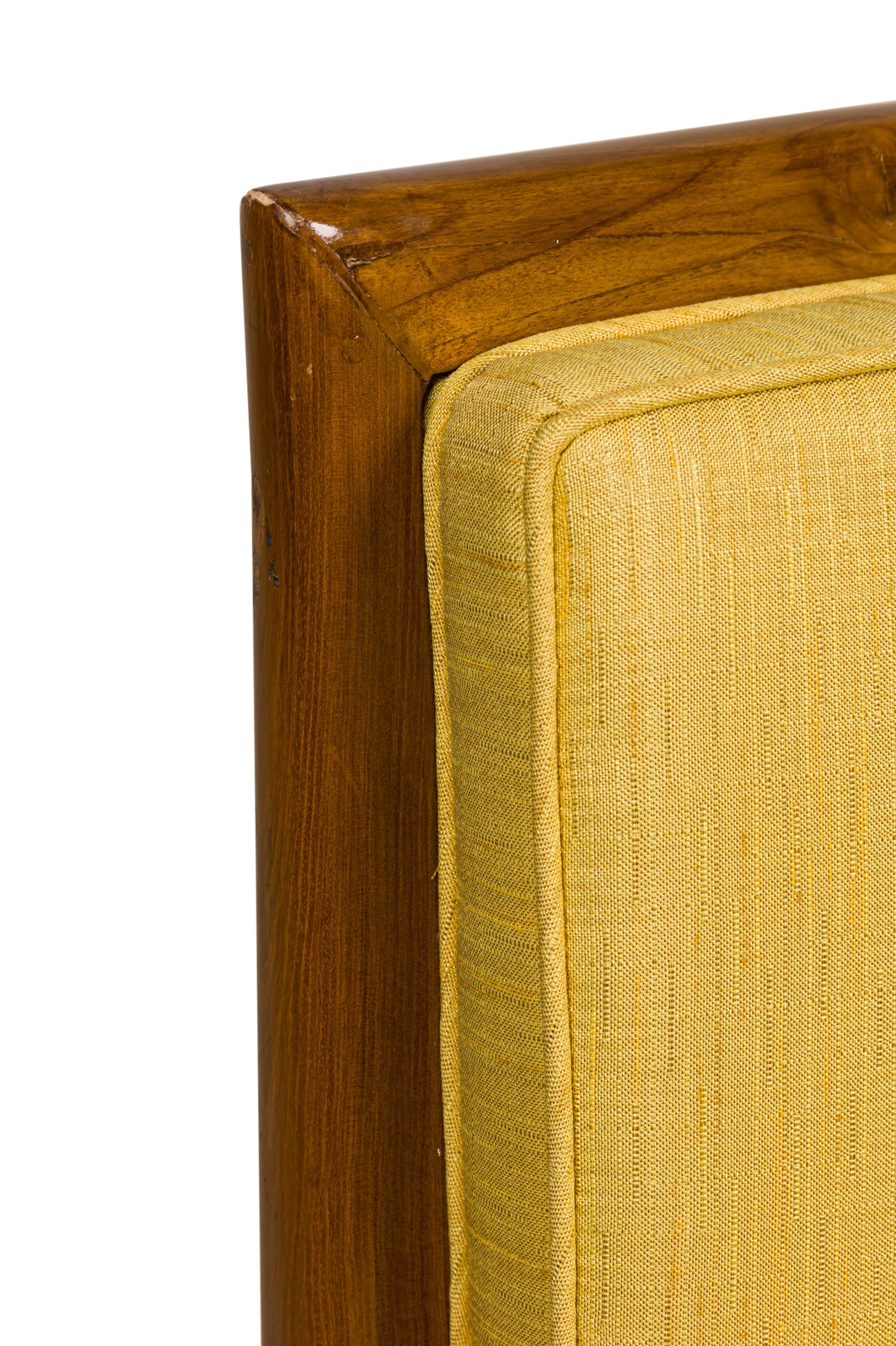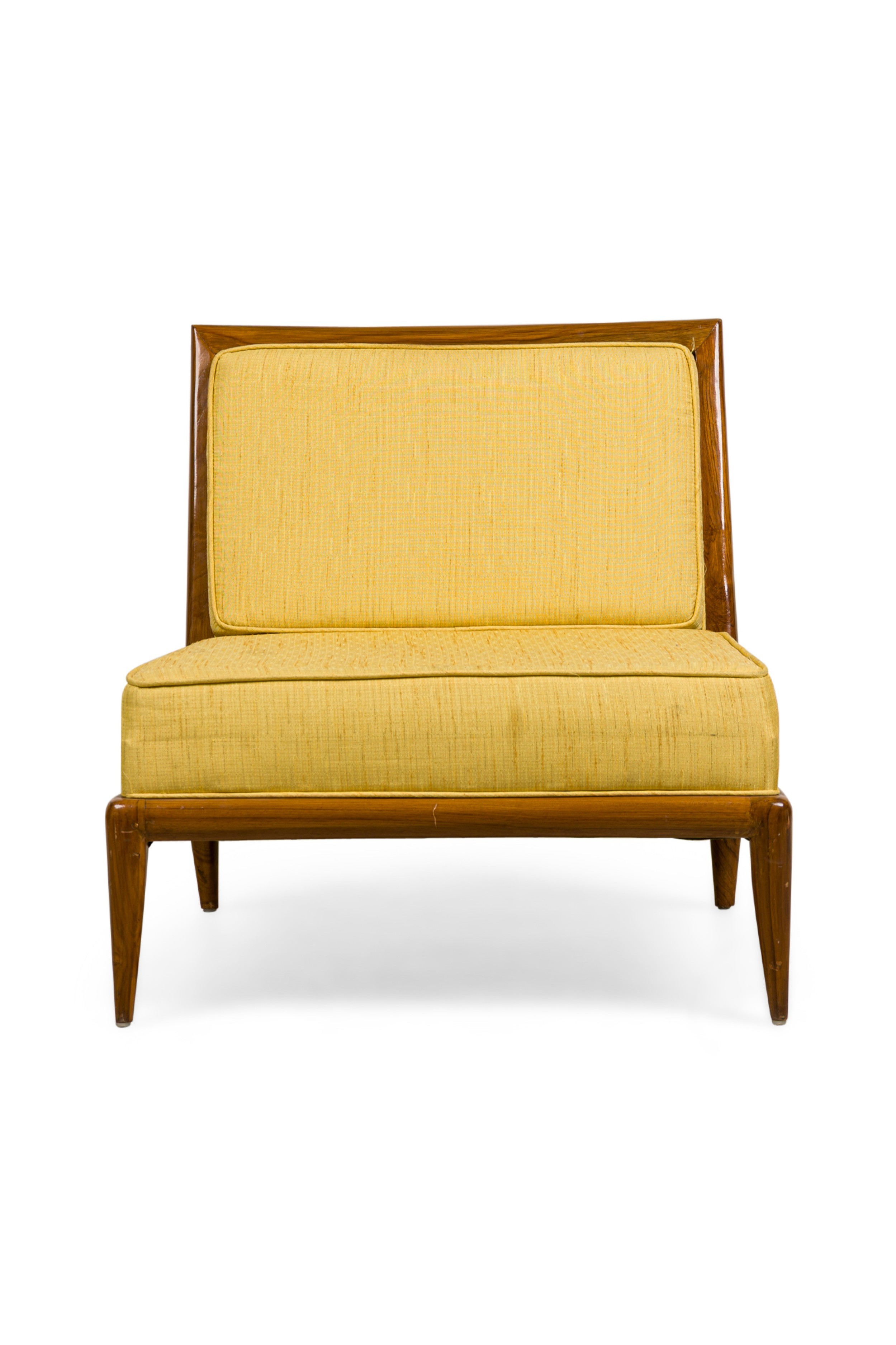 5 American Mid-Century square back yellow fabric upholstered lounge / side chairs with piping on the edges ending on tapered and splayed wooden legs. (matching: arm 064288B, 2 sofas 064288A)(PRICED EACH) (RETROWOOD FURNITURE)