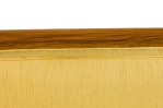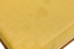 5 American Mid-Century square back yellow fabric upholstered lounge / side chairs with piping on the edges ending on tapered and splayed wooden legs. (matching: arm 064288B, 2 sofas 064288A)(PRICED EACH) (RETROWOOD FURNITURE).