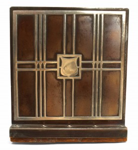 American Mission bronze expanding bookends with silver deposit geometric design (Heintz Art Metal).