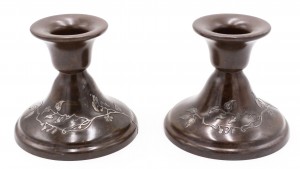 PAIR of American Mission bronze (brown patina) candlesticks with silver deposit floral design (Heintz Art Metal) (PRICED AS PAIR)..