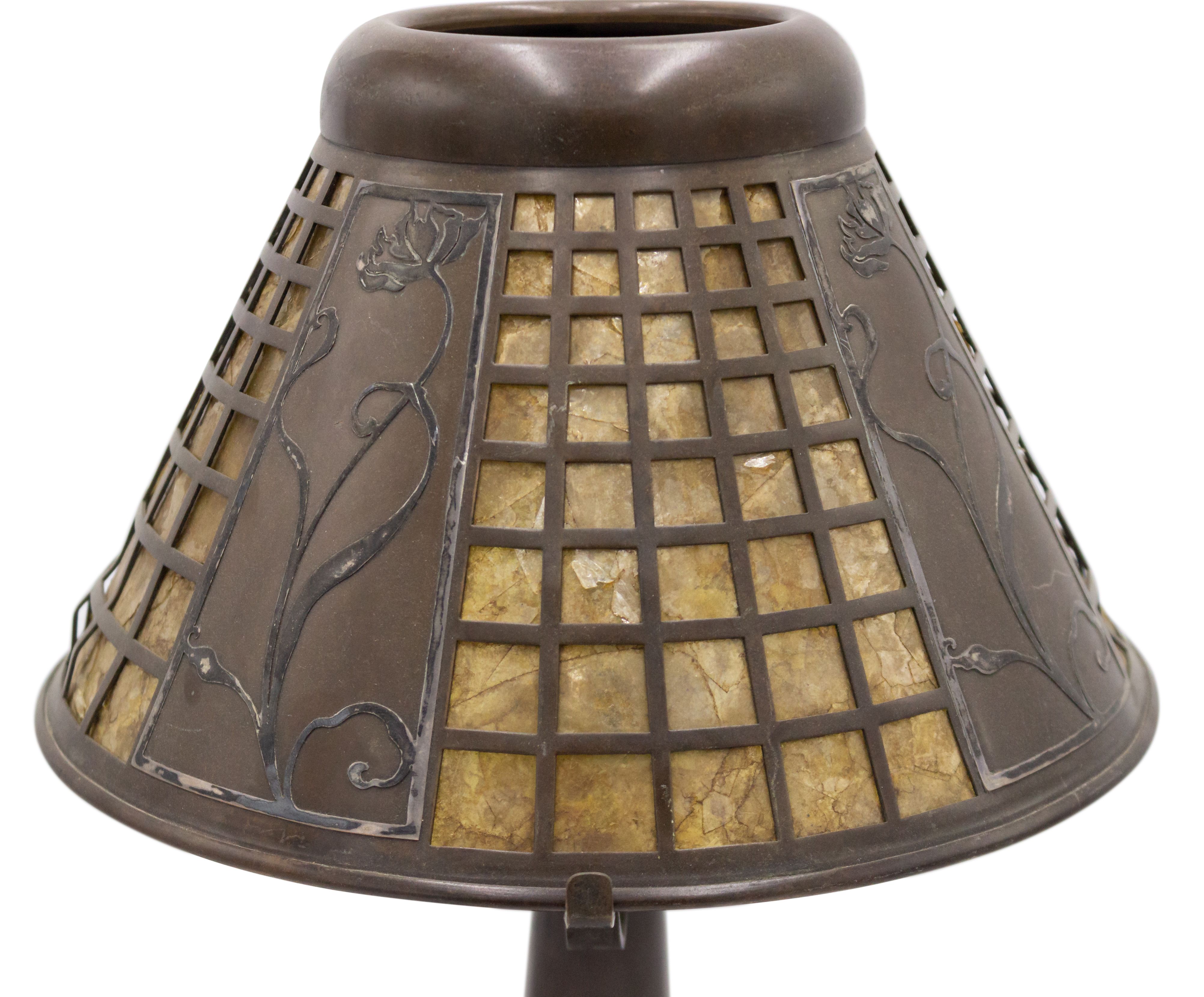 American Mission brown patinated bronze table lamp with silver deposit floral design base and mica panel shade with geometric filigree (HEINTZ ART METAL).