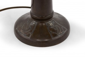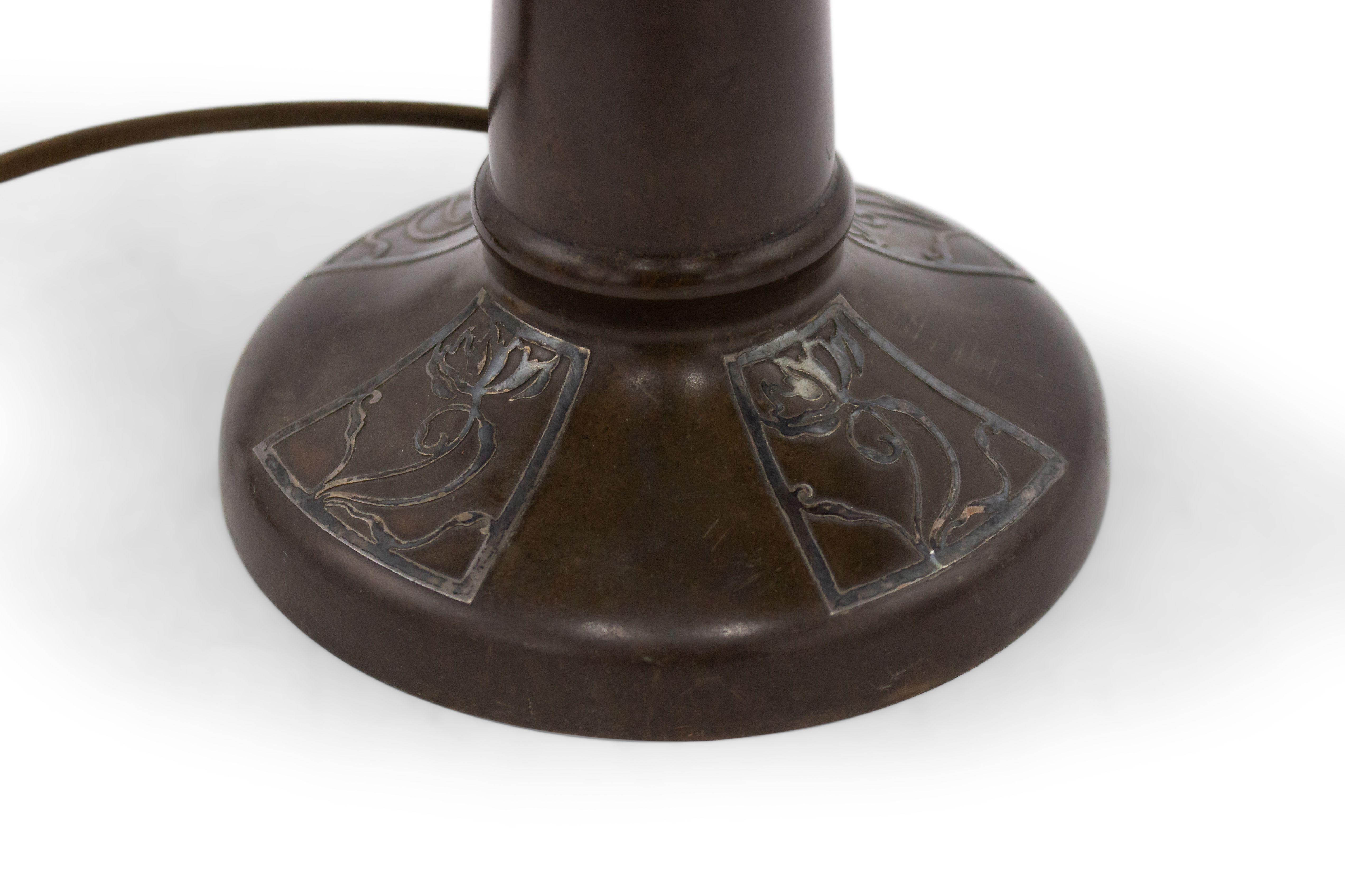 American Mission brown patinated bronze table lamp with silver deposit floral design base and mica panel shade with geometric filigree (HEINTZ ART METAL)