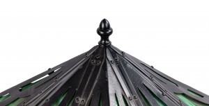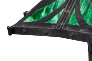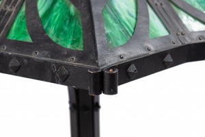 American Mission black iron table lamp having a 6 sided shade with green slag glass cut out design supported on 6 scrolls and trimmed with metal studs.