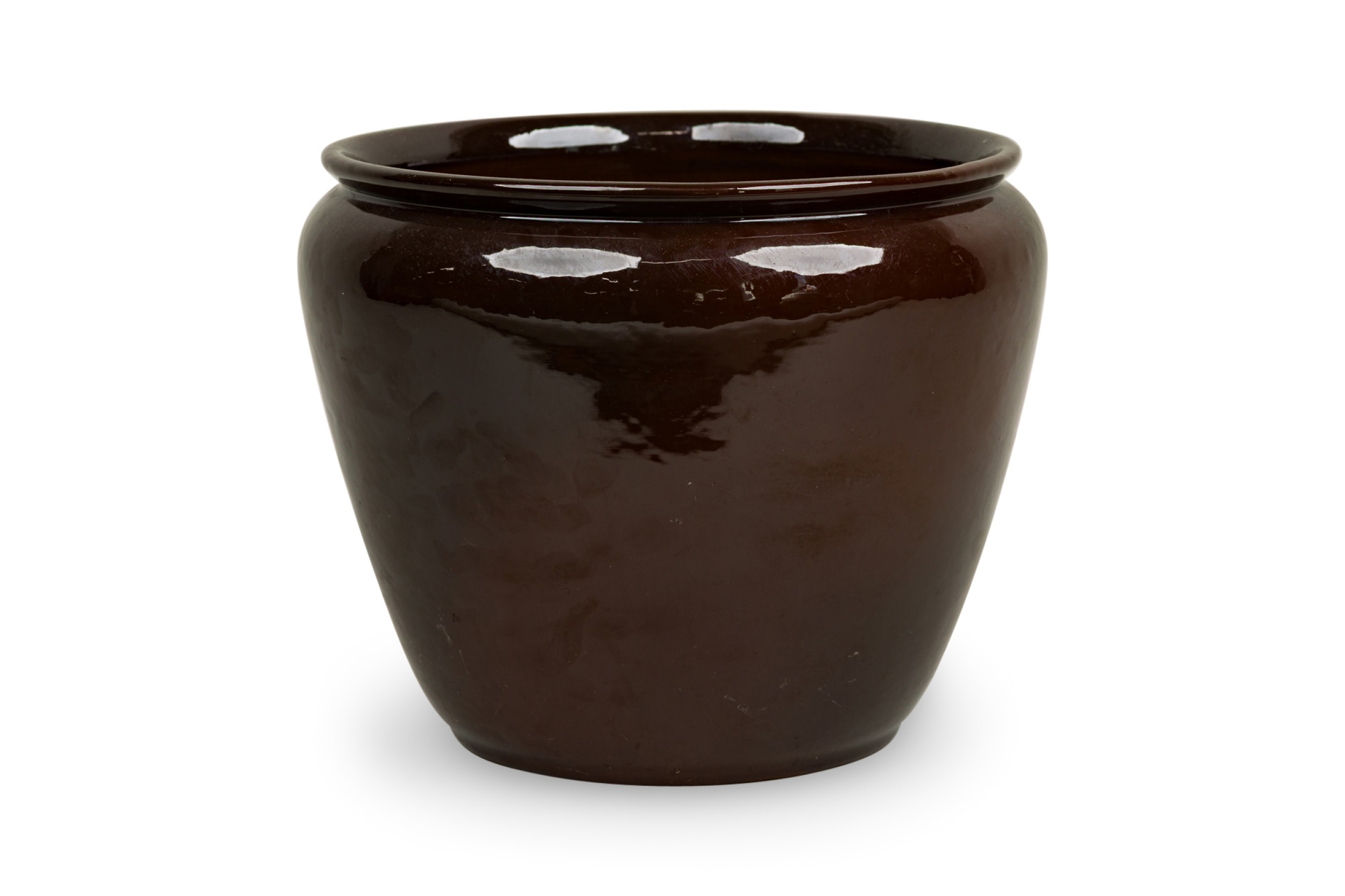 American Mission glazed brown porcelain jardiniere with hand painted monochromatic floral detail (WELLER POTTERY).