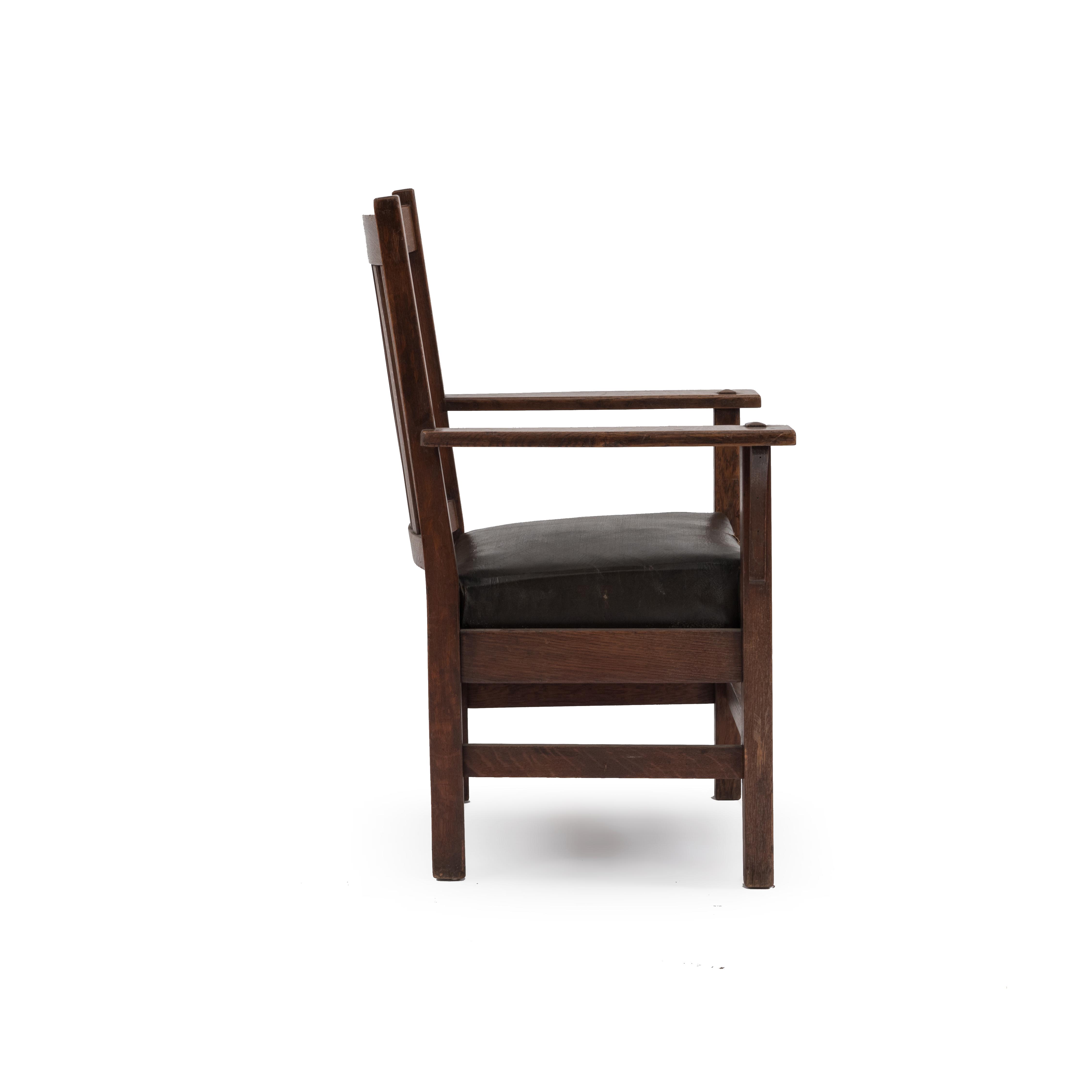 American Mission oak arm chair with 6 slats on back and brown leather seat..
