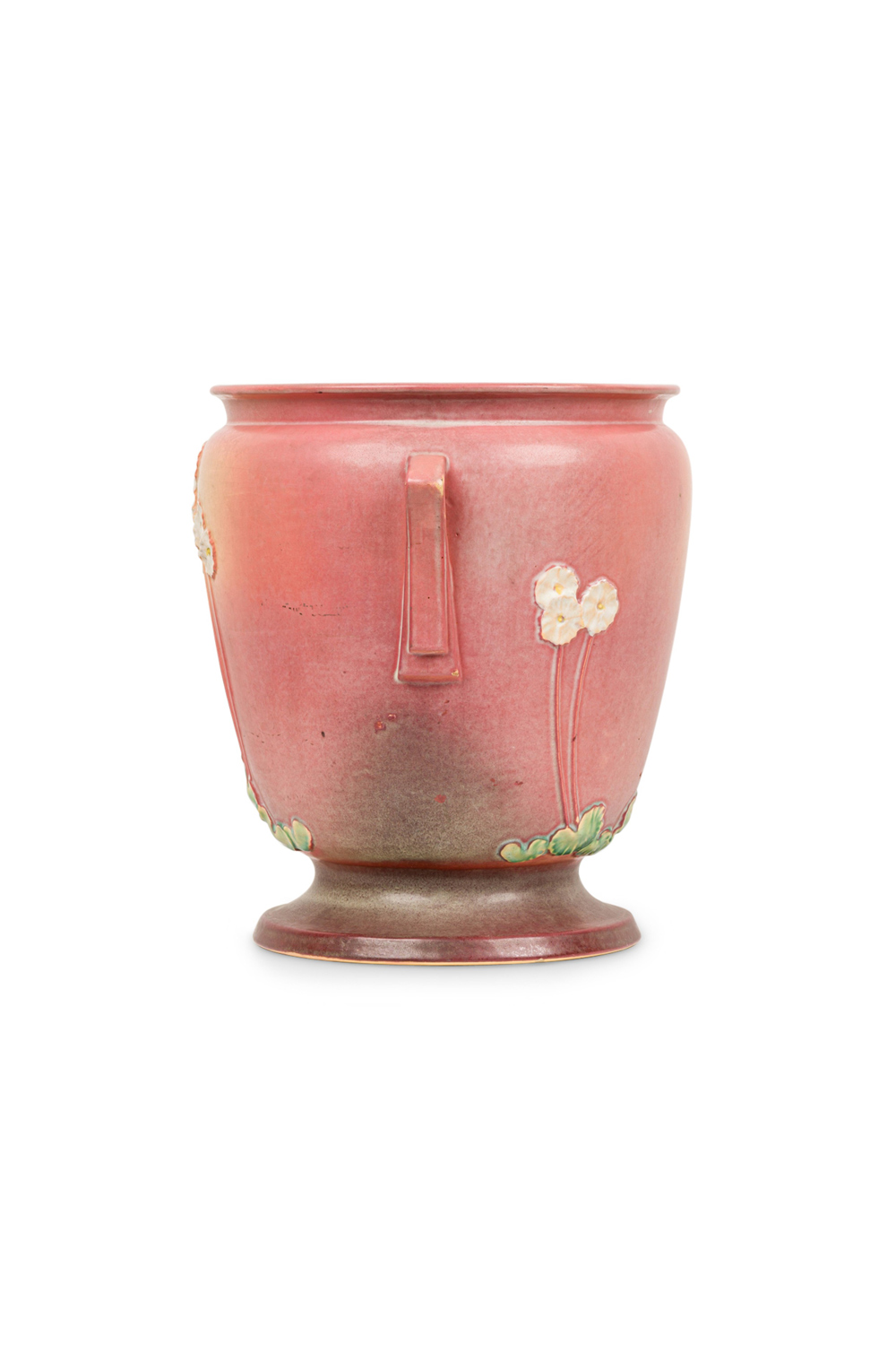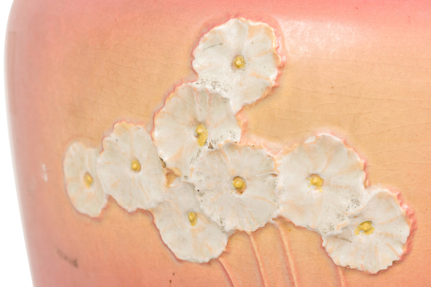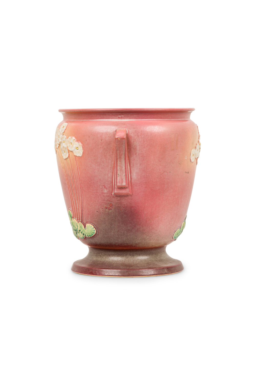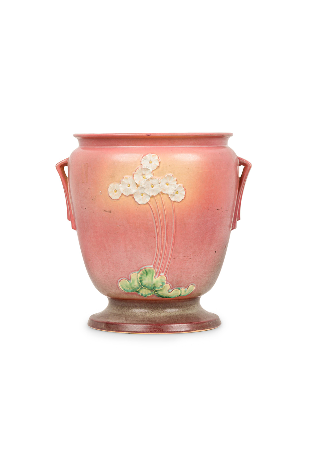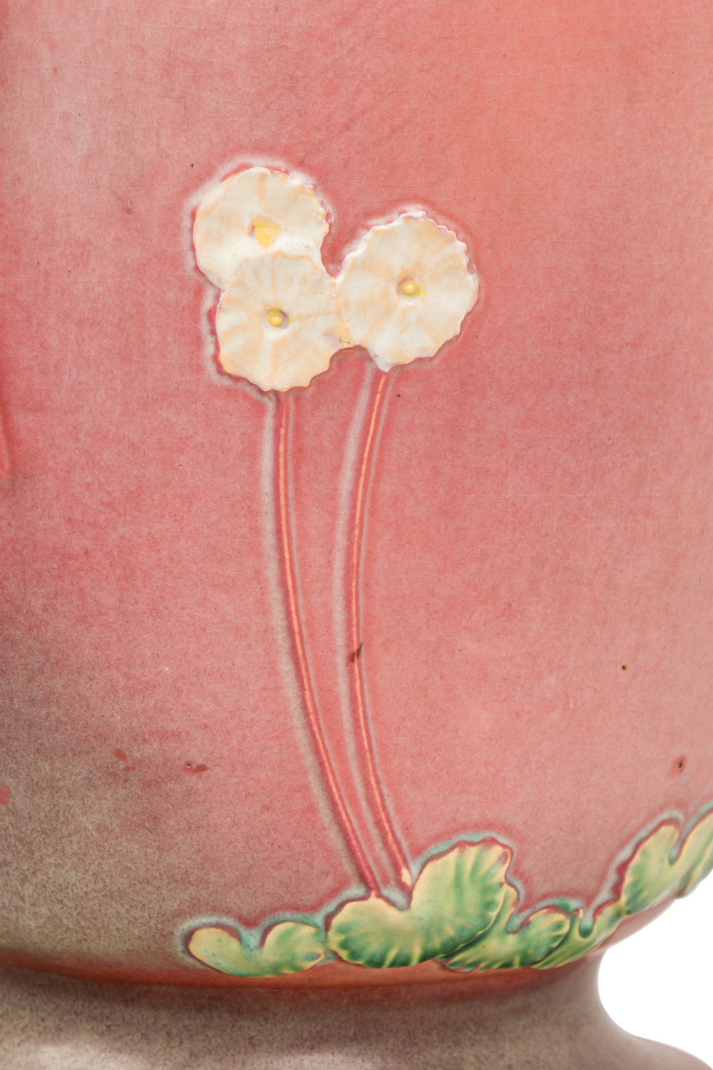 American Mission Roseville porcelain jardiniere with pink and white floral design.