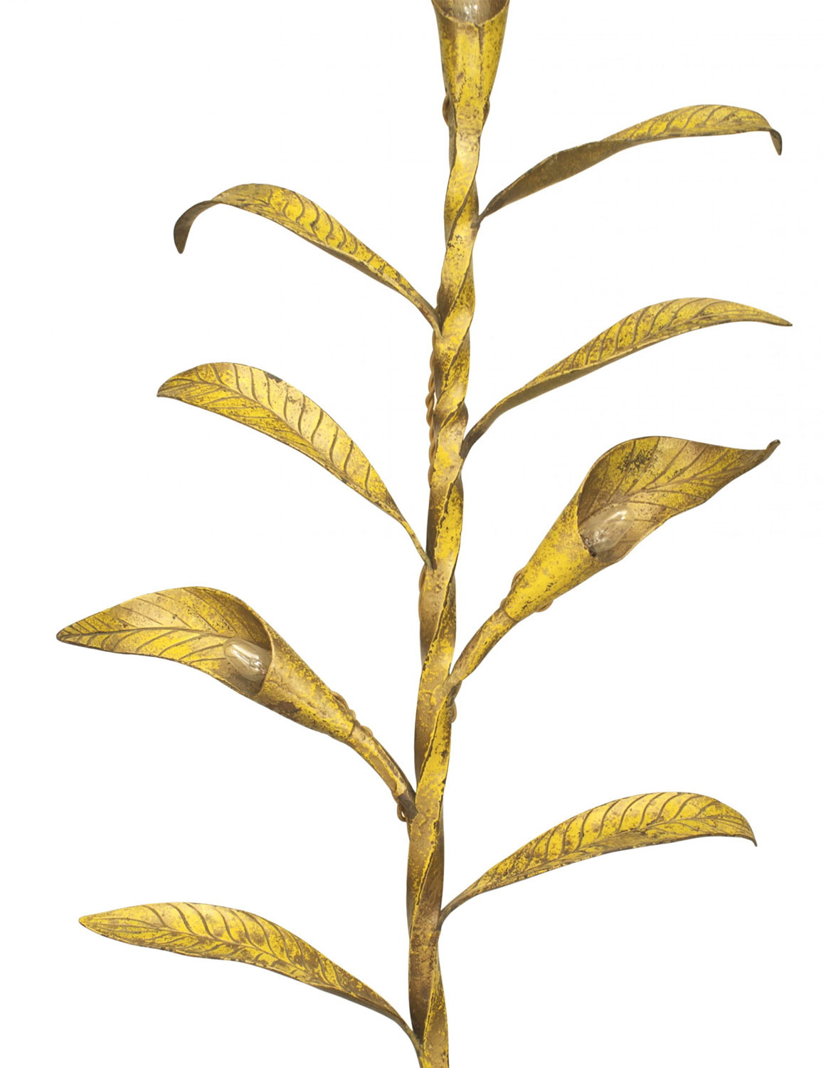 American Rustic Country style (circa 1920s) yellow painted metal floor lamp with 11 leaves having 3 lights emanating from a twisted iron frame resting on a 3 leg base.
